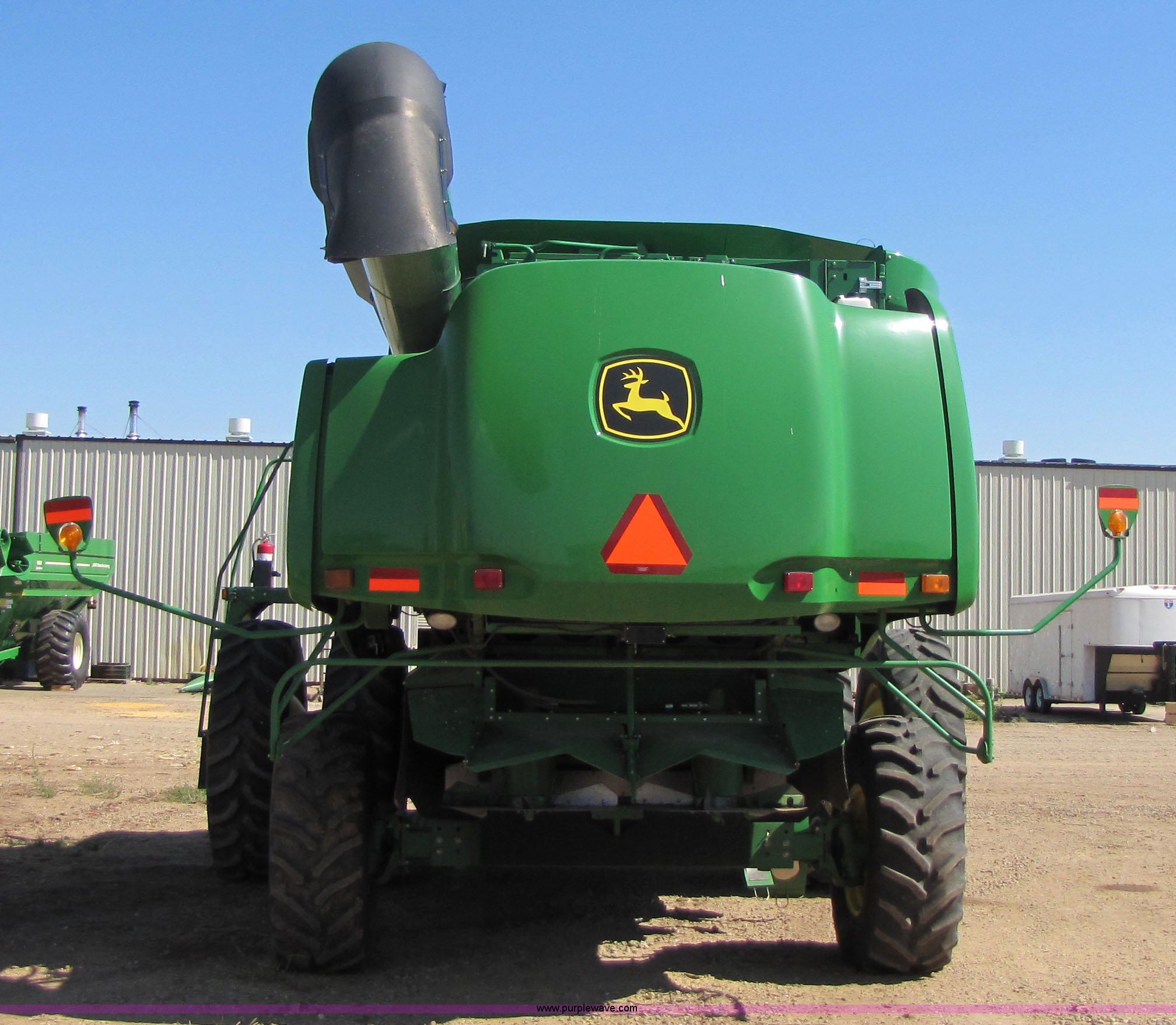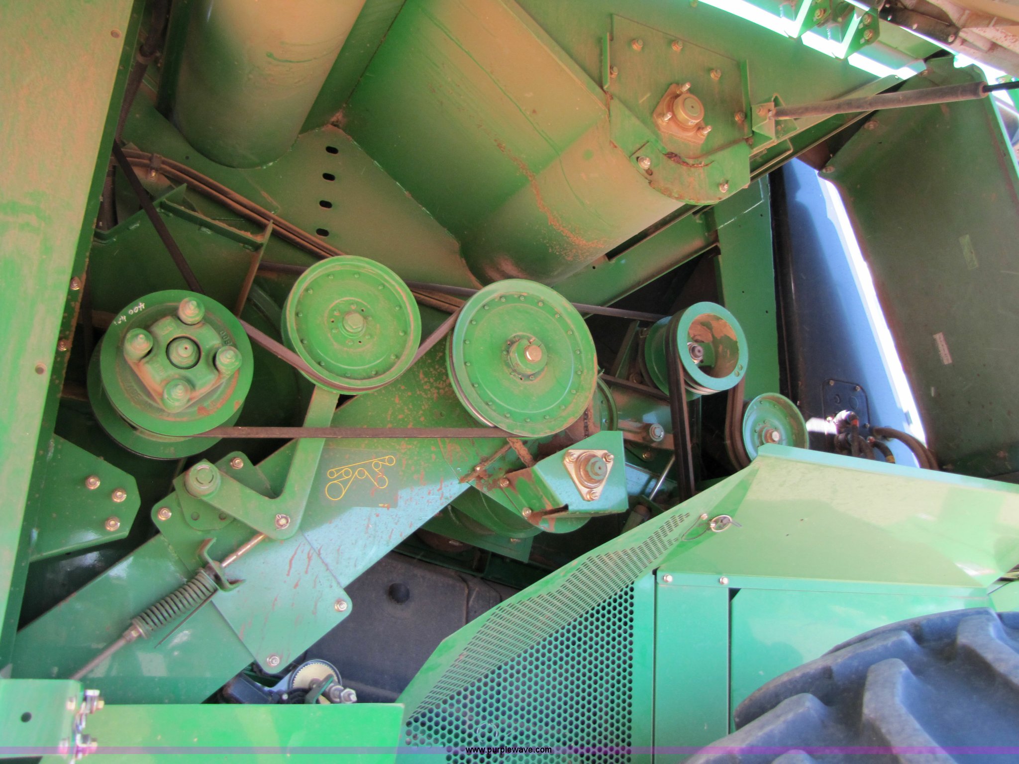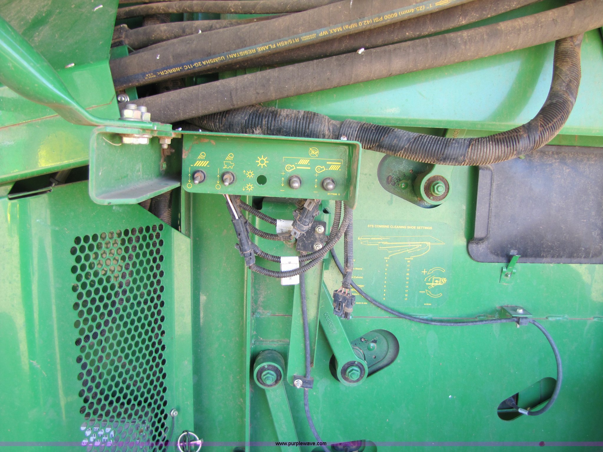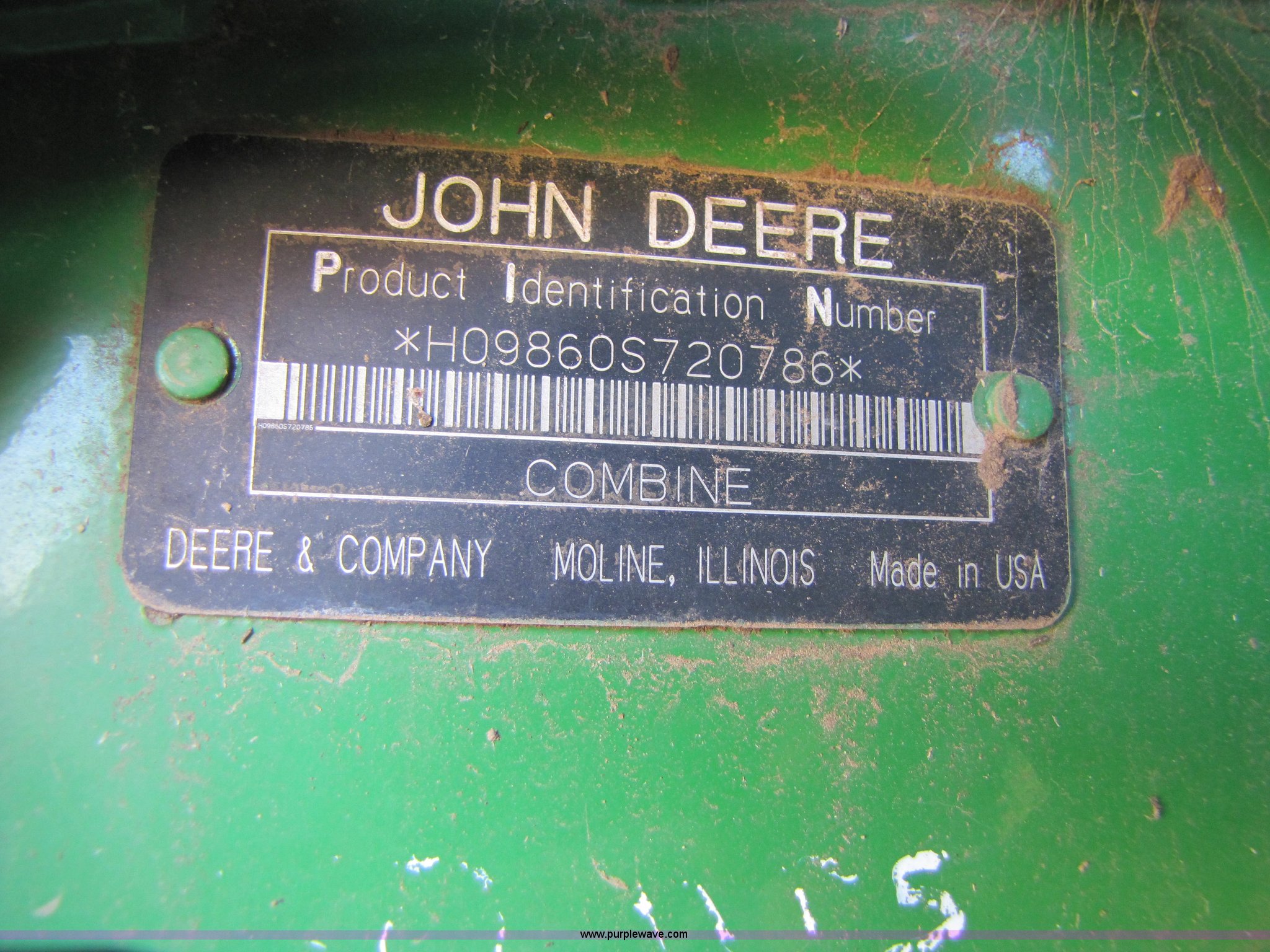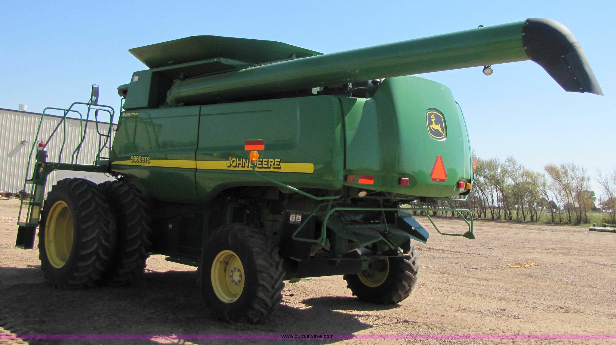 Purple Wave is selling a used Combine in Texas. This item is a 2007 John Deere 9860 STS combine with the following: 1566 engine hours on meter, 1145 separator hours on meter, John Deere six cylinder 12.5L 375hp turbocharged diesel engine, Three speed hydrostatic transmission, 350 bushel grain capacity with extension, Straw spreader, Quick Tach header coupler, Suspension seat, Instructor seat, Joystick speed/draper controls, AM/FM radio, AC and heat, Greenstar enabled, Work lights, 520/85R42 front dual tires, 18.4R26 rear tires, 250 gallon fuel tank, Serial H09860S720786, Stock# 13408
