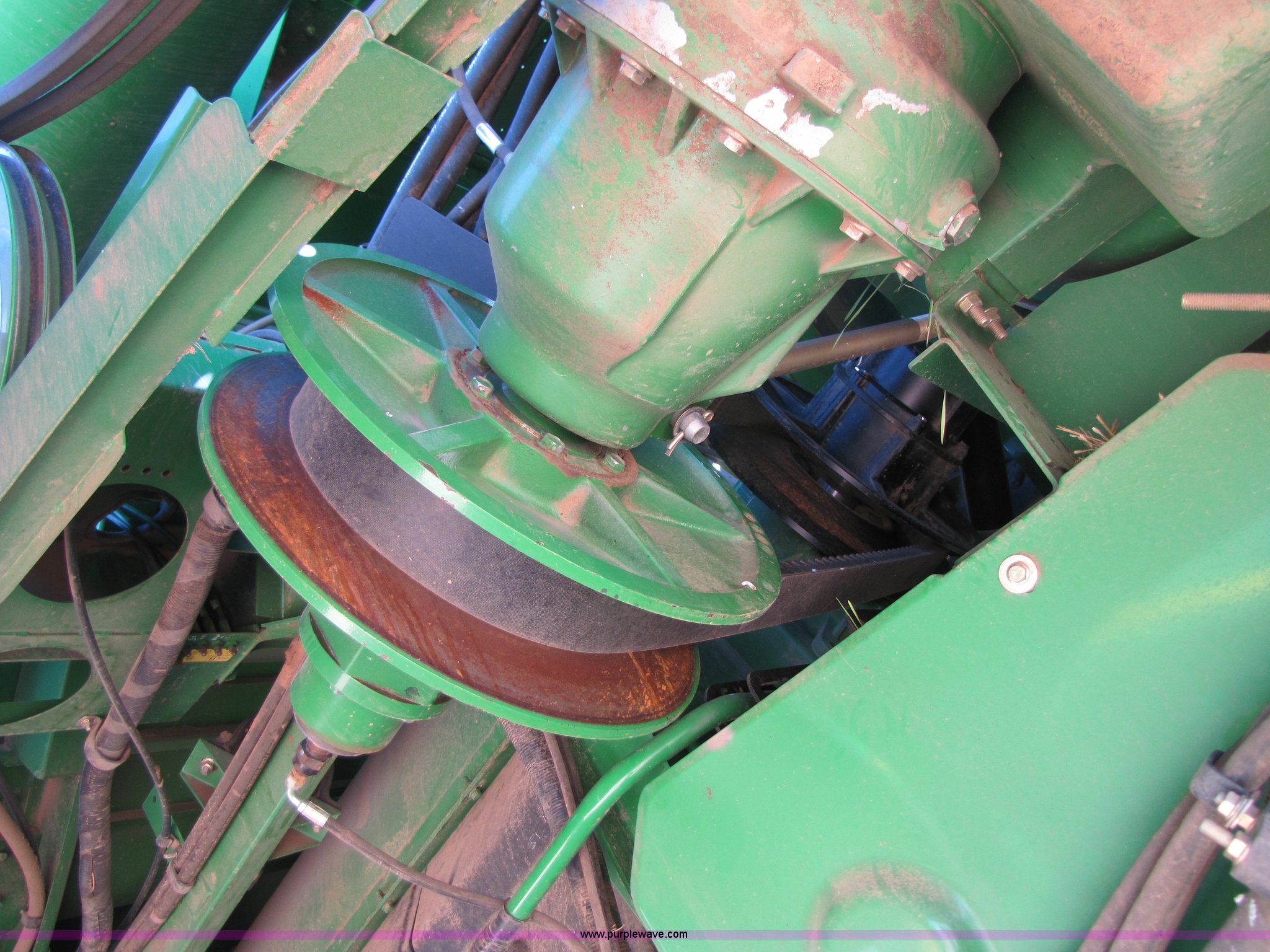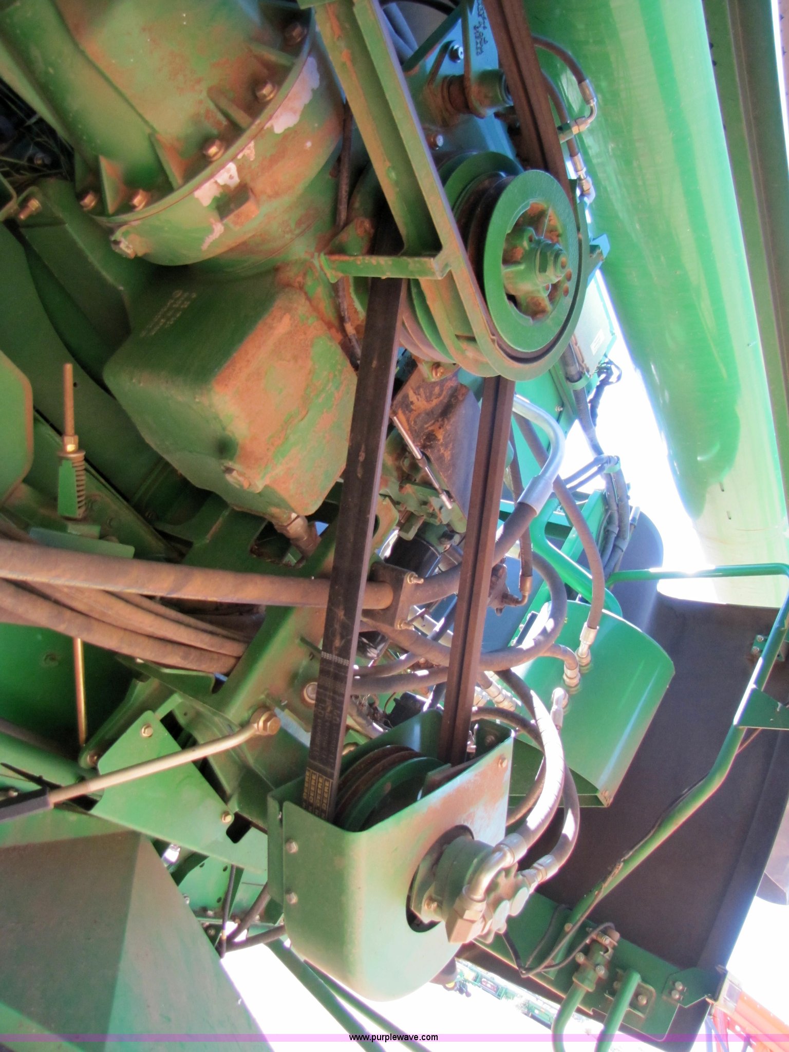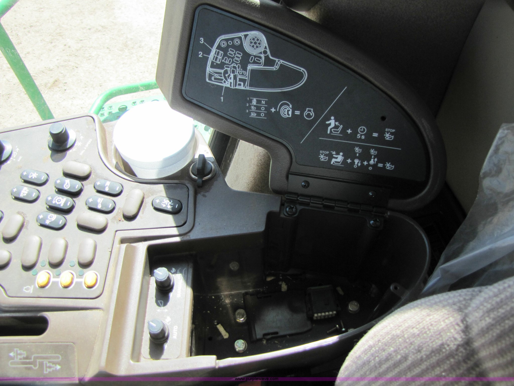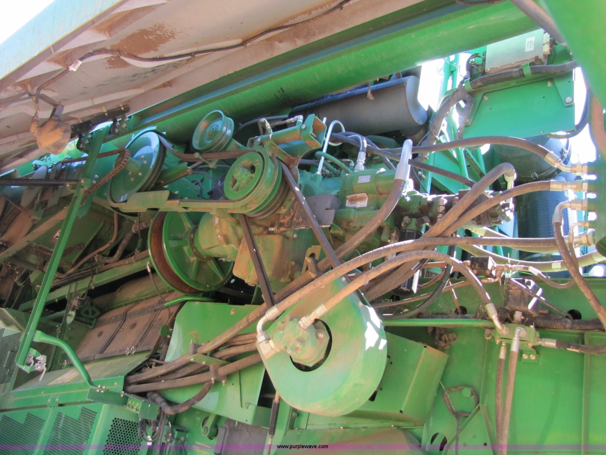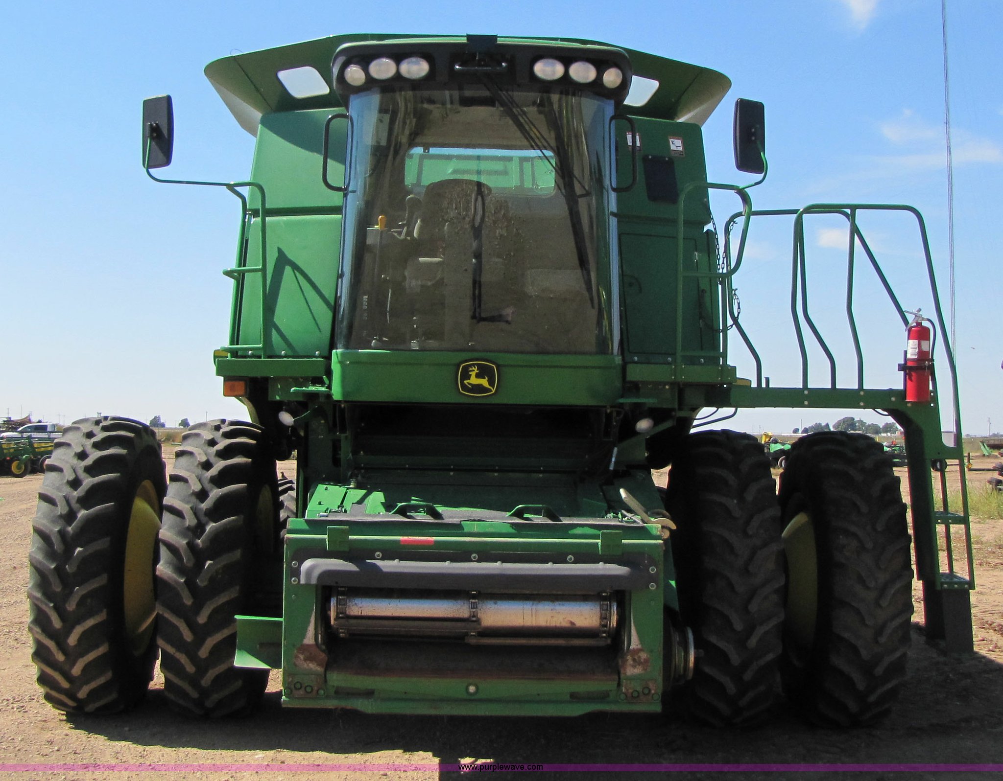 Purple Wave is selling a used Combine in Texas. This item is a 2007 John Deere 9860 STS combine with the following: 1566 engine hours on meter, 1145 separator hours on meter, John Deere six cylinder 12.5L 375hp turbocharged diesel engine, Three speed hydrostatic transmission, 350 bushel grain capacity with extension, Straw spreader, Quick Tach header coupler, Suspension seat, Instructor seat, Joystick speed/draper controls, AM/FM radio, AC and heat, Greenstar enabled, Work lights, 520/85R42 front dual tires, 18.4R26 rear tires, 250 gallon fuel tank, Serial H09860S720786, Stock# 13408