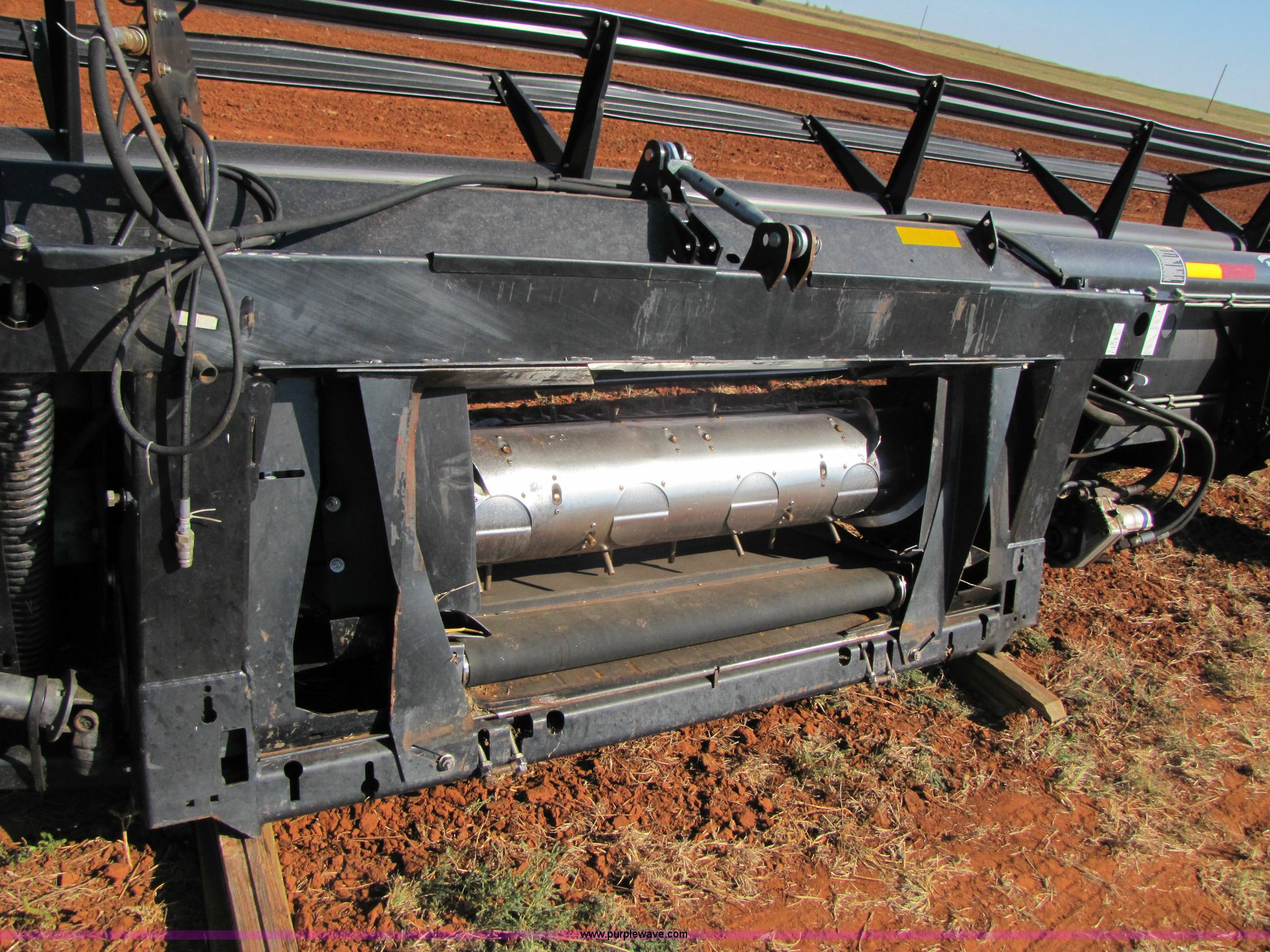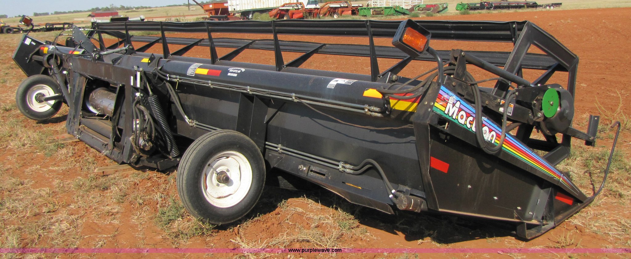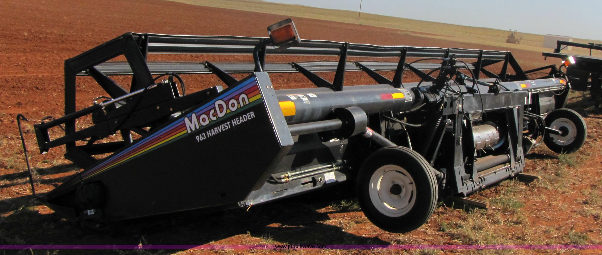 Purple Wave is selling a used Platform or Stripper Head in Oklahoma. This item is a 2004 Mac Don 963 draper head with the following: 30', Bat reel, Hydraulic reel height, 6.70-15 tires, Gauge wheels, Set up for Case IH combine, Serial 159427