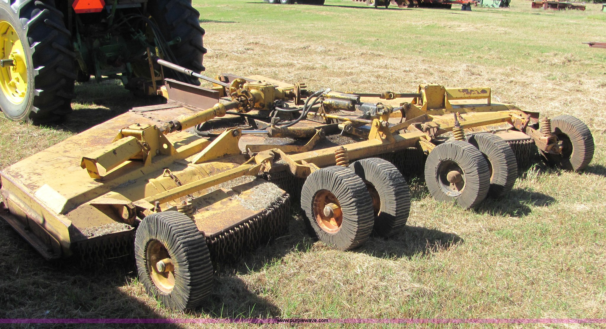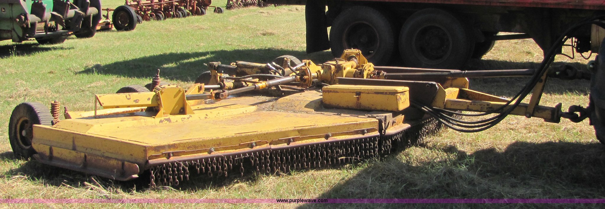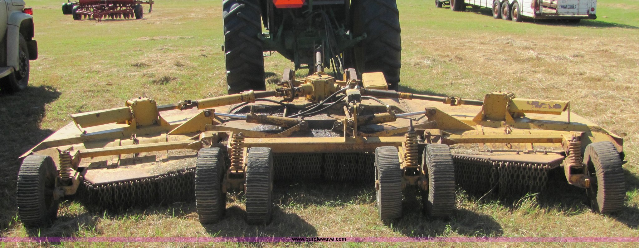 Purple Wave is selling a used Mower, Cutter, Shredder in Oklahoma. This item is a Woods 15' batwing mower with the following: Dual rear wheels on center deck, Chain guards on front and rear, Pintle hitch included, John Deere hydraulic cylinder included, All gear boxes functional, Mower is still in service, Serial 47-7035