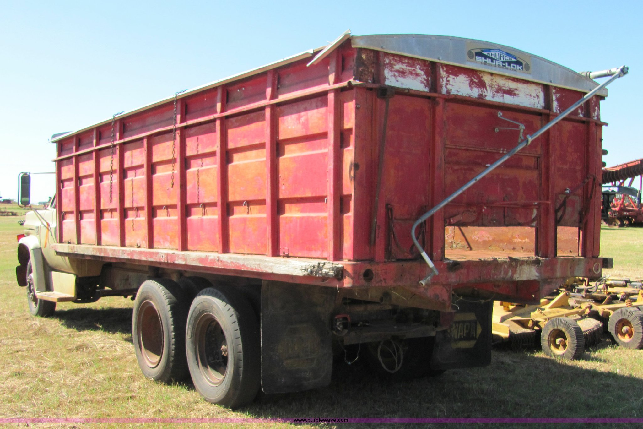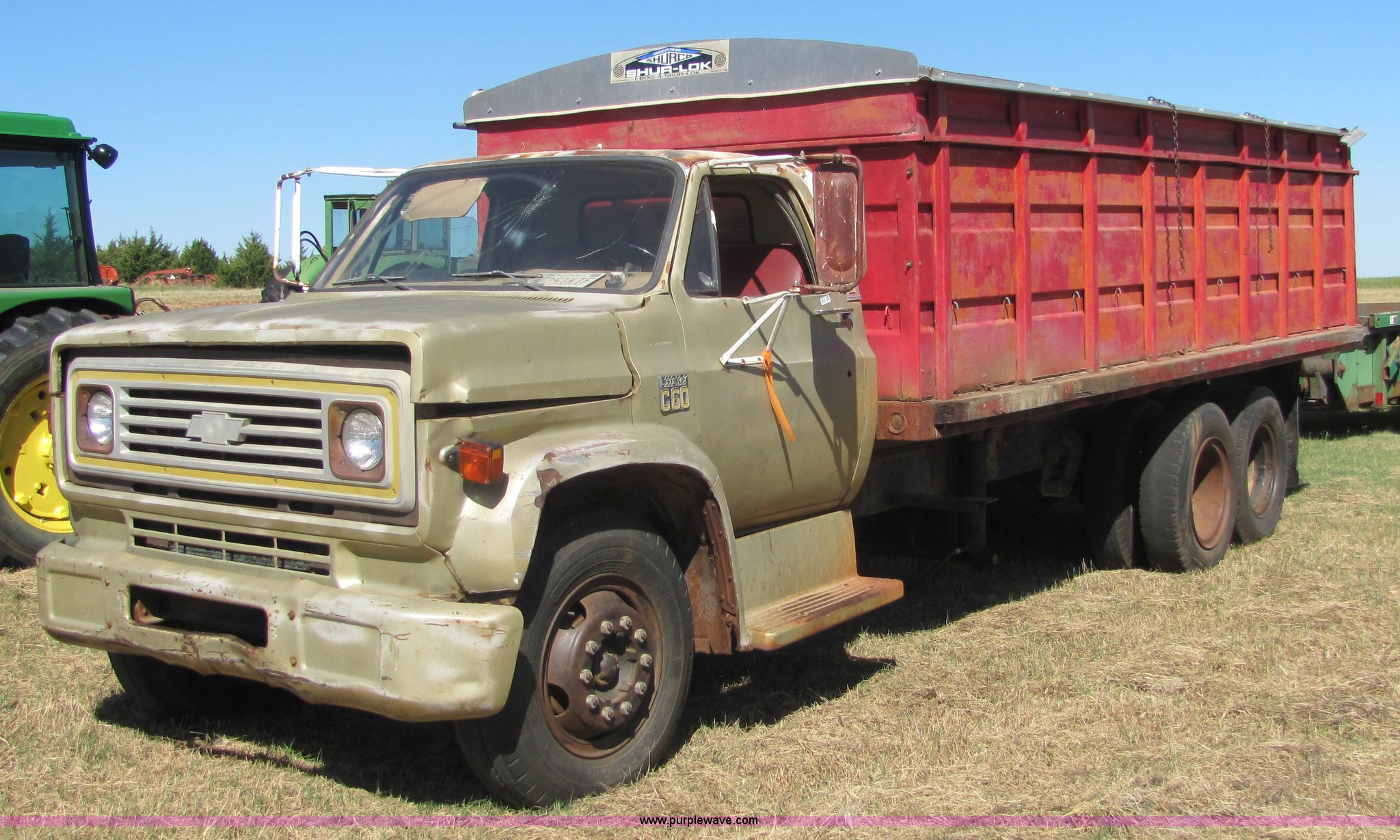 Purple Wave is selling a used Grain Truck in Oklahoma. This item is a 1973 Chevrolet C60 grain truck with the following: V8 big block gas engine, Five speed manual transmission with two speed rear end, Dual tandem axles, 20' bed with hoist, Dual three stage lift cylinders, Steel floor, Shur-lok rollover trap, 10.00R20 tires