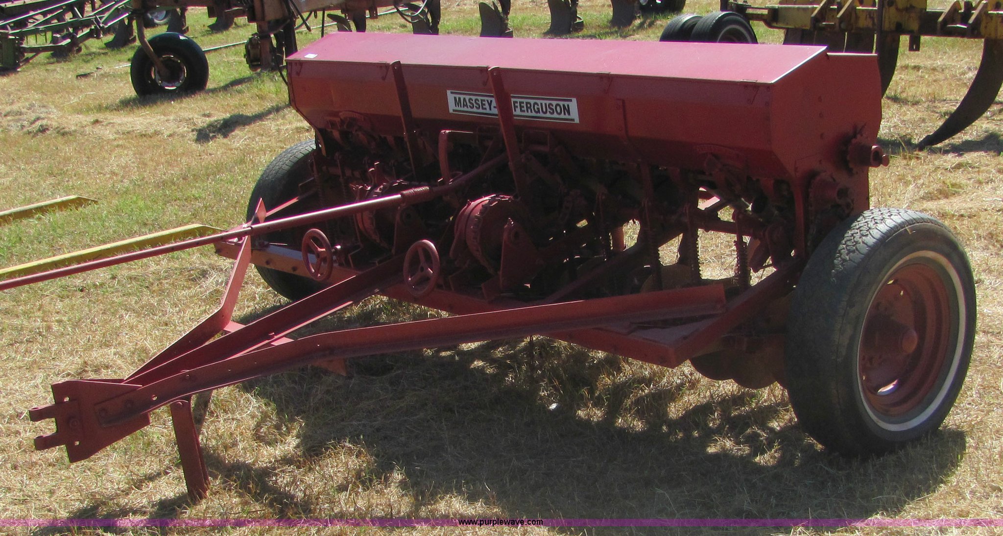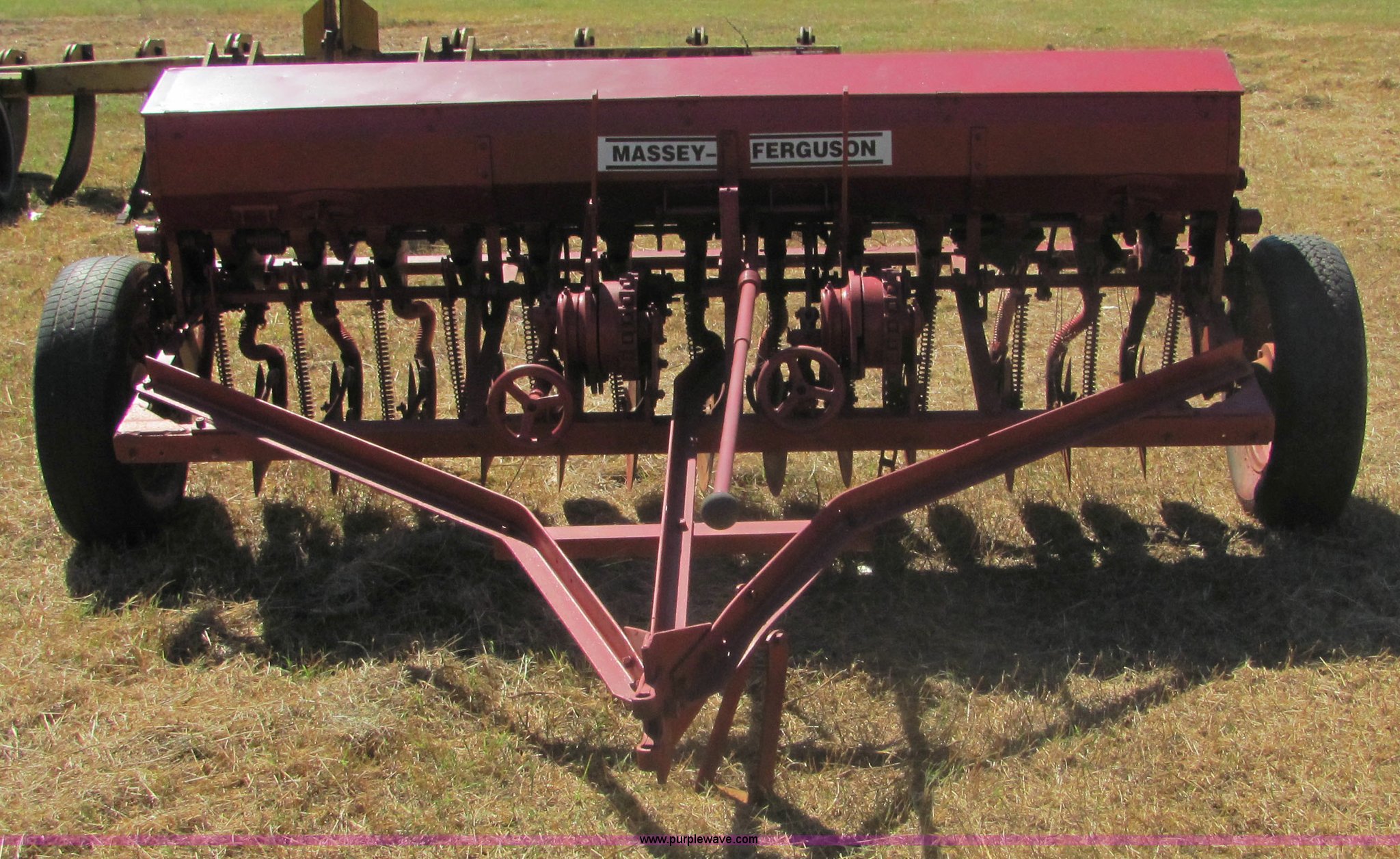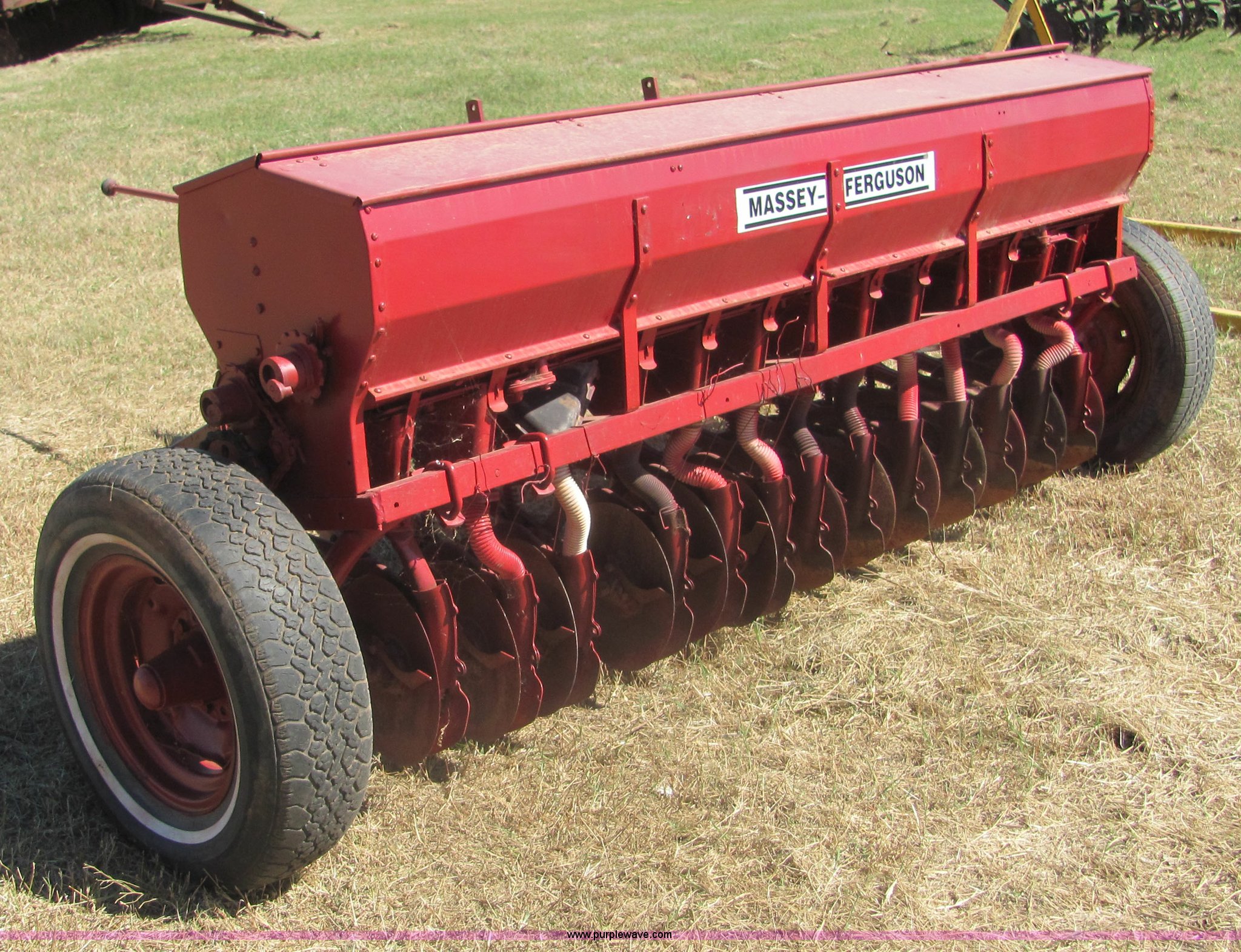 Purple Wave is selling a used Grain Drill or Seeder in Oklahoma. This item is a Massey Ferguson 7' drill with the following: Ground drive, Grain and fertilizer box, Single disc openers, Drag chains included