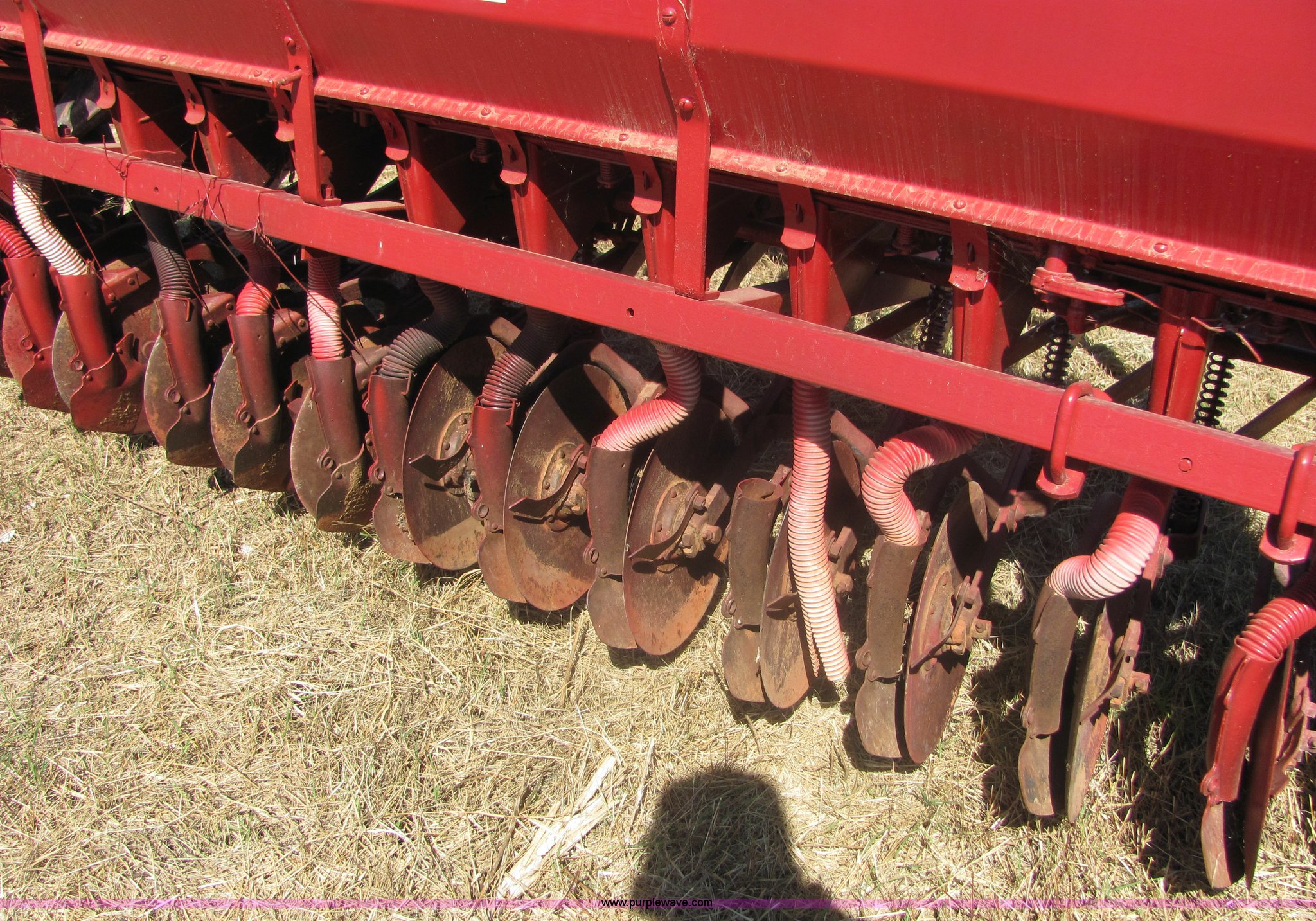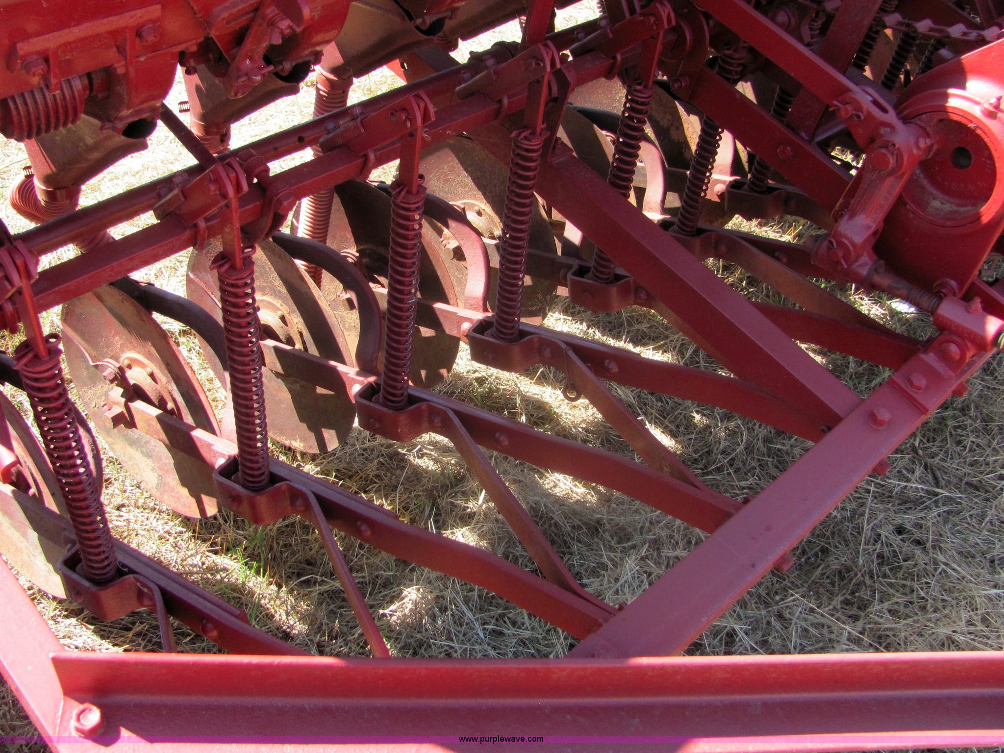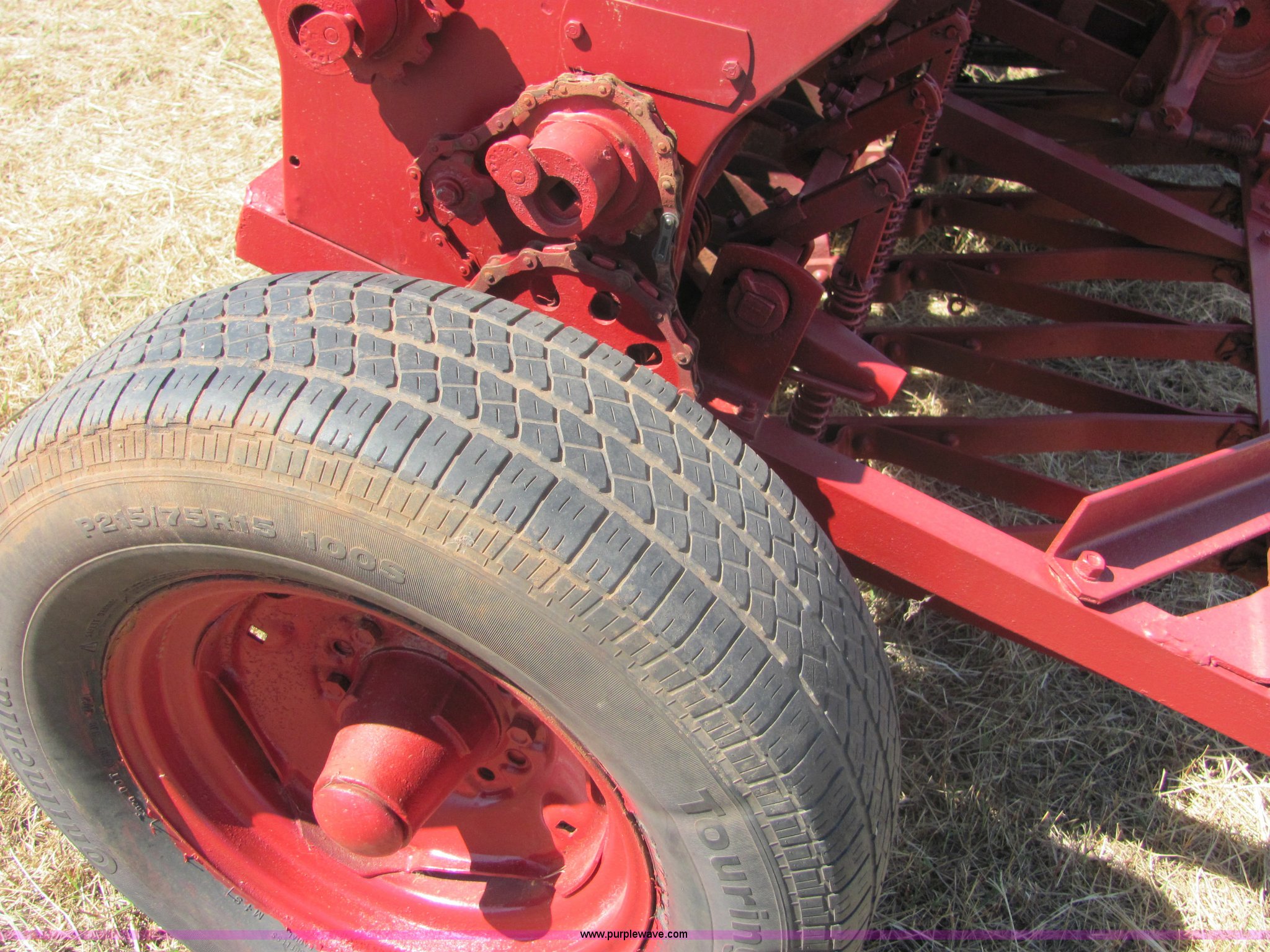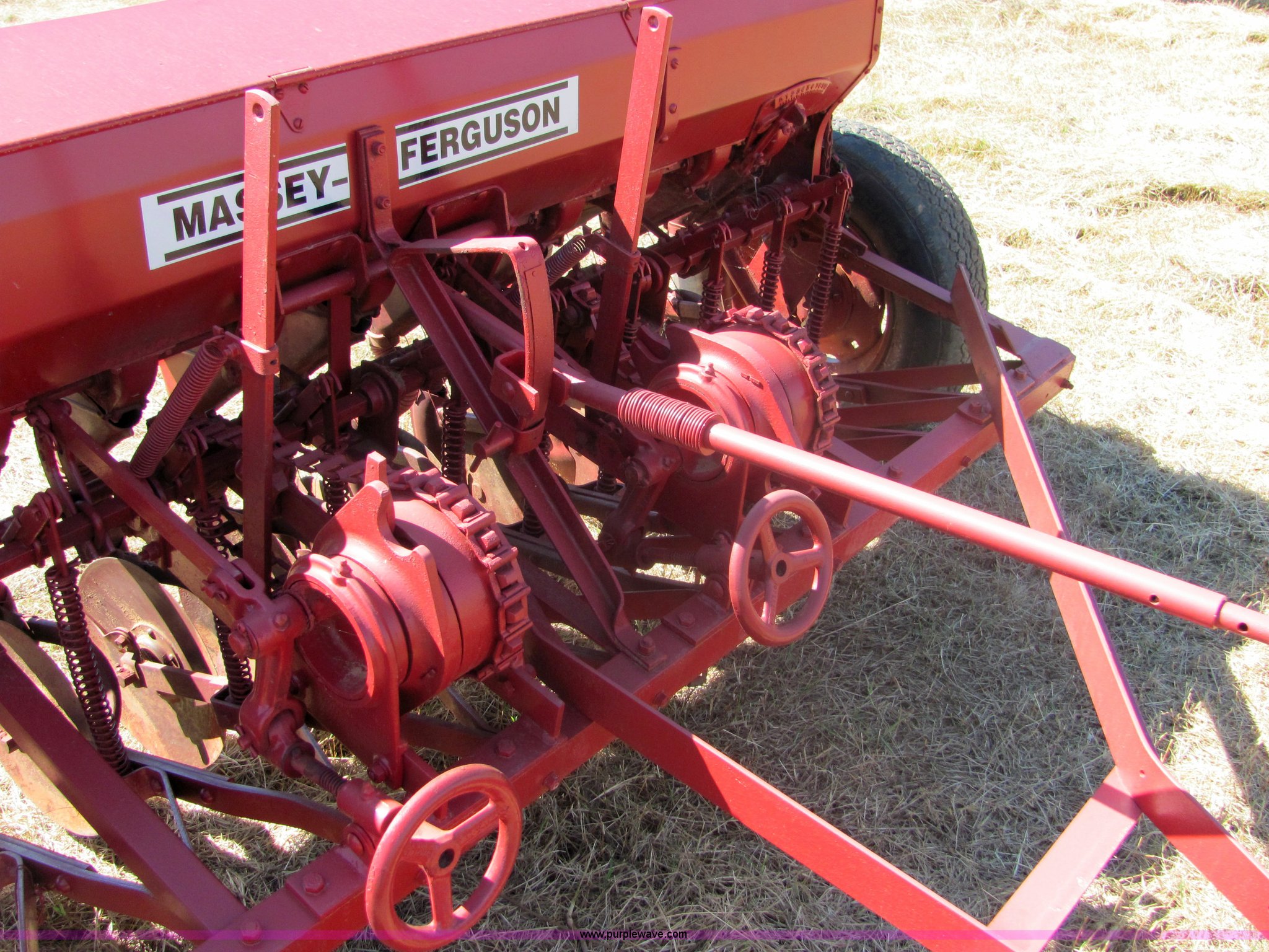 Purple Wave is selling a used Grain Drill or Seeder in Oklahoma. This item is a Massey Ferguson 7' drill with the following: Ground drive, Grain and fertilizer box, Single disc openers, Drag chains included