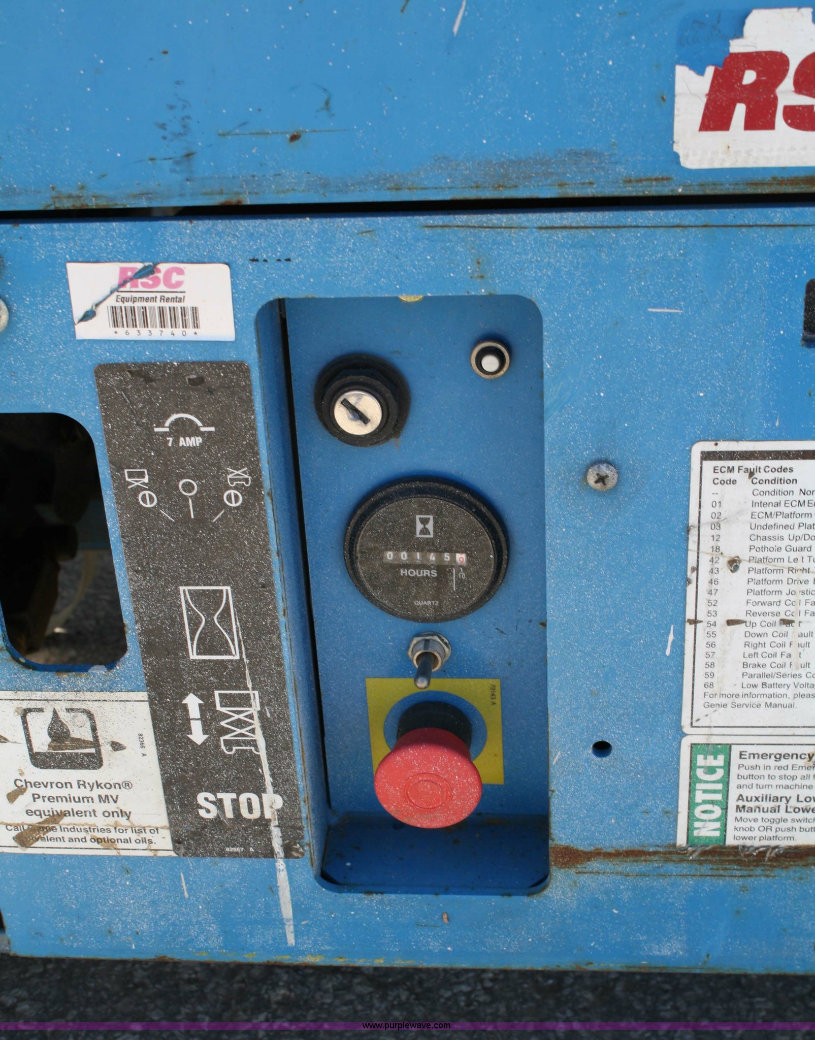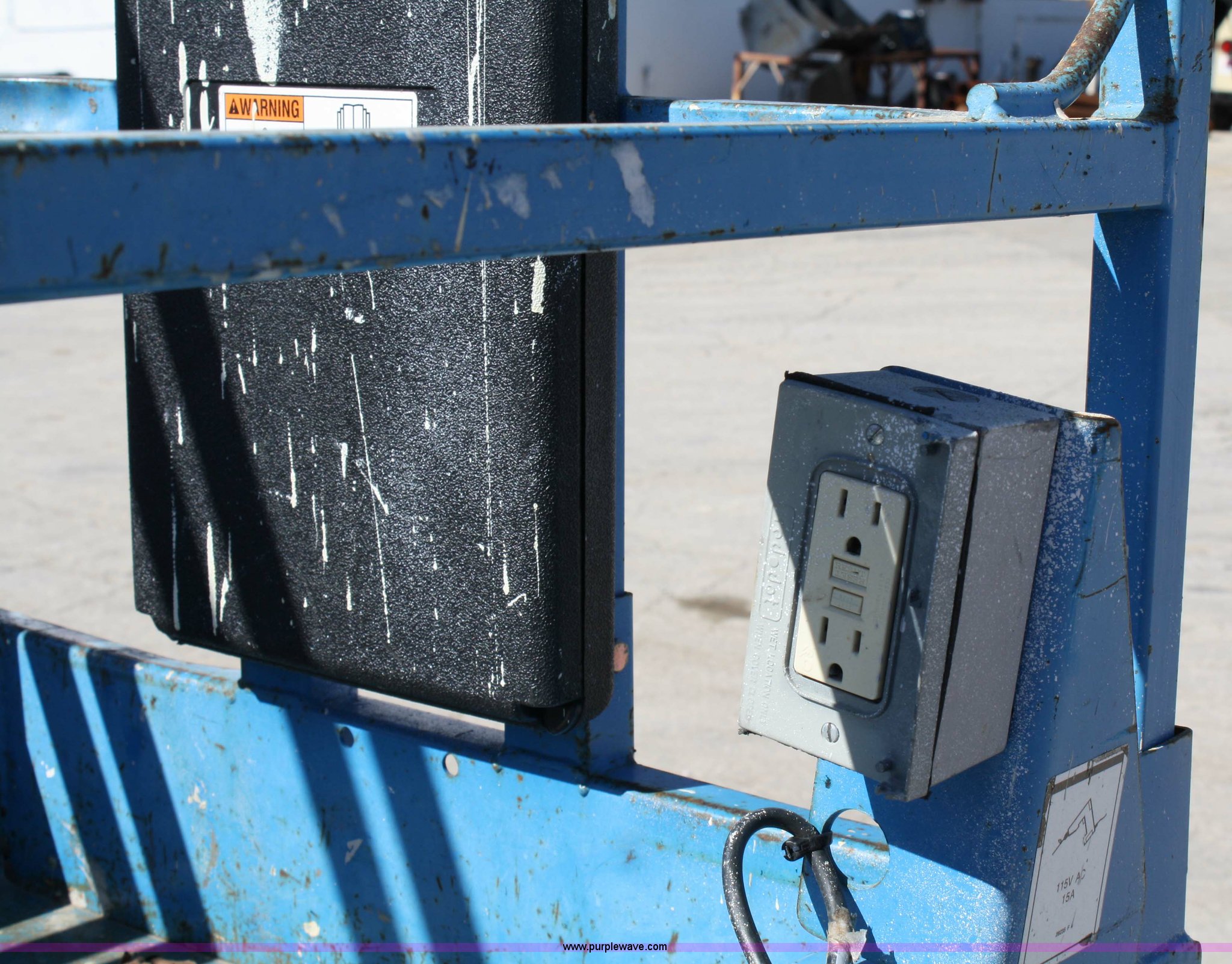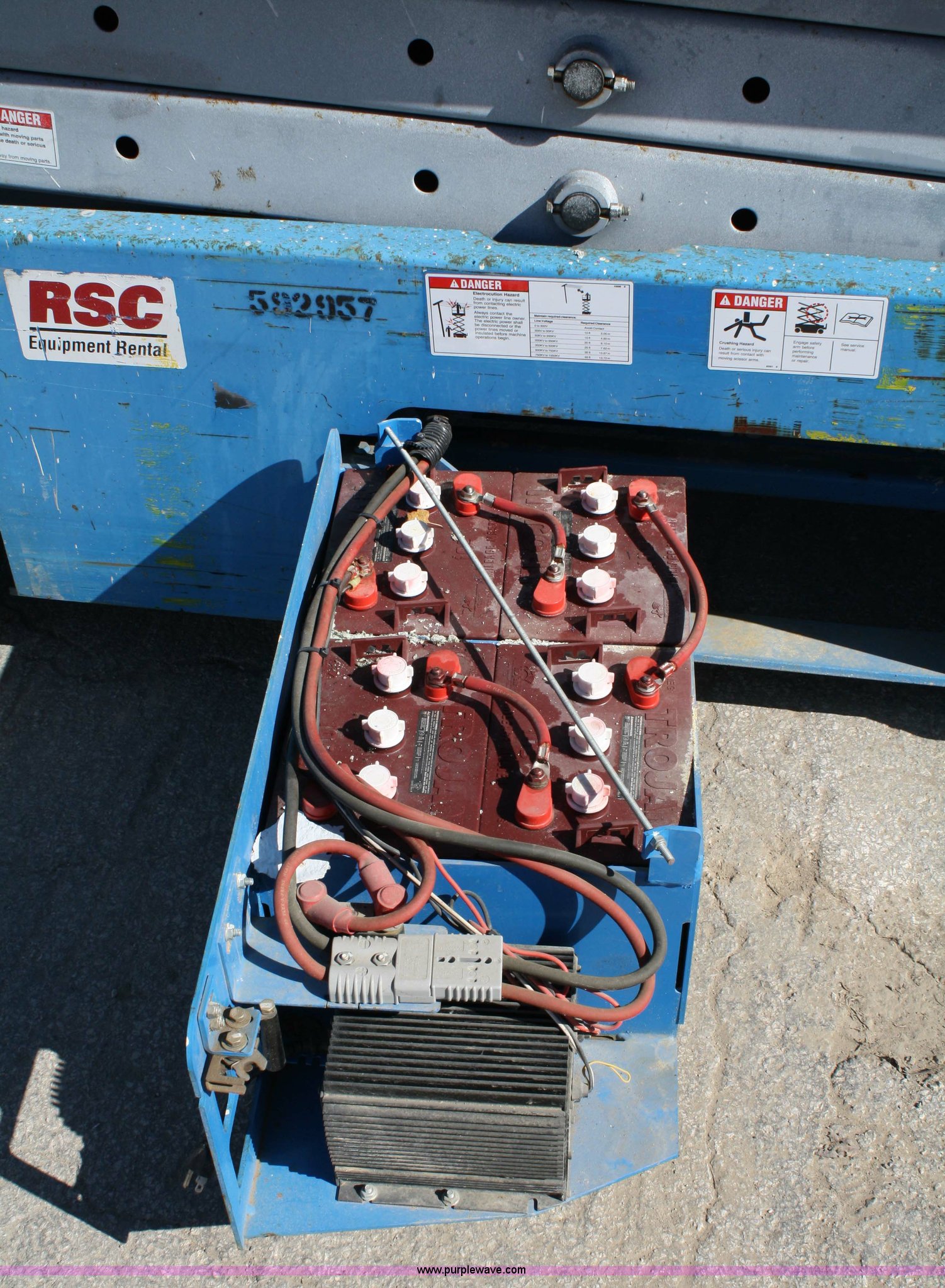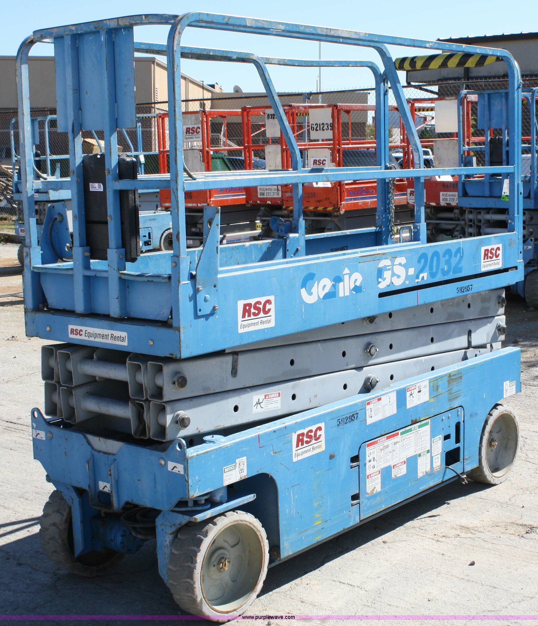 Purple Wave is selling a used Scissor or Vertical Lift in Kansas. This item is a 2005 Genie GS2032 scissor lift with the following: 145 hours on meter, 24 volt, 20' platform height, 36" extension, 800 lbs platform capacity, 550 lbs extended platform capacity, 3,534 lbs. base operating weight, Serial 76833, EIN 592957