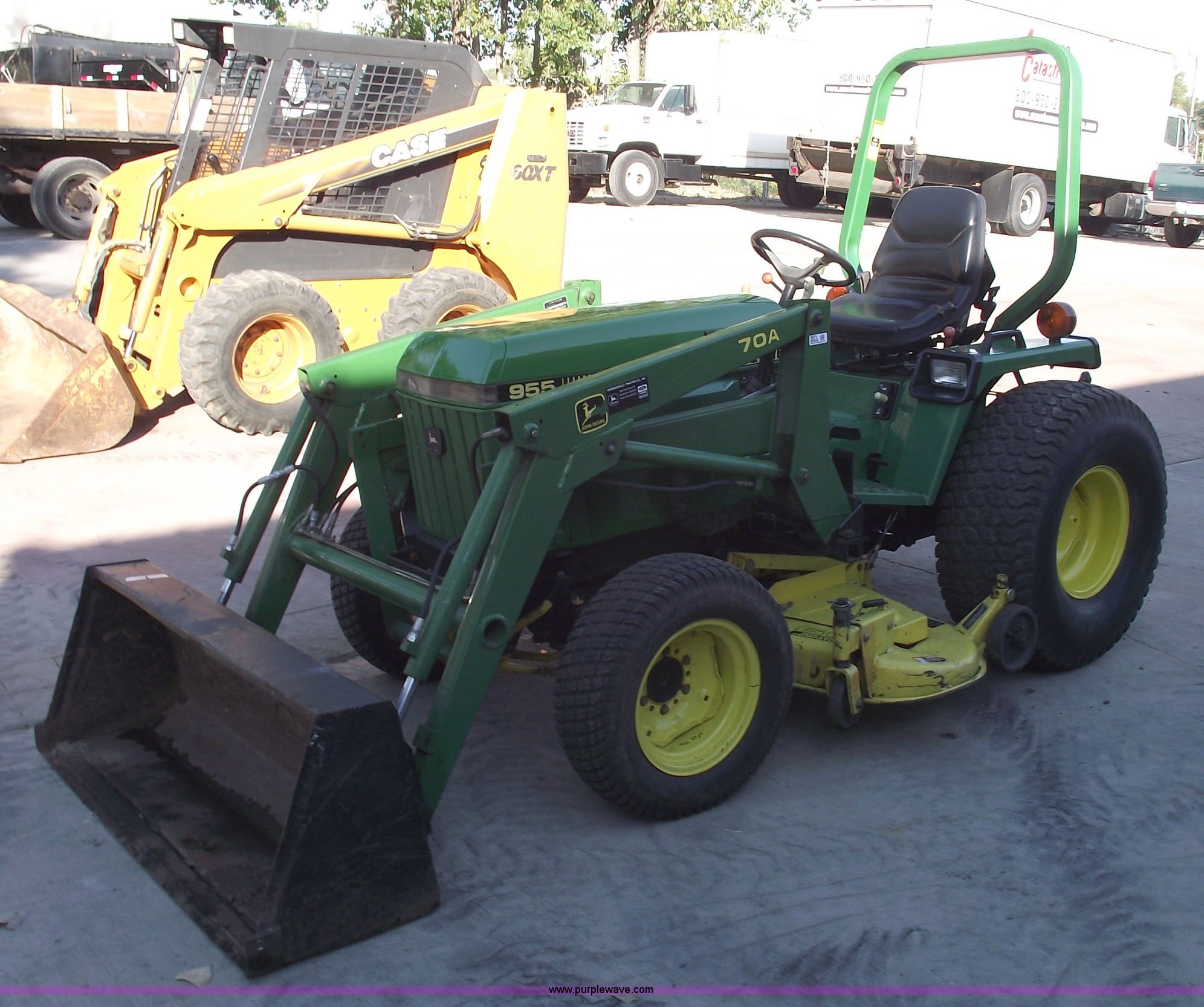 Purple Wave is selling a used Tractor in Kansas. This item is a 1995 John Deere 955 tractor with the following: 444 hours on meter, Yanmar three cylinder diesel engine, Hydrostatic transmission, Four wheel drive, 60" belly mower with mulching blades, 70A front loader with quick attach, 54" wide bucket, Three point, 540 PTO, Mid mount rocker shaft, 36x135-15 rear tirs, 25 x 8.50-14 front tires, Turf tires, ROPS, Serial LV0955D181873