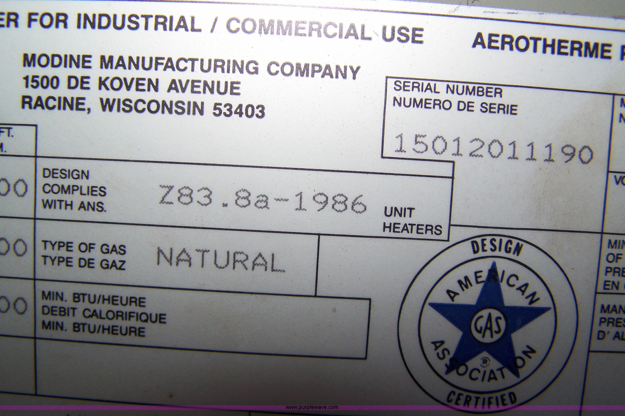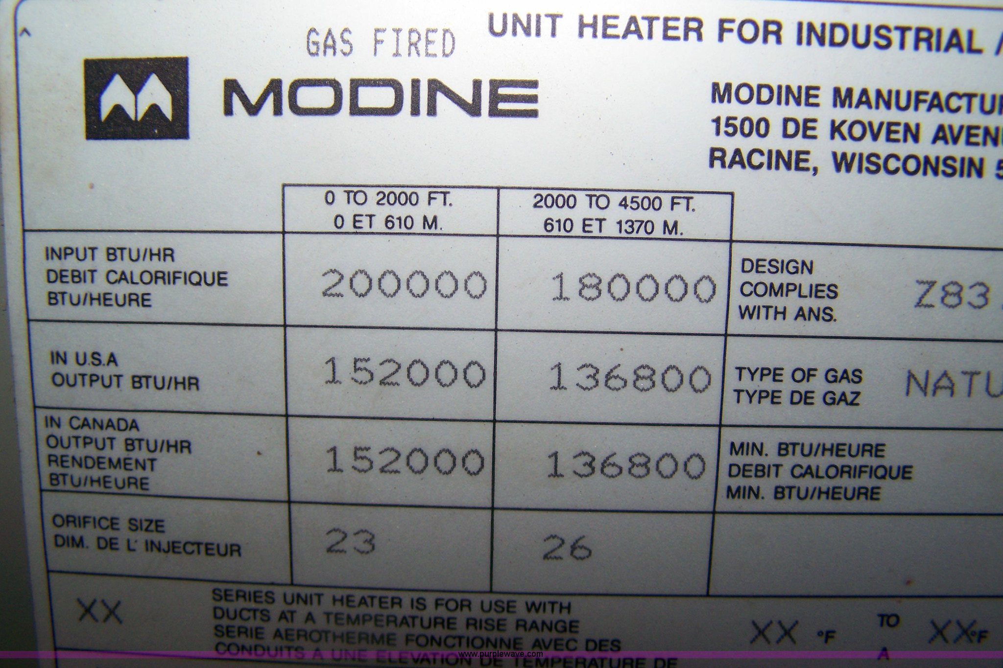 Purple Wave is selling a used Appliances in Kansas. This item is a Madine overhead heater with the following: Natural gas, 200,000 BTU