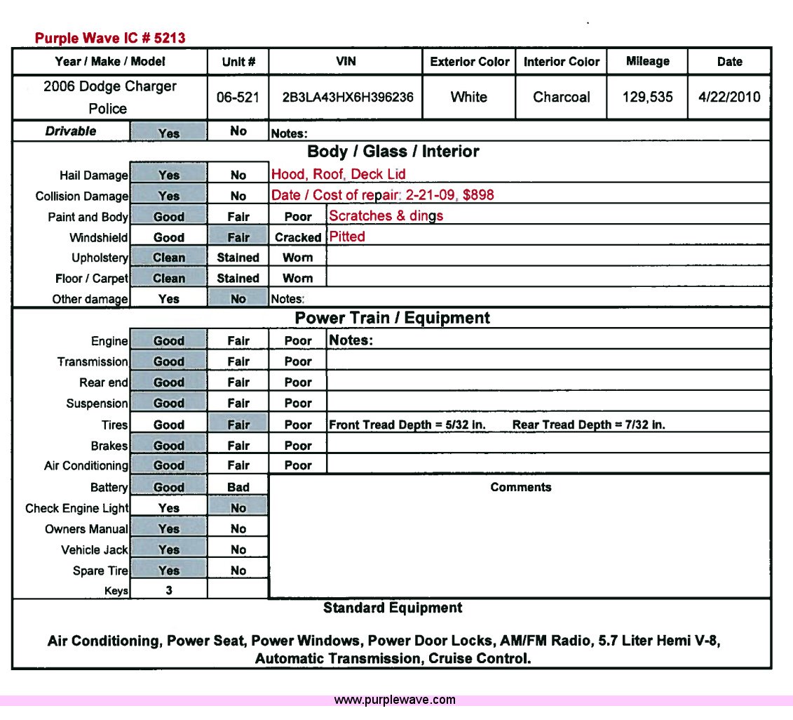 Purple Wave is selling a used Passenger Vehicle in Kansas. This item is a 2006 Dodge Charger with the following: 129,535 miles on odometer, 5.7L V8 MPI, Automatic transmission, AC and heat, AM/FM radio, Cruise control, Power windows, locks, and seat, Hail damage, Scratches and dings, Unit # 06-521