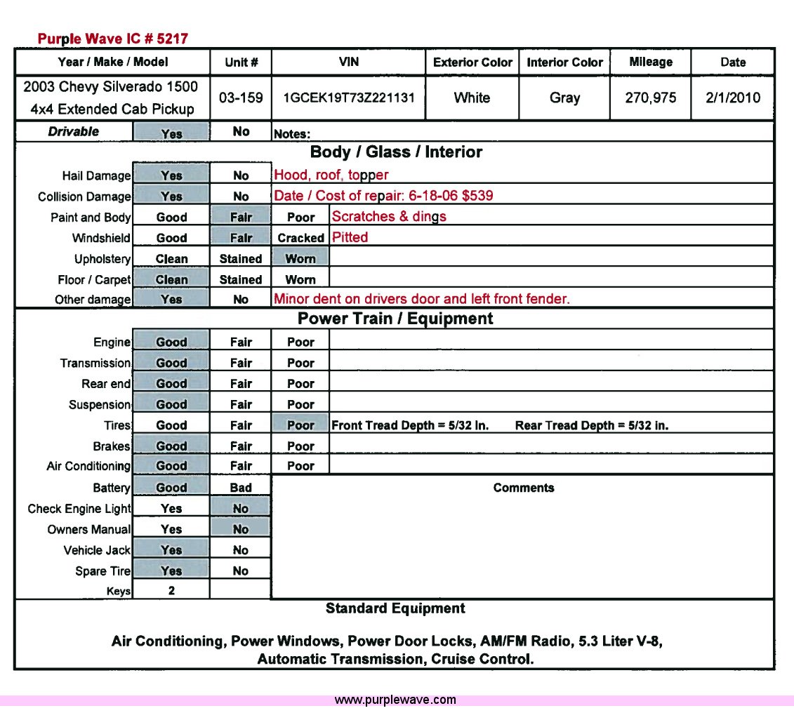 Purple Wave is selling a used 1/2 Ton Pickup or Van in Kansas. This item is a 2003 Chevrolet K1500 Silverado extended cab pickup truck with the following: 270,975 miles on odometer, 5.3L V8 SFI, Automatic transmission, Four wheel drive, AC and heat, AM/FM radio, Power windows and locks, Cruise control, Hail damage, Scratches and dings, Unit # 03-159