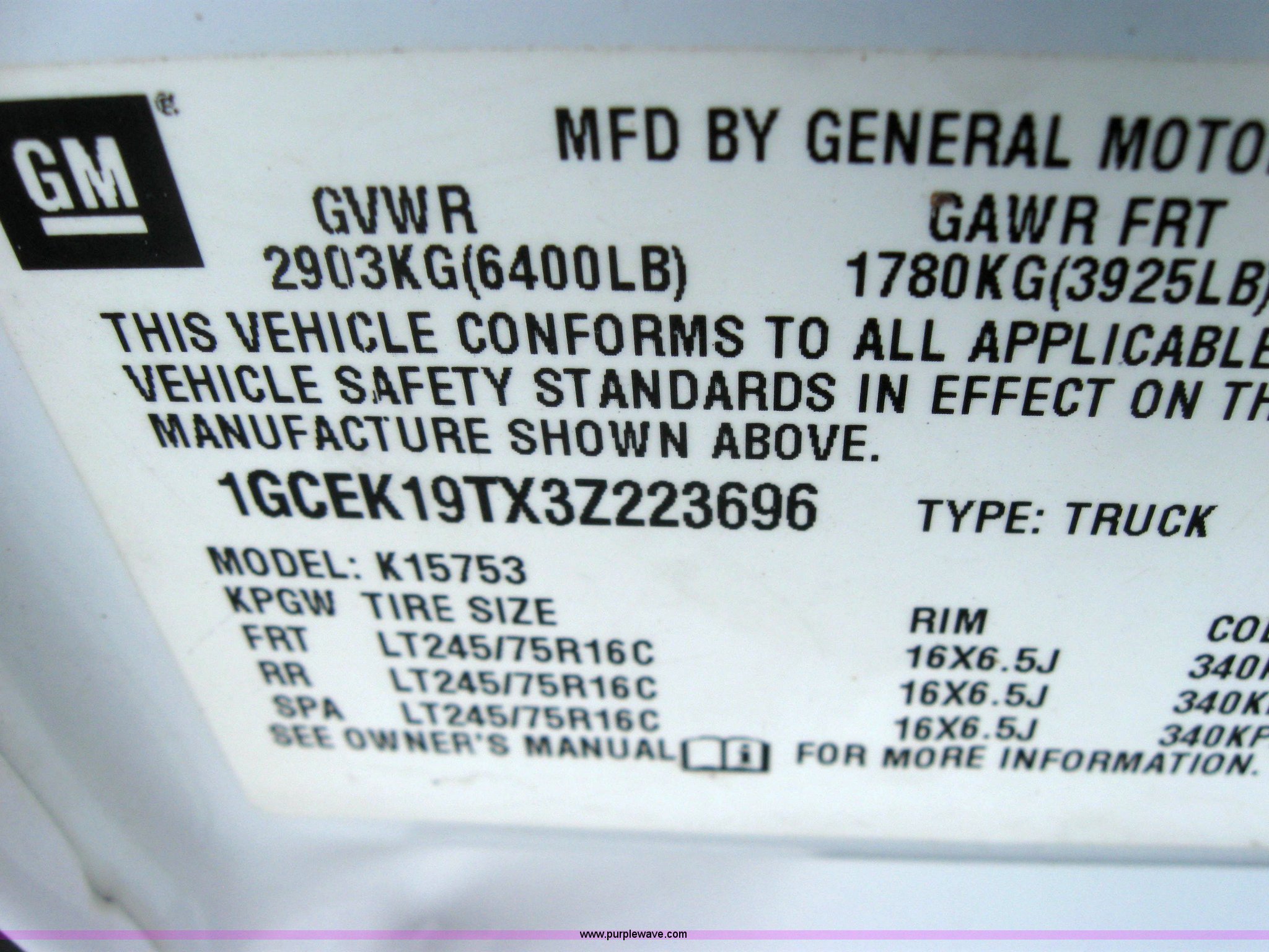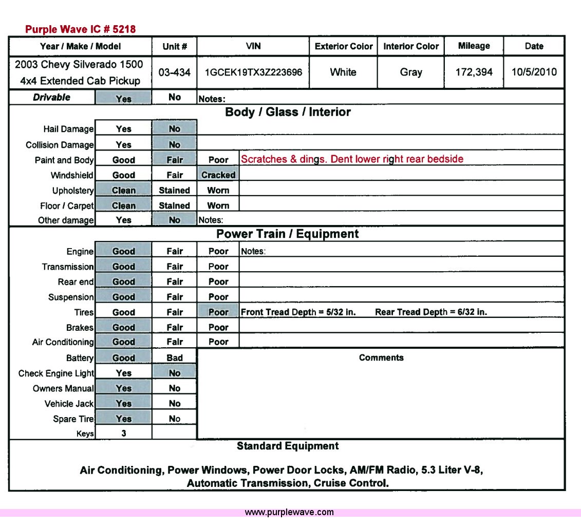Purple Wave is selling a used 1/2 Ton Pickup or Van in Kansas. This item is a 2003 Chevrolet K1500 Silverado extended cab pickup truck with the following: 172,394 miles on odometer, 5.3L V8 SFI, Automatic transmission, Four wheel drive, AC and heat, AM/FM radio, Cruise control, Power windows and locks, Scratches and dings, Dent in lower right rear bedside, Unit # 03-434