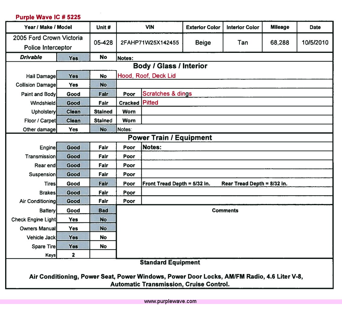 Purple Wave is selling a used Passenger Vehicle in Kansas. This item is a 2005 Ford Crown Victoria Police Interceptor with the following: 68,288 miles on odometer, 4.6L V8 EFI, Automatic transmission, AC and heat, AM/FM radio, Power windows, locks, and seat, Cruise control, Hail damage, Scratches and dings, Unit # 05-428