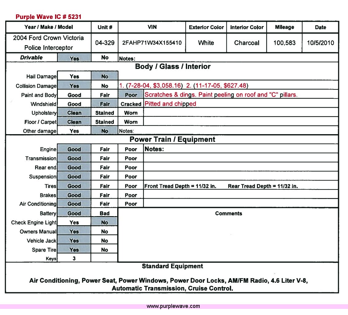 Purple Wave is selling a used Passenger Vehicle in Kansas. This item is a 2004 Ford Crown Victoria Police Interceptor with the following: 100,583 miles on odometer, 4.6L V8 EFI, Automatic transmission, AC and heat, AM/FM radio, Power windows, locks, and seat, Cruise control, Scratches and dings, Paint peeling, Unit # 04-329