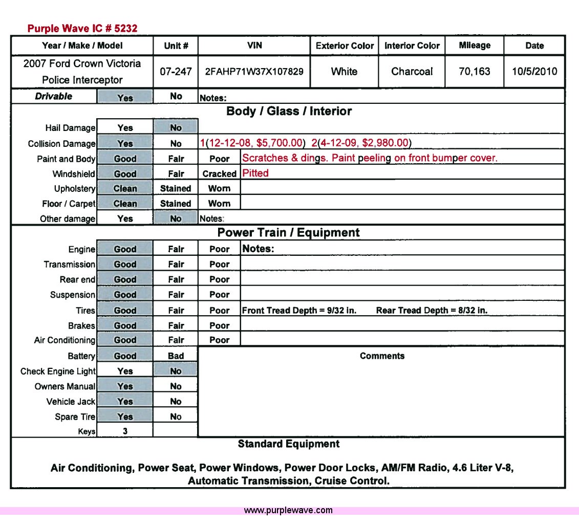 Purple Wave is selling a used Passenger Vehicle in Kansas. This item is a 2007 Ford Crown Victoria Police Interceptor with the following: 70,163 miles on odometer, 4.6L V8 EFI, Automatic transmission, AC and heat, AM/FM radio, Power windows, locks, and seats, Cruise control, Scratches and dings, Paint peeling on front bumper cover, Unit # 07-247