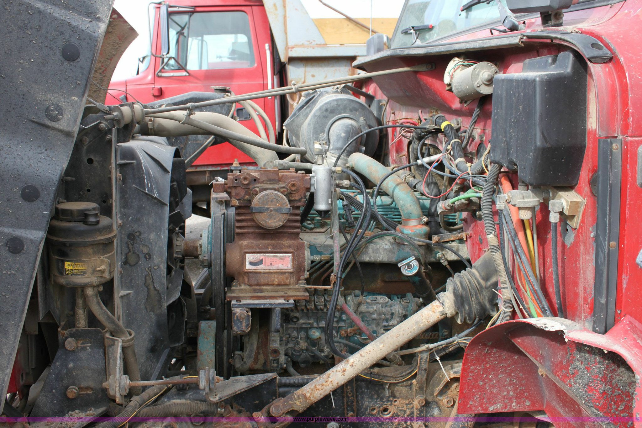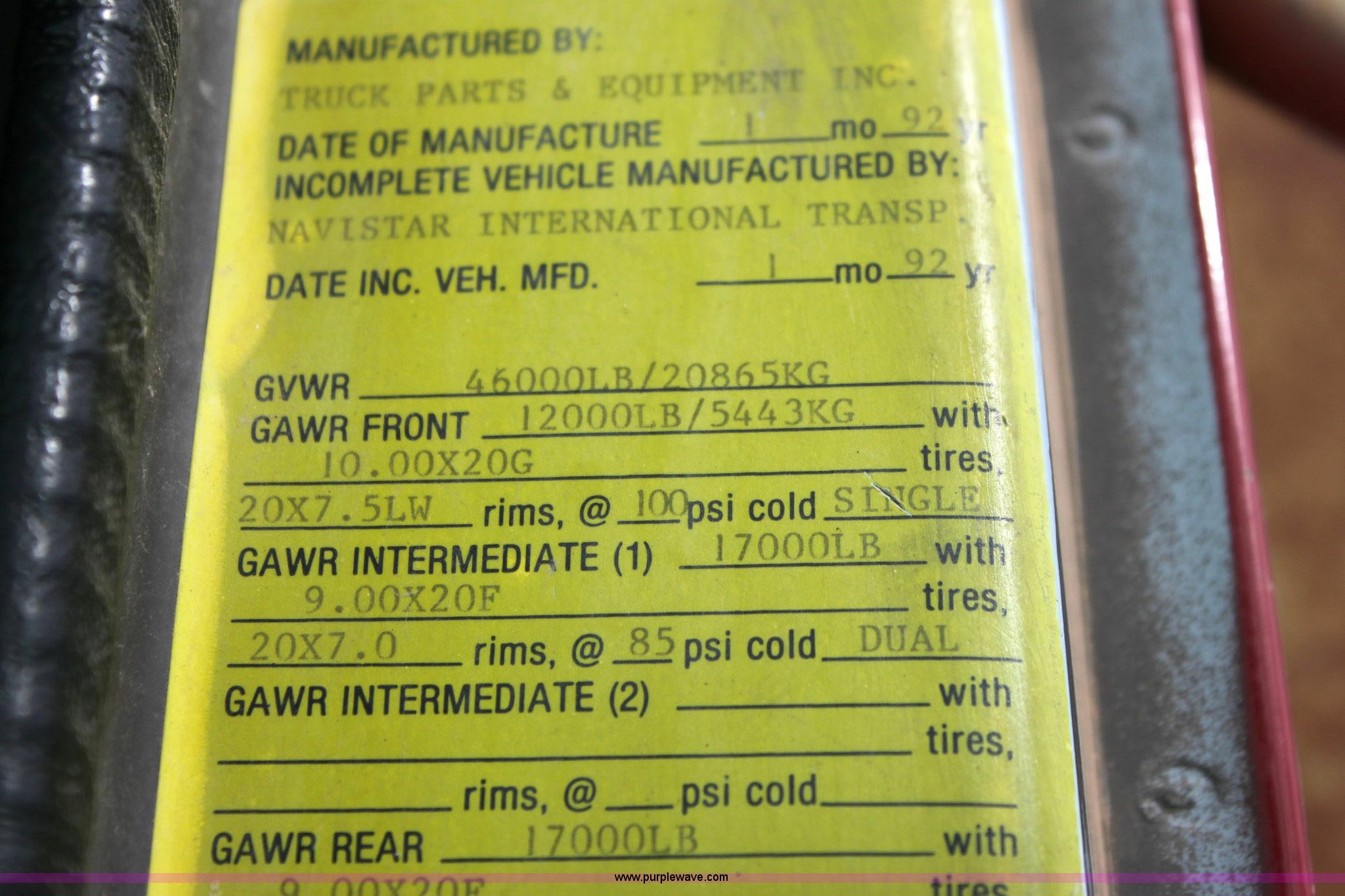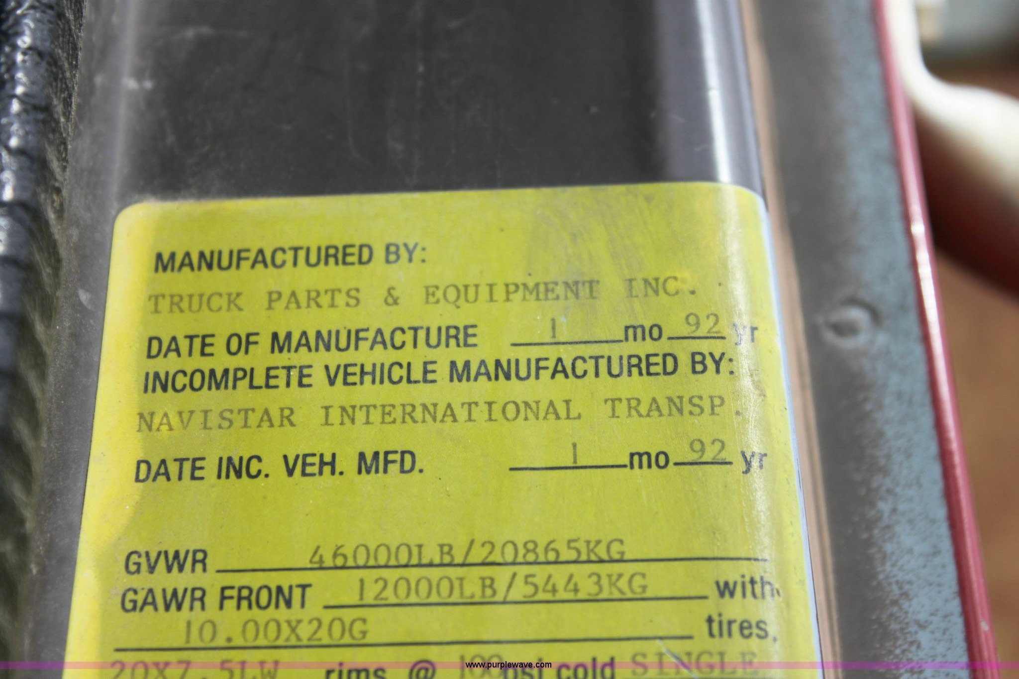 Purple Wave is selling a used Construction Dump Truck in Kansas. This item is a 1992 International 4900 tandem axle dump truck with the following: 70,996 miles on odometer, International DT-466 L6, 7.6L (466CID) diesel engine, Eaton Fuller 10-speed split axle manual transmission, Locking differential, Chelsea PTO, 11' snow plow, Snowplow controls, Dual fuel tanks, 10.00R20 tires, Rear bed hydraulic couplers, Manual release endgate, Manual roll-over tarp, Spring suspension, Heat, 46,000lbs GAWR, 12,000lbs GAWR front, 17,000lbs GAWR Intermediate, 17,000lbs GAWR rear, Equipment # 2426