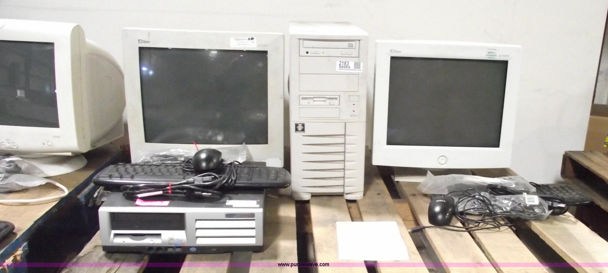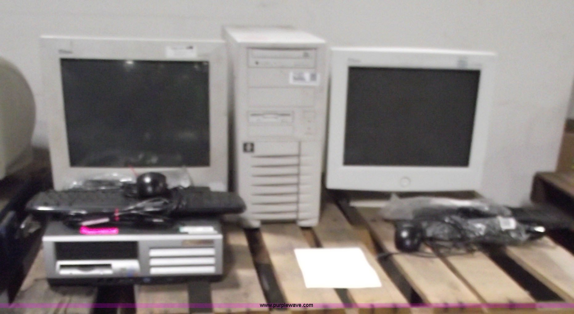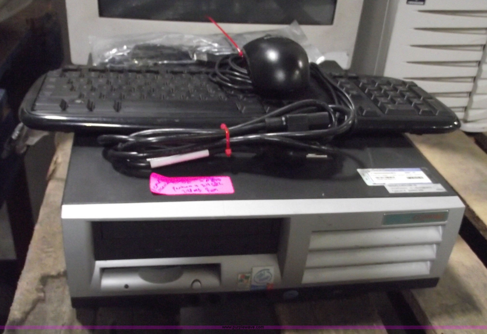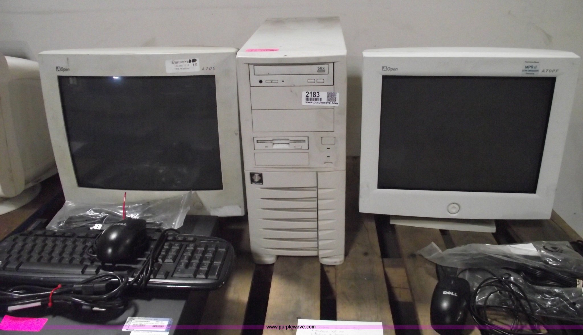 Purple Wave is selling a used Computers in Kansas. This item is a (2) computers with the following: HP Compaq computer tower, Windows XP Pro, Pentium 4 processor, 40 GB hard drive, Invision computer tower, Windows XP Pro, Intel processor, 40 GB hard drive, (2) USB keyboards and track ball mice, (2) Aopen 15" CRT monitors, Assorted cables