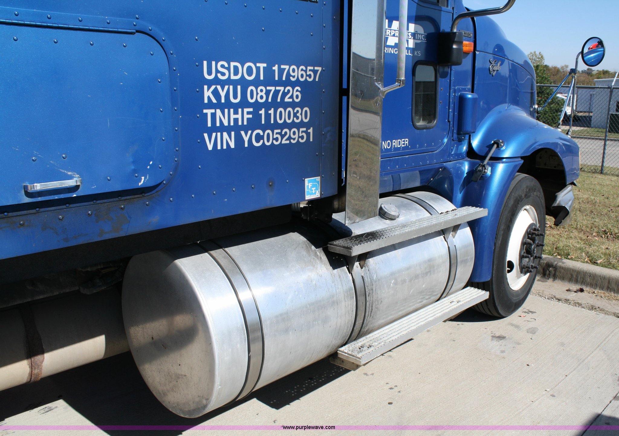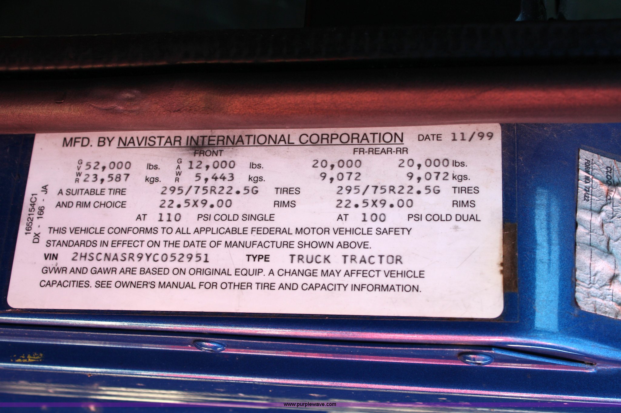 Purple Wave is selling a used Truck Tractor in Kansas. This item is a 2000 International 9400i semi truck with the following: 352,268 miles on odometer, Caterpillar 2406 diesel engine, Eaton Fuller 10 speed manual transmission, Twin screw, AC and heat, Cruise control, AM/FM/cassette player, Passenger daylight door, Air suspension seat, Air ride cab, Power windows and mirrors, Exterior visor, Chrome bumper, Block heater, Cab extender, Dual fuel tanks, Double font stacks, Stainless steel quarter fender, Pro Sleeper 90x60 single sleeper with storage, Air suspension, Air brakes, Jake brake, Brake controller, GVWR 52,000 lbs, GAWR front 12,000 lbs, GAWR intermediate 20,000 lbs, GAWR rear 20,000 lbs, 236" wheel base, 295/75R22.5 tires