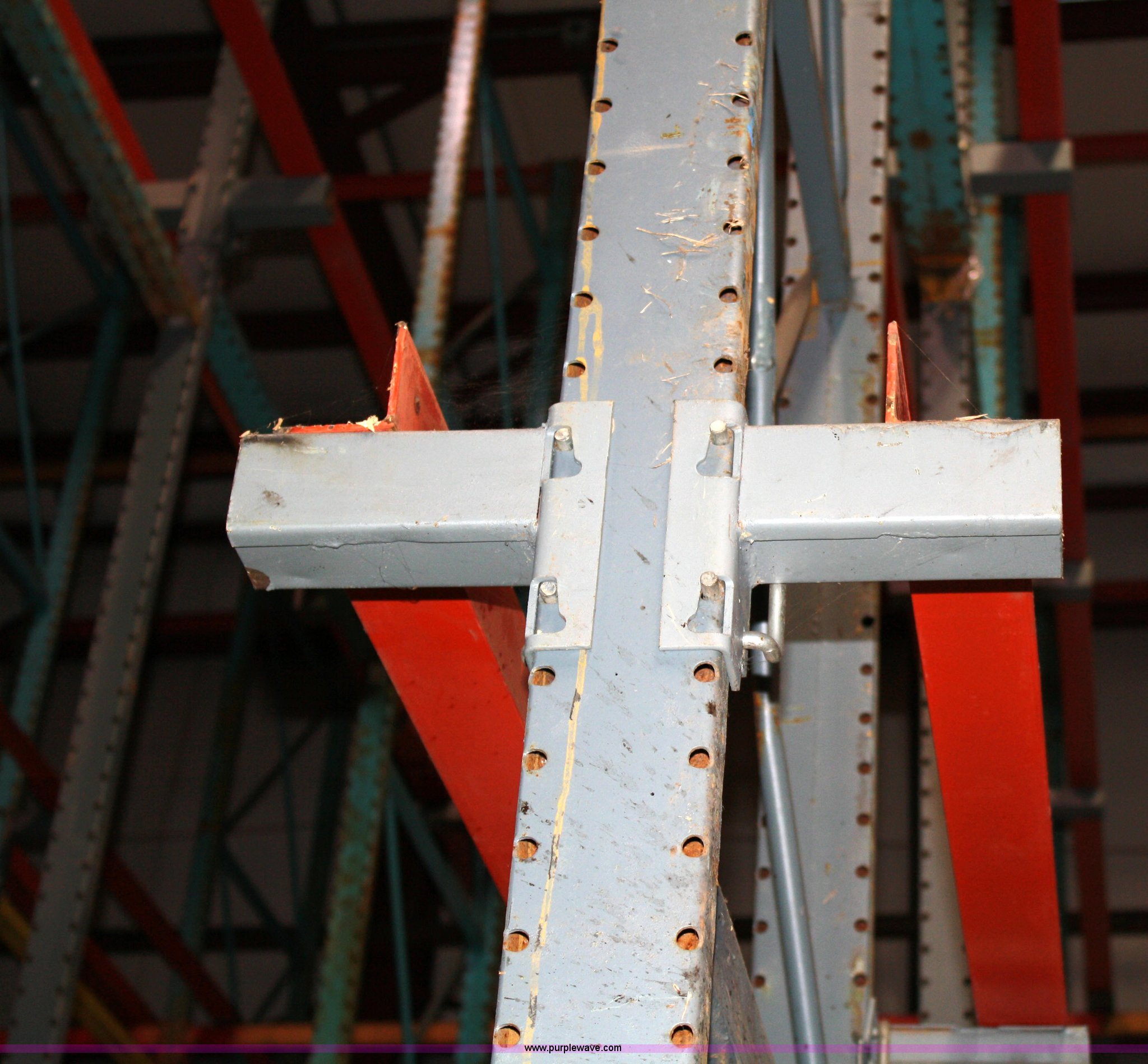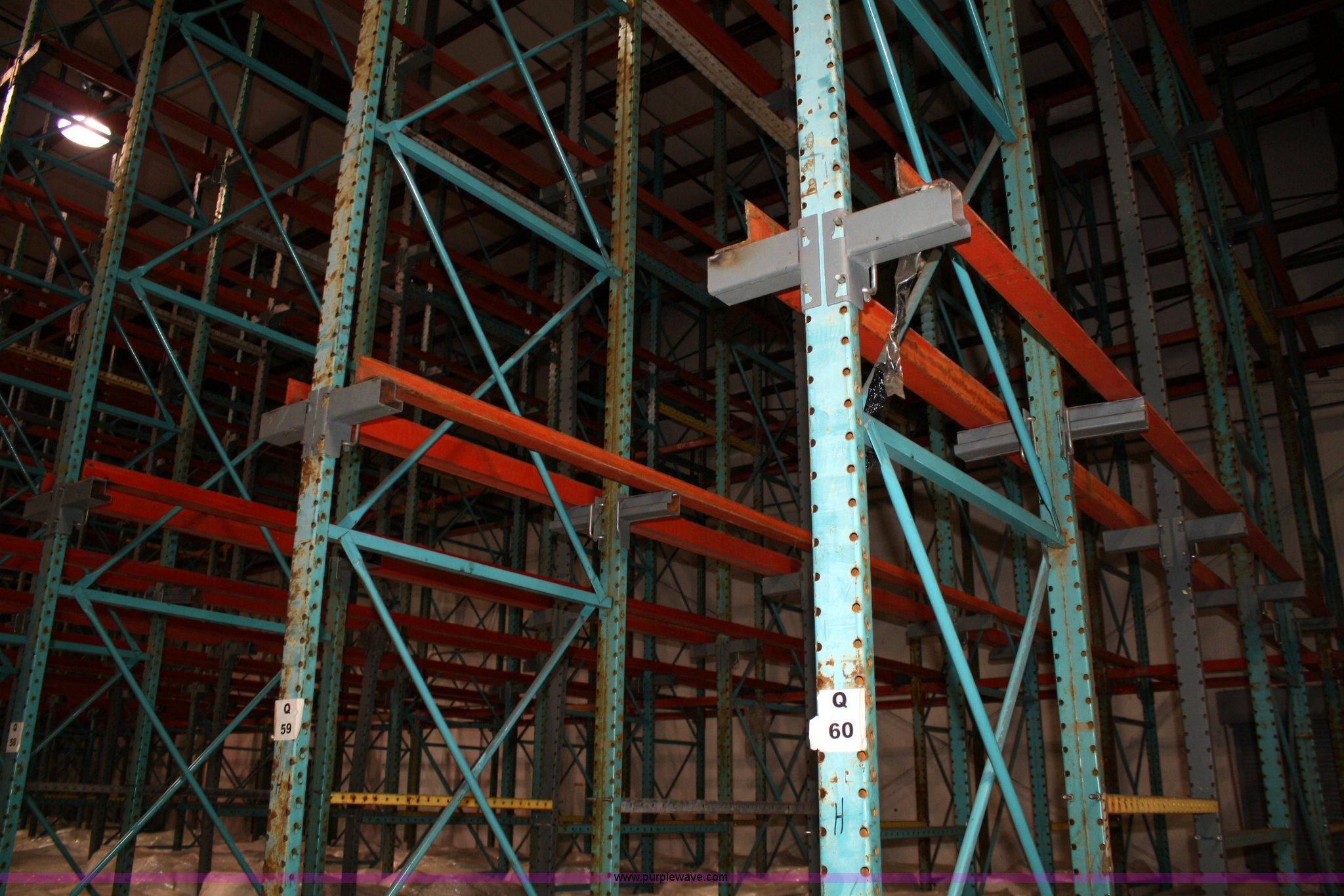 Purple Wave is selling a used Pallet Racking in Kansas. This item is a Drive-in pallet racking system with the following: 23'H uprights, (7) rows, (6) deep, (2) rails for three rows high, 126 slots