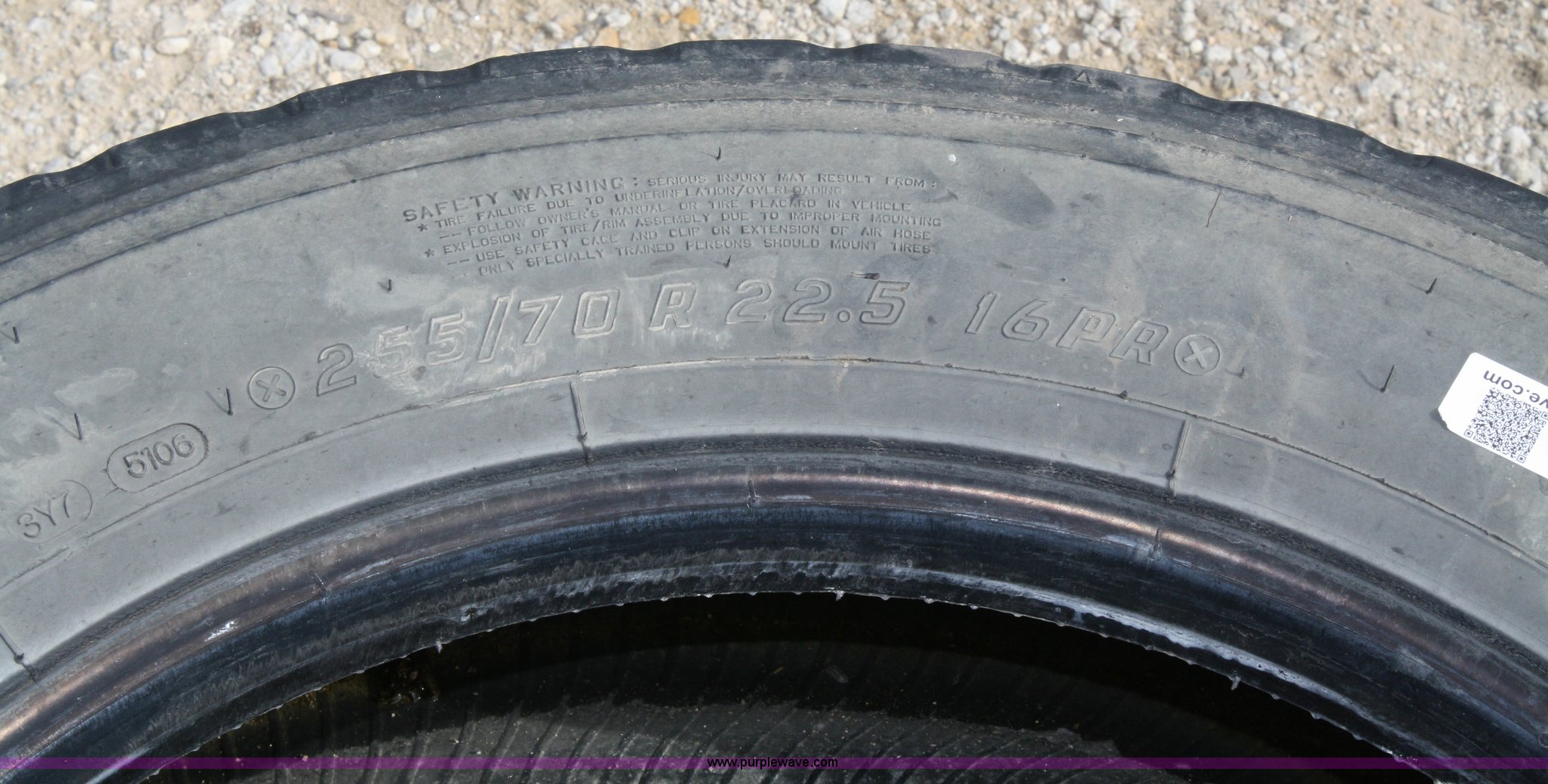 Purple Wave is selling a used Automotive Parts or Acces. in Kansas. This item is a (2) 255/70R22.5 tires with the following: (2) 255/70R22.5 tires. Shipping quotes available. Sod Shop Inc.. 4855 W. 231 St.. Bucyrus, KS 66013