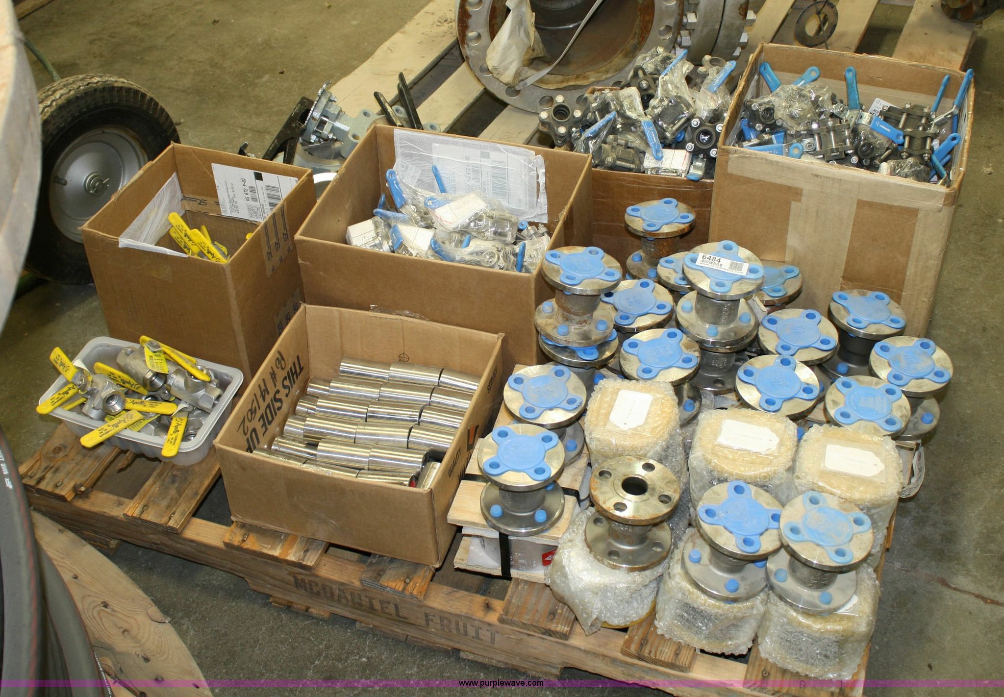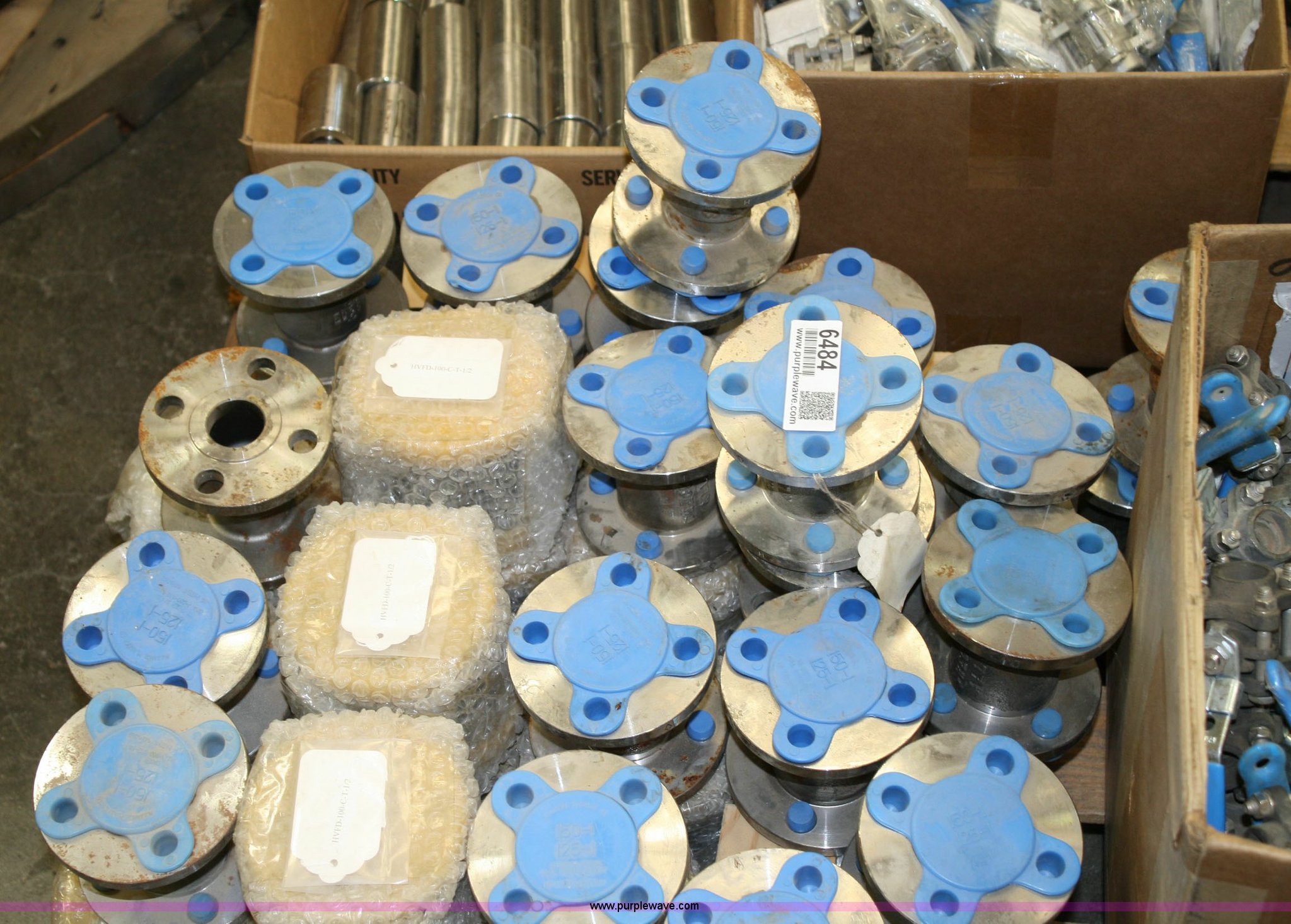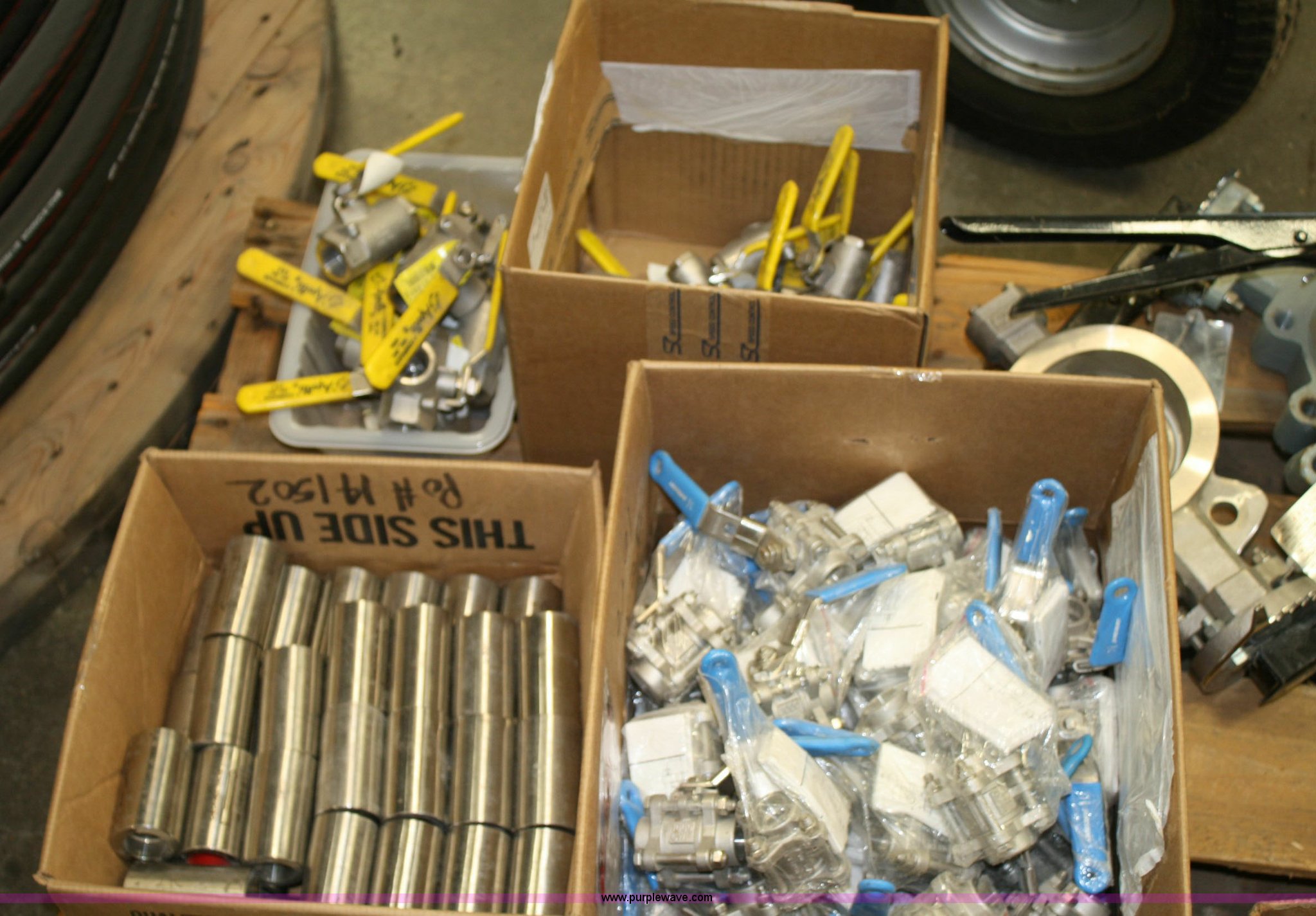 Purple Wave is selling a used Home Improvement in Kansas. This item is a Pallet of assorted valves with the following: (2) boxes James Bury carbon steel ball valves, (1) box James Bury stainless steel ball valves, (2) boxes Apollo stainless steel three way valves, Box of stainless steel check valves, Check valve flanges, (3) 4" butterfly valves