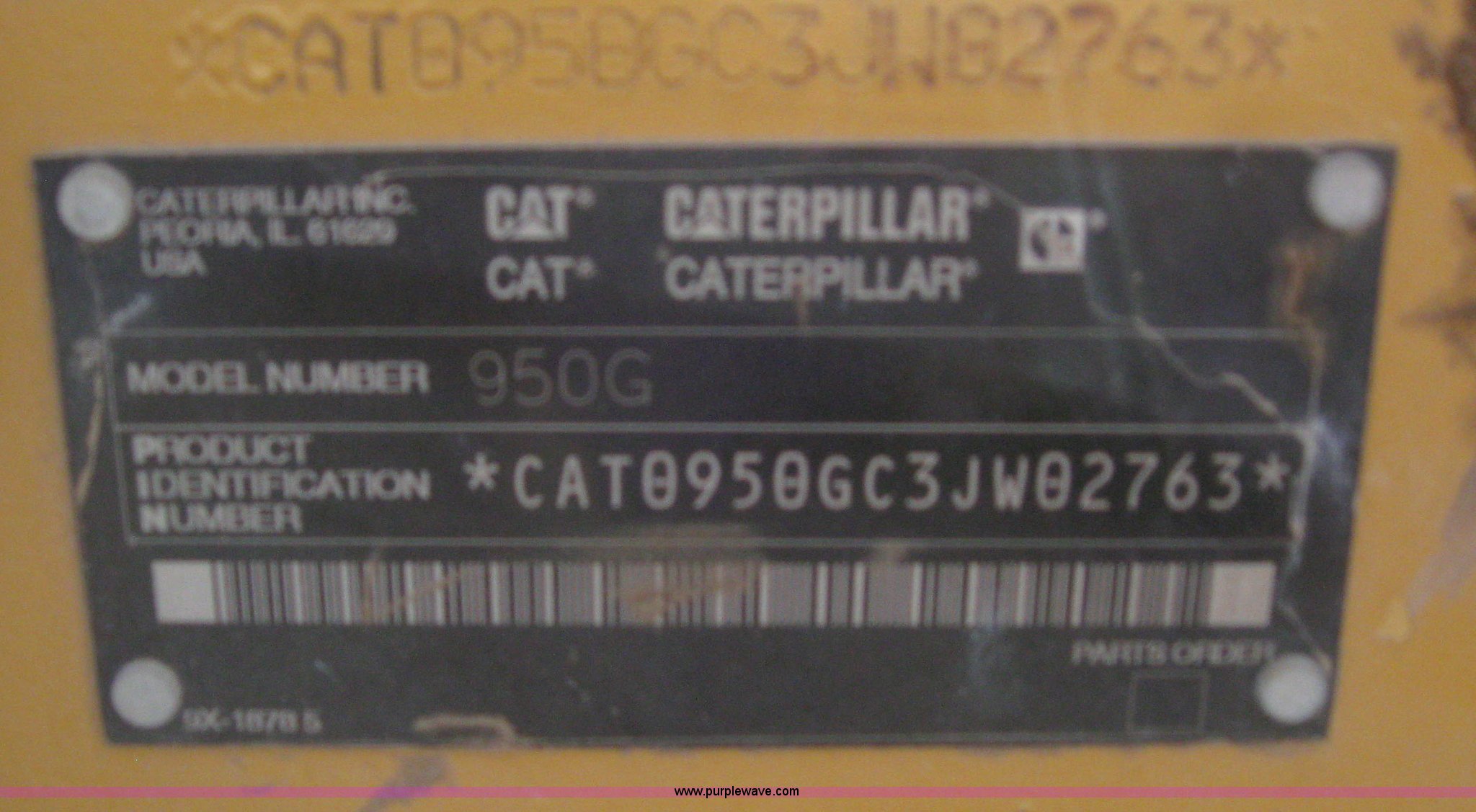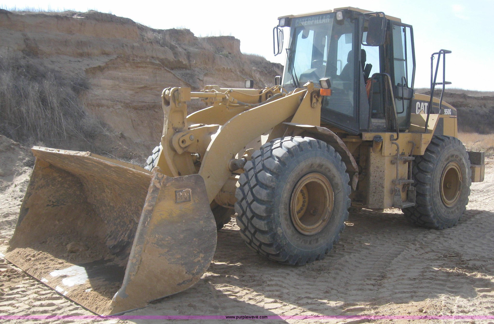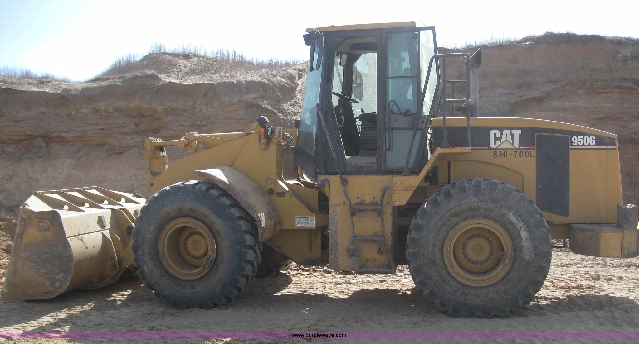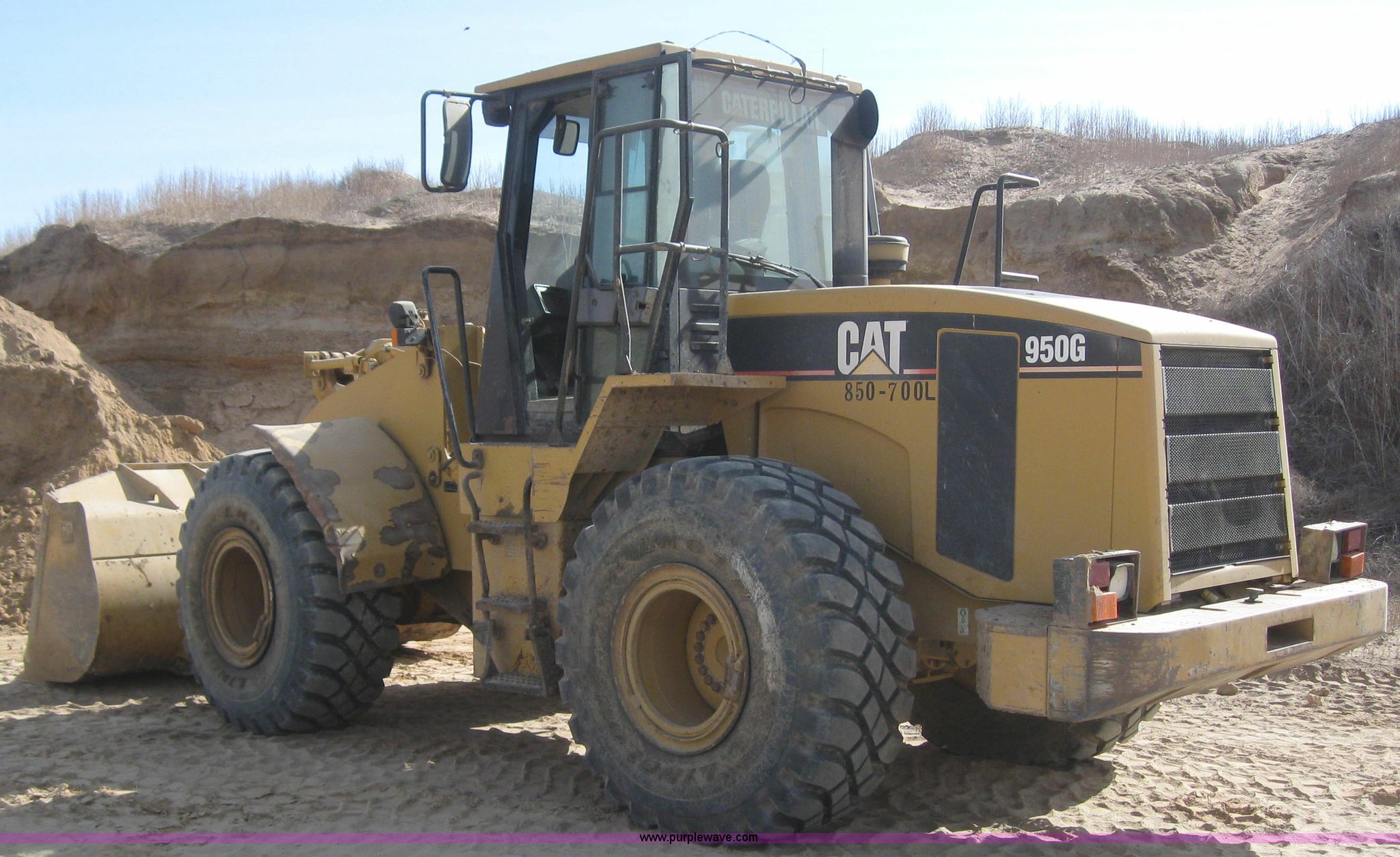 Purple Wave is selling a used Wheel Loader in Kansas. This item is a 2002 Caterpillar 950G wheel loader with the following: 15,585 hours on meter, Unit still in use, Cat 3126 180hp diesel engine, Two stick bucket controls, 9.5'W bucket, Ride control, Auto shift, Air ride seat, AC and heat, AM/FM radio, 23.5R25 tires, 39,200 lbs. base operating weight, Serial CAT0950GC3JW02763