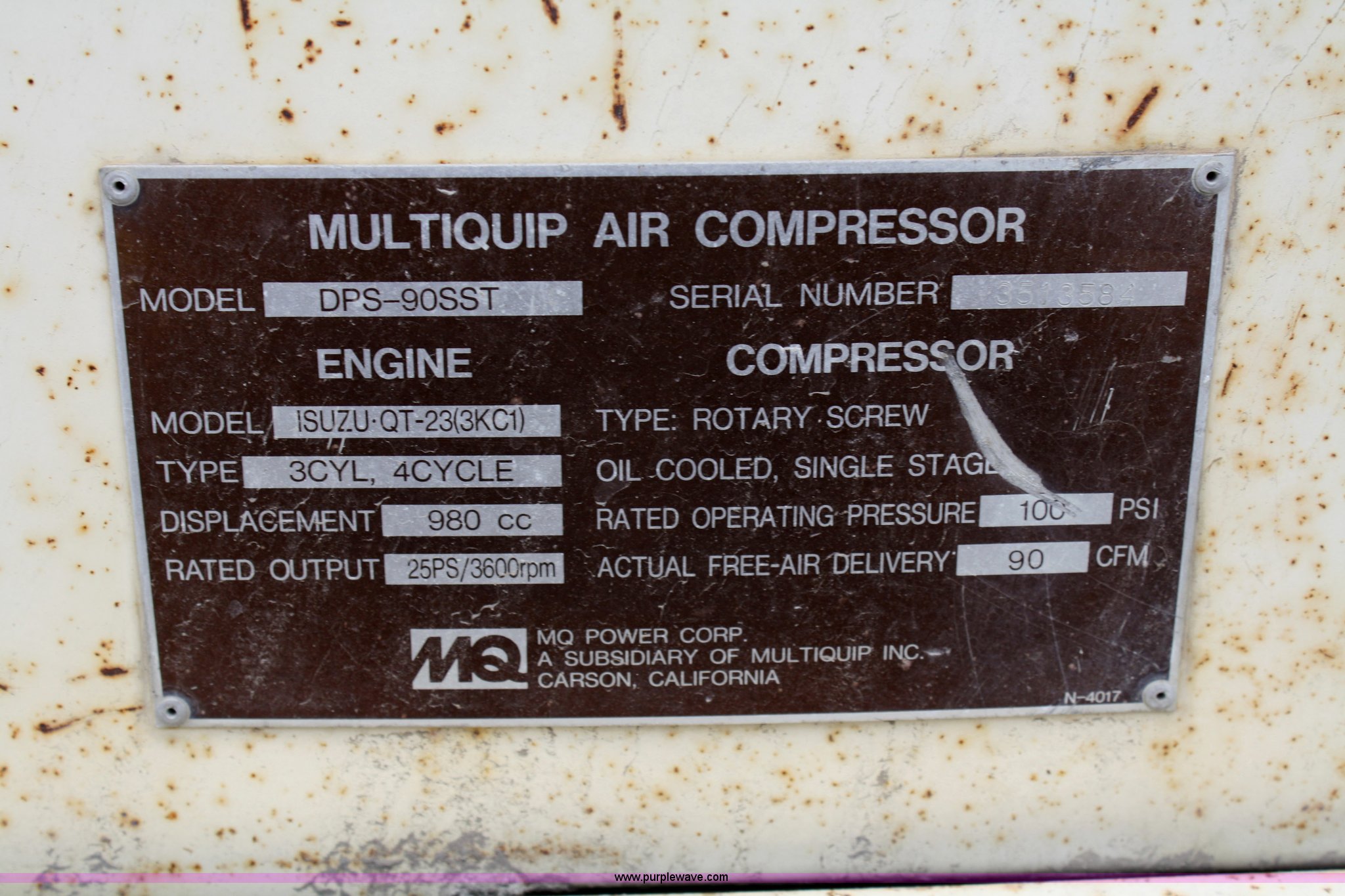 Purple Wave is selling a used Air Compressor in Missouri. This item is a Multiquip DPS-90SST air compressor with the following: 2648 hours on meter, Isuzu three cylinder diesel engine, 125 psi, 90 cfm, Two flat tires, Tongue is bent, Unknown running condition, 2-5/16" ball hitch, Serial 3513584