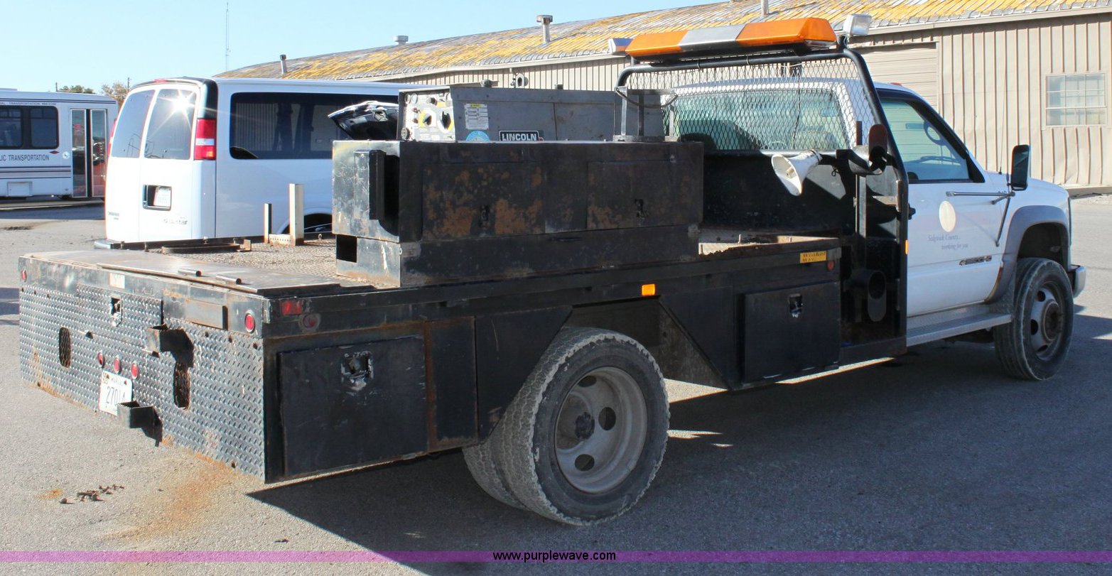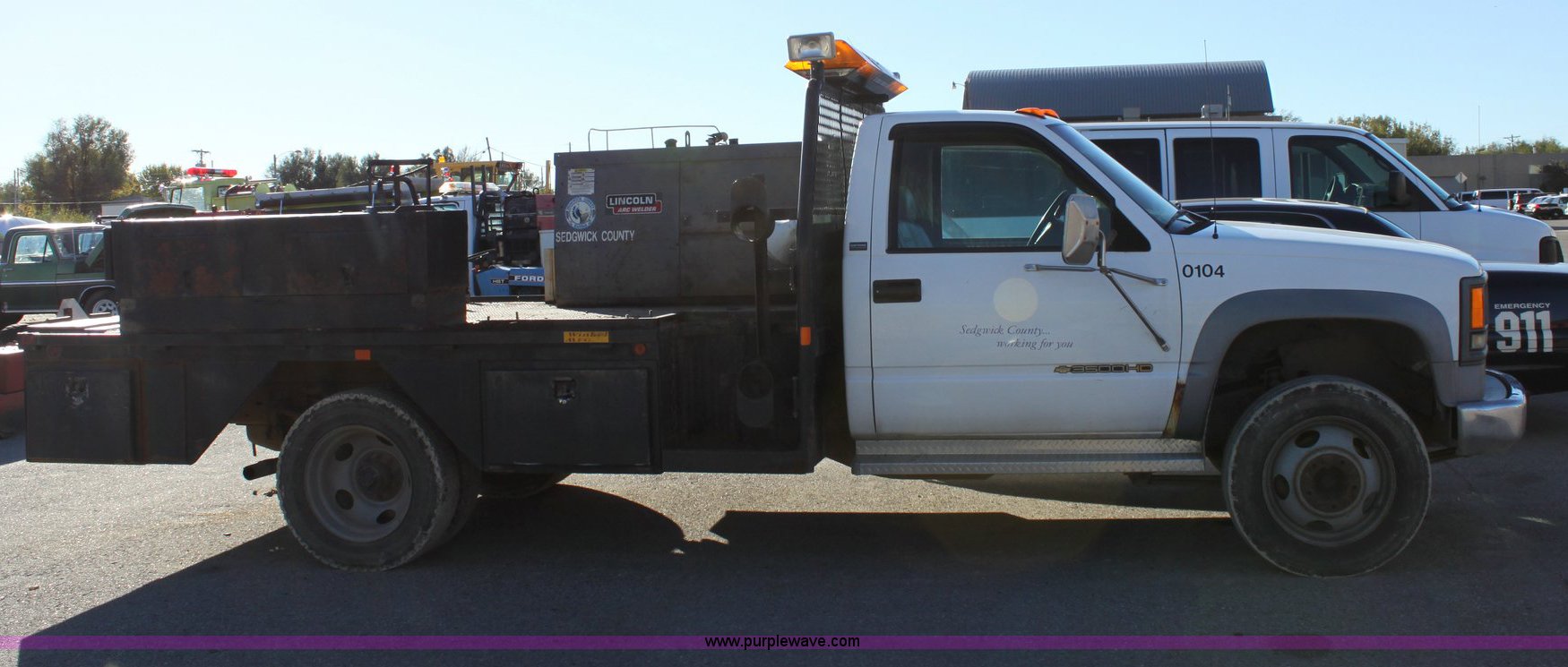 Purple Wave is selling a used Flat Bed Truck in Kansas. This item is a 1995 Chevrolet C3500-HD flat bed pickup with the following: 76,724 miles on odometer, 6.5L V8 FI, Automatic transmission, AC and heat, Tilt, Cruise, AM/FM, Lincoln Weld and Power 250 D10Pro welder generator, 115/230V outlet, 100% duty cycle, 437 hours on meter, Manual windows and locks, 225/70R19.5 tires, Injector pump bad and needs replaced, Equipment # 0104