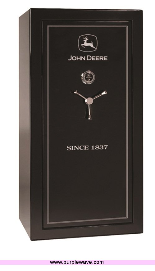 Purple Wave is selling a used Other Industrial or Business in California. This item is a John Deere JP 17PG 17cu.ft. safe with the following: Style, Color options: Durable gloss textured green finish, Logo options: Moline, IL., Three-point handle and lock plated in brass, Upholstered, mocha fabric interior, Fire Protection, Factory Certified 1200°F/30-minute fire rating, Two layers of 5/8-in. U.L. Listed fireboard in the ceiling and door and one layer in the walls, Heat-activated expanding Palusol door seal to resist heat and smoke, Security, U.L. Listed for residential security, Heavy-duty 12-gauge steel body, HiSecurity composite steel door with triple steel hard plates, Four (4) 1-in. diameter active-locking bolts, EZ-Glide bolt protectors, Sargent & Greenleaf U.L. Listed (Group II) mechanical lock, Fail-Safe relocker, Clutch-drive (handle slip) mechanism, Pre-drilled for bolt-down security, Function, 17 cubic foot total volume, Patented 3-in-1 Flex interior holds up to 18 long guns, 24-in. W x 60.5-in. H x 20-in. D, Approximate weight - 400 lbs.