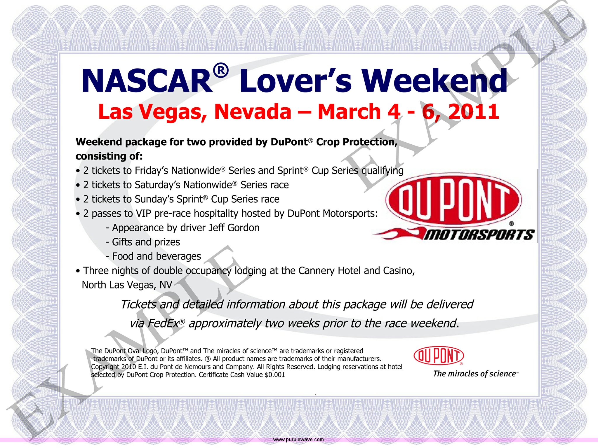 Purple Wave is selling a used Other Industrial or Business in California. This item is a NASCAR Lover's Weekend with the following: (2) tickets to Friday's Nationwide Series and Sprint Cup Series qualifying, (2) tickets to Saturday's Nationwide Series race, (2) tickets to Sunday's Sprint Cup Series race, (2) passes to VIP pre-race hospitality hosted by DuPont Motorsports:, Appearance by driver Jeff Gordon, Gifts and prizes, Food and beverages, Three nights of double occupancy lodging at the Cannery Hotel and Casino, North Las Vegas, NV, Tickets and detailed information about this package will be delivered via FedEx approximately two weeks prior to the race weekend.