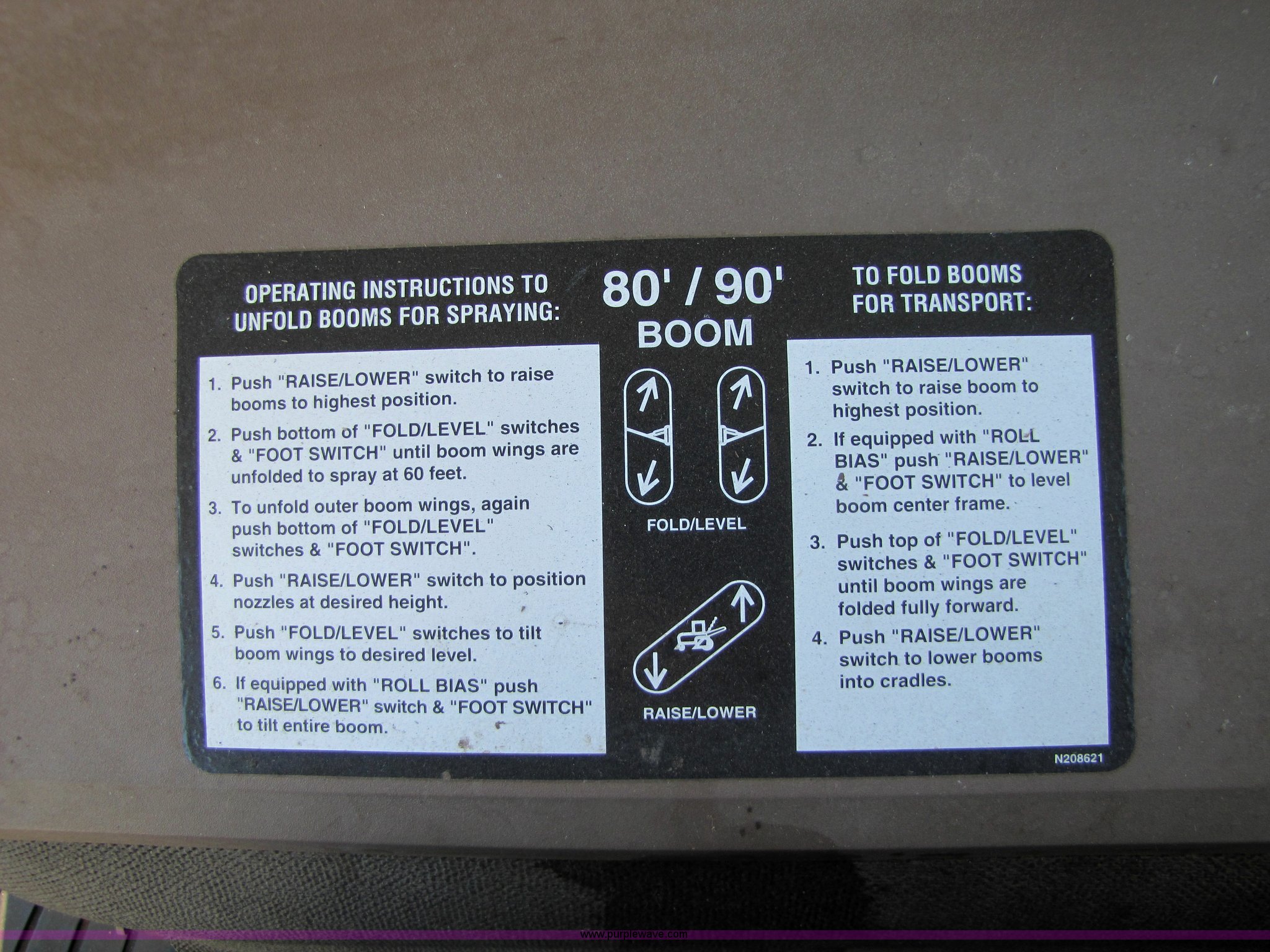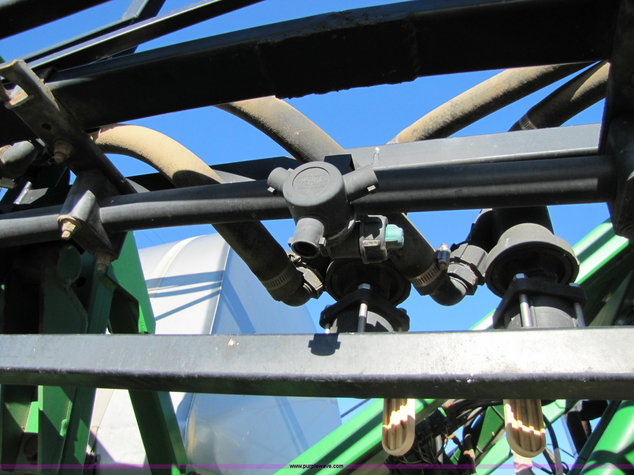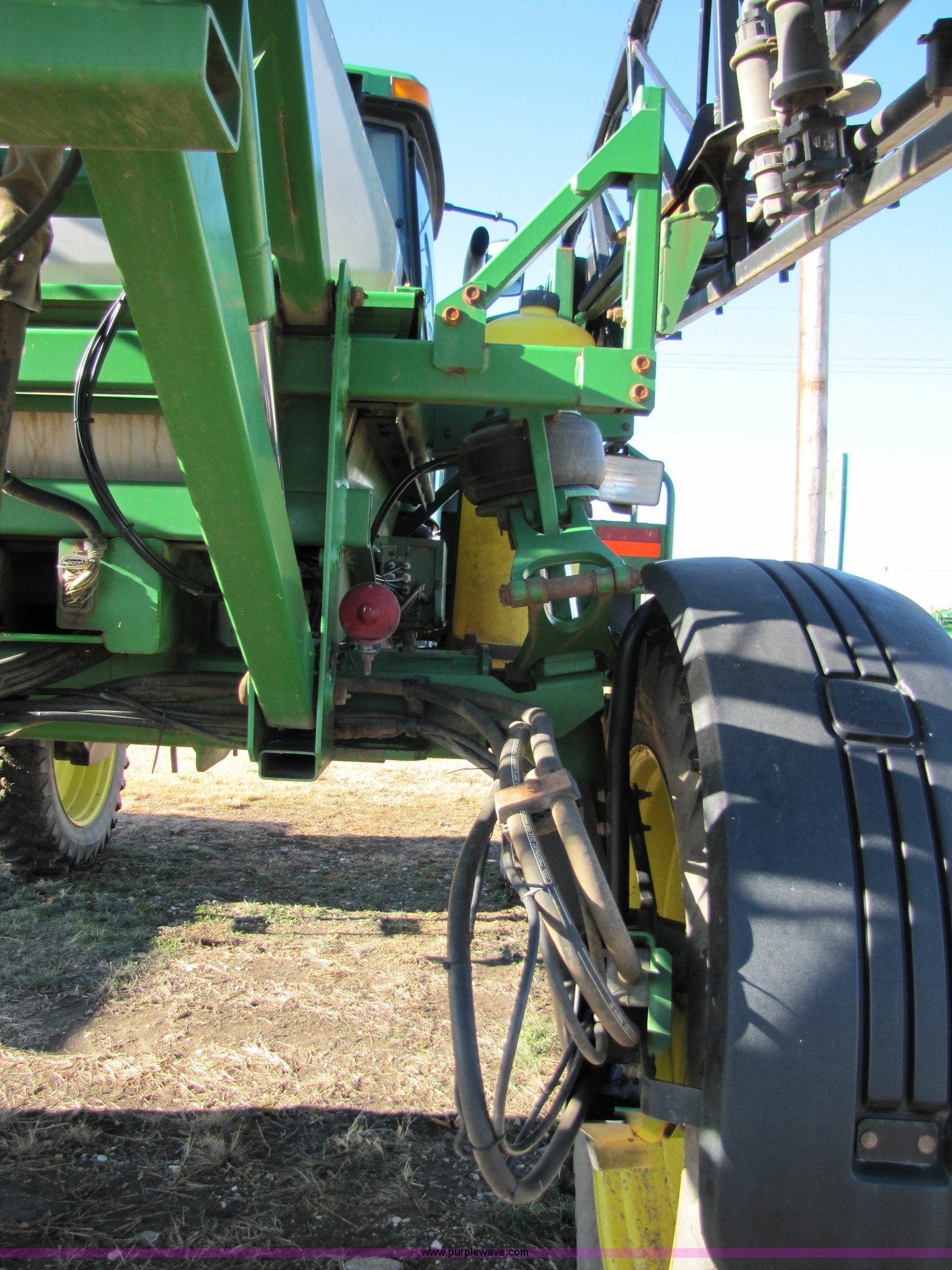 Purple Wave is selling a used Applicator Self Propelled in Kansas. This item is a 2002 John Deere 4710 self-propelled sprayer with the following: 4421 hours on meter, John Deere six cylinder 6.8L 200hp diesel engine, Hydrostatic transmission, Four wheel drive, 90' five section boom, 750 gallon stainless steel tank, 300 gallon rinse tank, Three way nozzles, 20" nozzle spacing, Tank agitator, Chemical inductor, Belly shield, Work lights, Foam marker, Cab with AC and heat, AM/FM/cassette player, John Deere monitor, Display partially obscured by dead pixels, Outback valve for AutoTrak, valve only, No guidance system, 380/R46 tires with fenders, Hydraulic tread adjustment, Serial N04710X0024046, ID# U04585