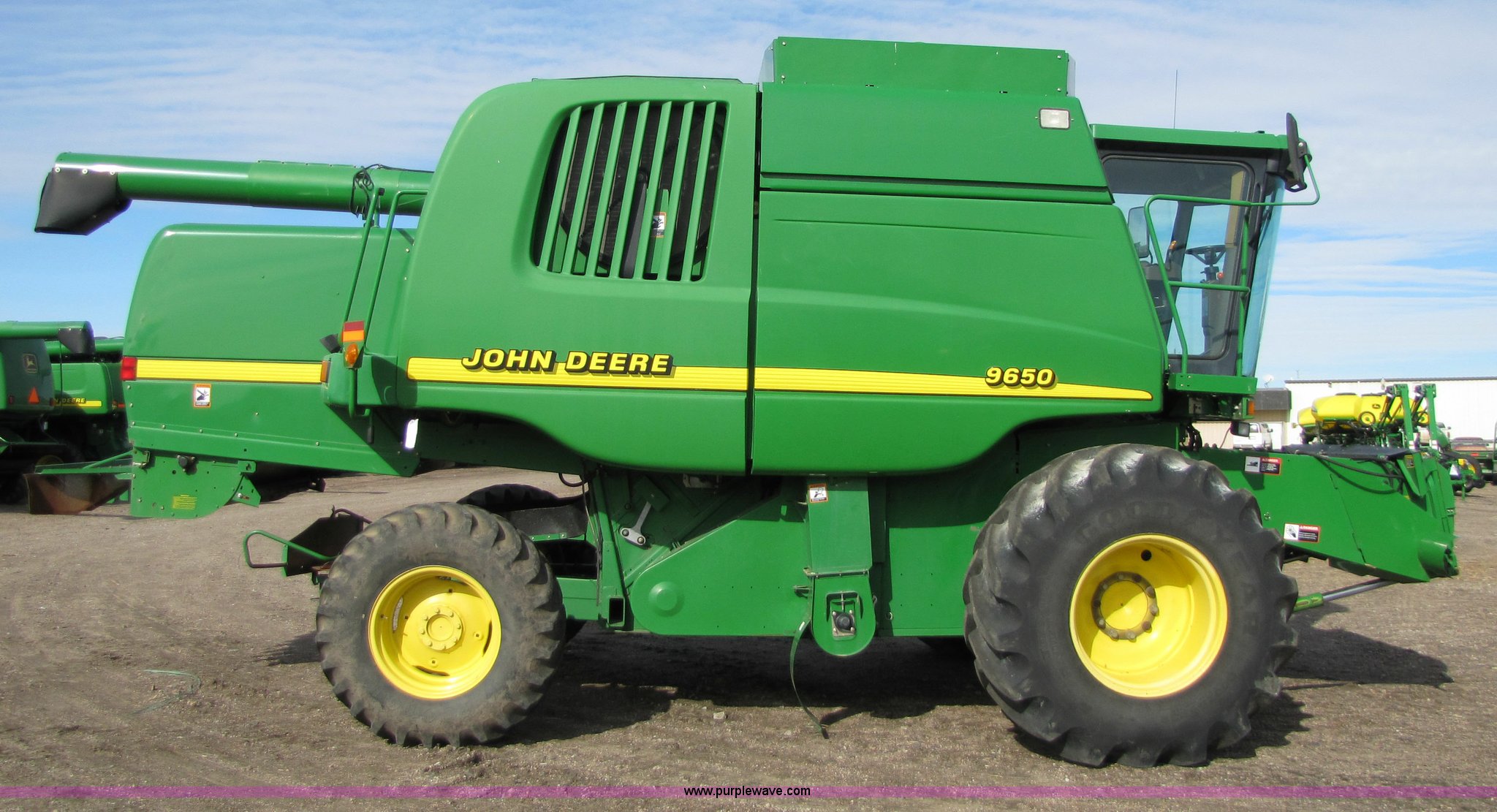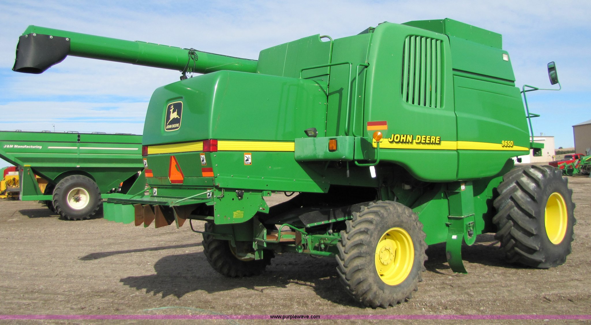Purple Wave is selling a used Combine in Kansas. This item is a 2000 John Deere 9650W combine with the following: 3589 engine hours on meter, 2245 separator hours on meter, John Deere six cylinder 496 275hp diesel engine, Serial RG6081H200038, Hydrostatic transmission, AC and heat, AM/FM/CD player, Instructors seat, Contour master system, Displays include moisture sensor, grain tank, yield, area harvested, rotor speed and clearance, Road and work lights, Header height sensing, Dial speed reel, 20' unload auger, Hi/low unload rate, Straw chopper, John Deere double chaff spreader, Corn/bean, 800/65R32 front tires, 16.9-26 rear tires, Serial H096S0W686297, ID# U05280
