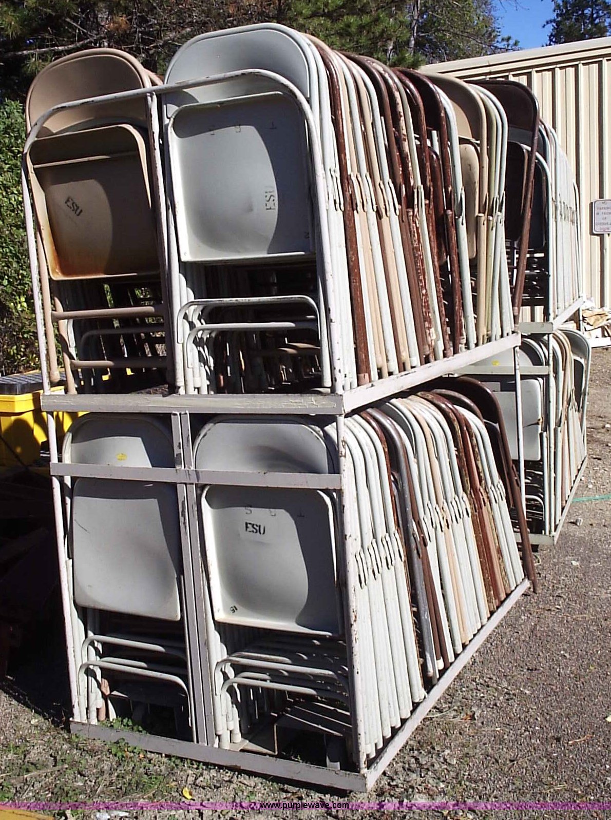 Purple Wave is selling a used Furniture in Kansas. This item is a (220) metal folding chairs with storage racks with the following: (220) metal folding chairs with storage racks. Emporia State University. 1200 Commercial St. Emporia, KS 66801