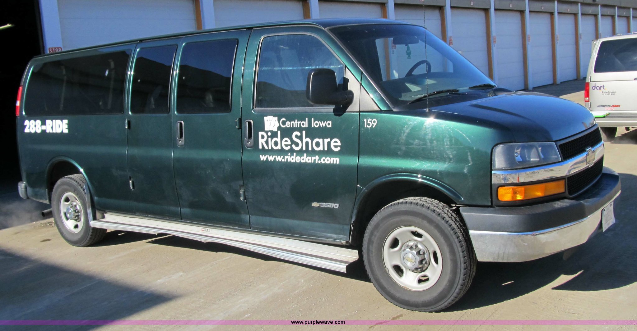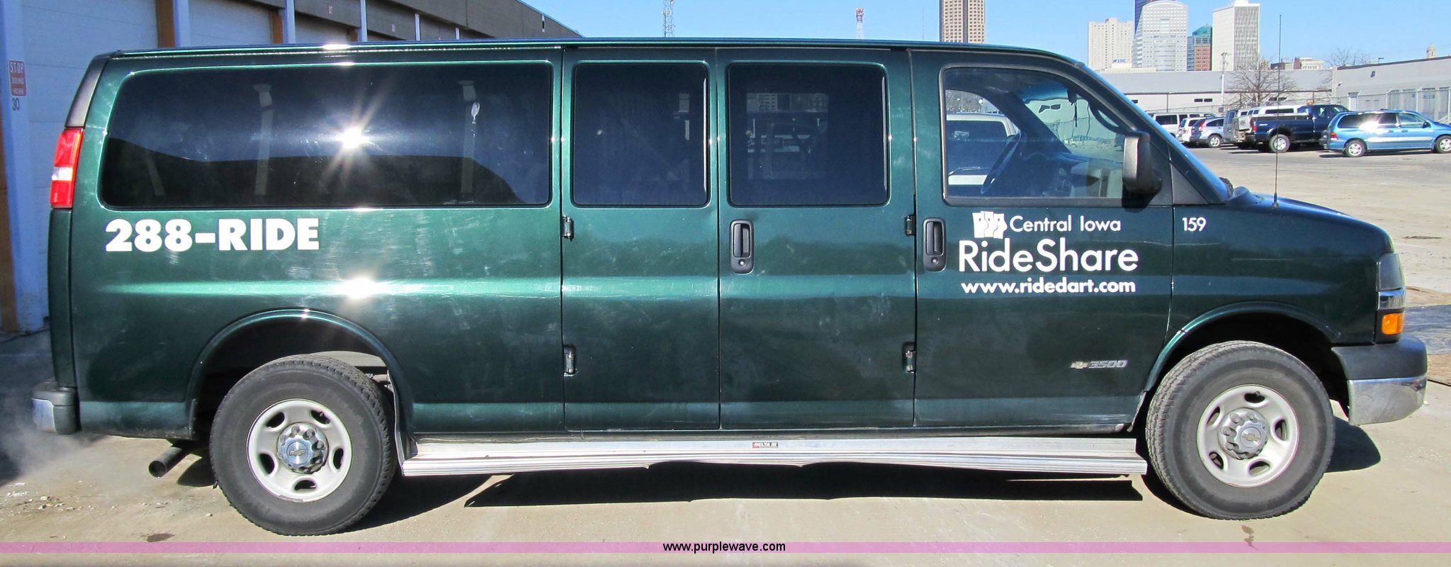 2005 Chevrolet G3500 Express Stabiltrak van. 164,109 miles on odometer, 6.0L V8 SFI, Automatic transmission, Heater and air conditioner, Tilt and cruise control, AM/FM radio, Power windows, locks and mirrors, Three-row seating, Dual side air bags, LT245/75R16, Door side seized, ID 159. Title distribution may be delayed up to 14 days from verification of funds. 1GAHG39U551207614. Des Moines DART. 1100 Dart Way. Des Moines, IA 50313