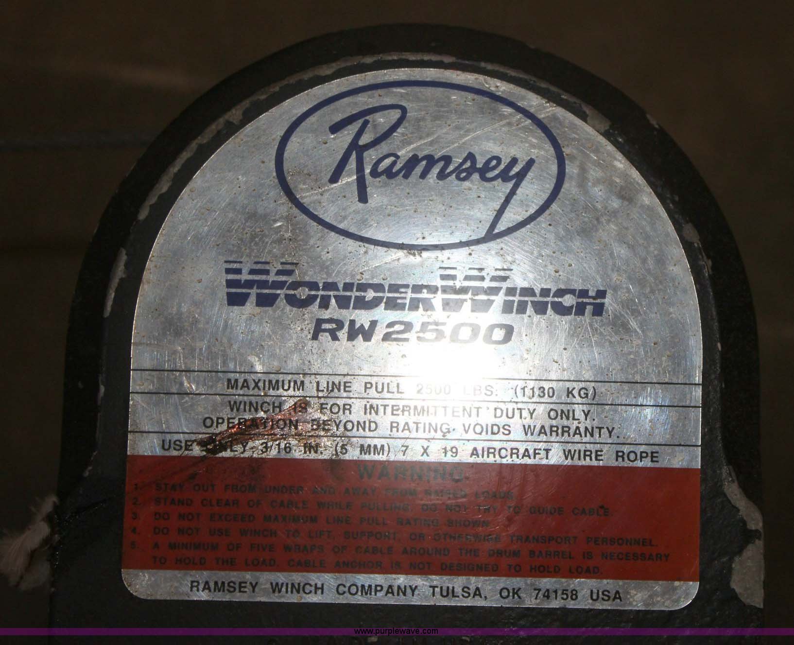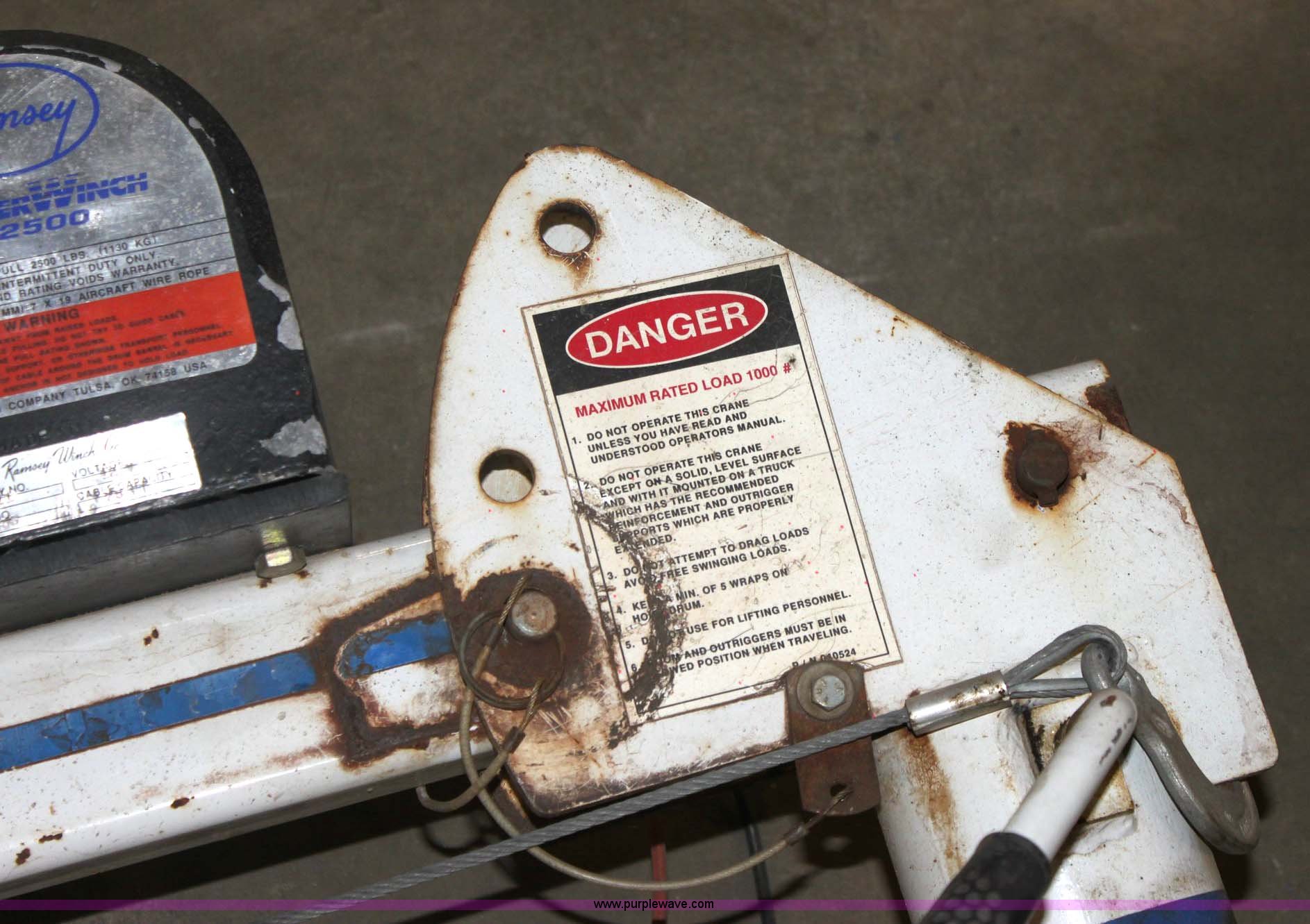 Purple Wave is selling a used Automotive Parts or Acces. in Kansas. This item is a Auto crane with the following: Ramsey 2500 lbs wonder winch, 25' cable capacity, 12 volt, 1000 lb maximum crane capacity, 46" boom, Missing switch
