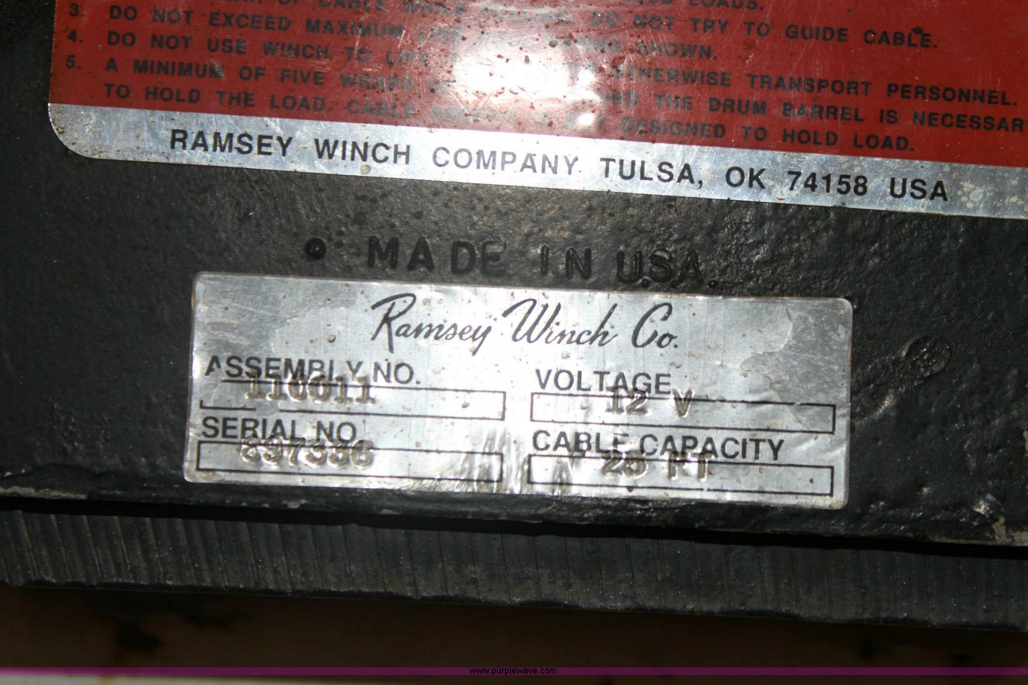 Auto crane. Ramsey 2500 lbs wonder winch, 25' cable capacity, 12 volt, 1000 lb maximum crane capacity, 46" boom, Missing switch. Reno County Public Works. 600 Scott Blvd.. South Hutchinson, KS 67505