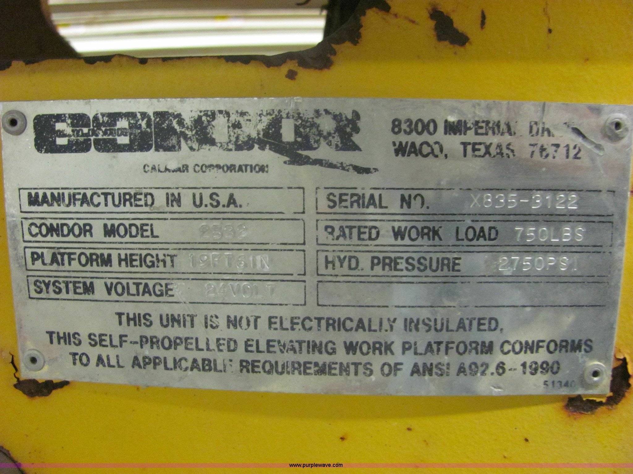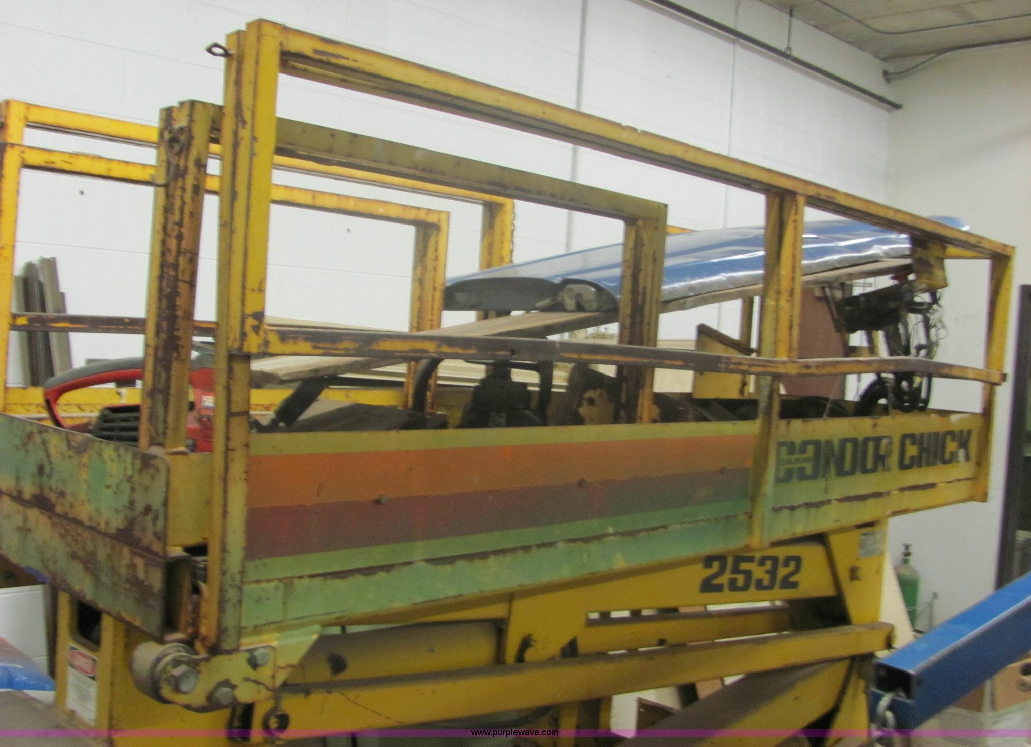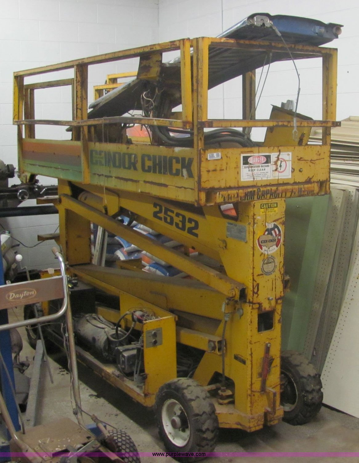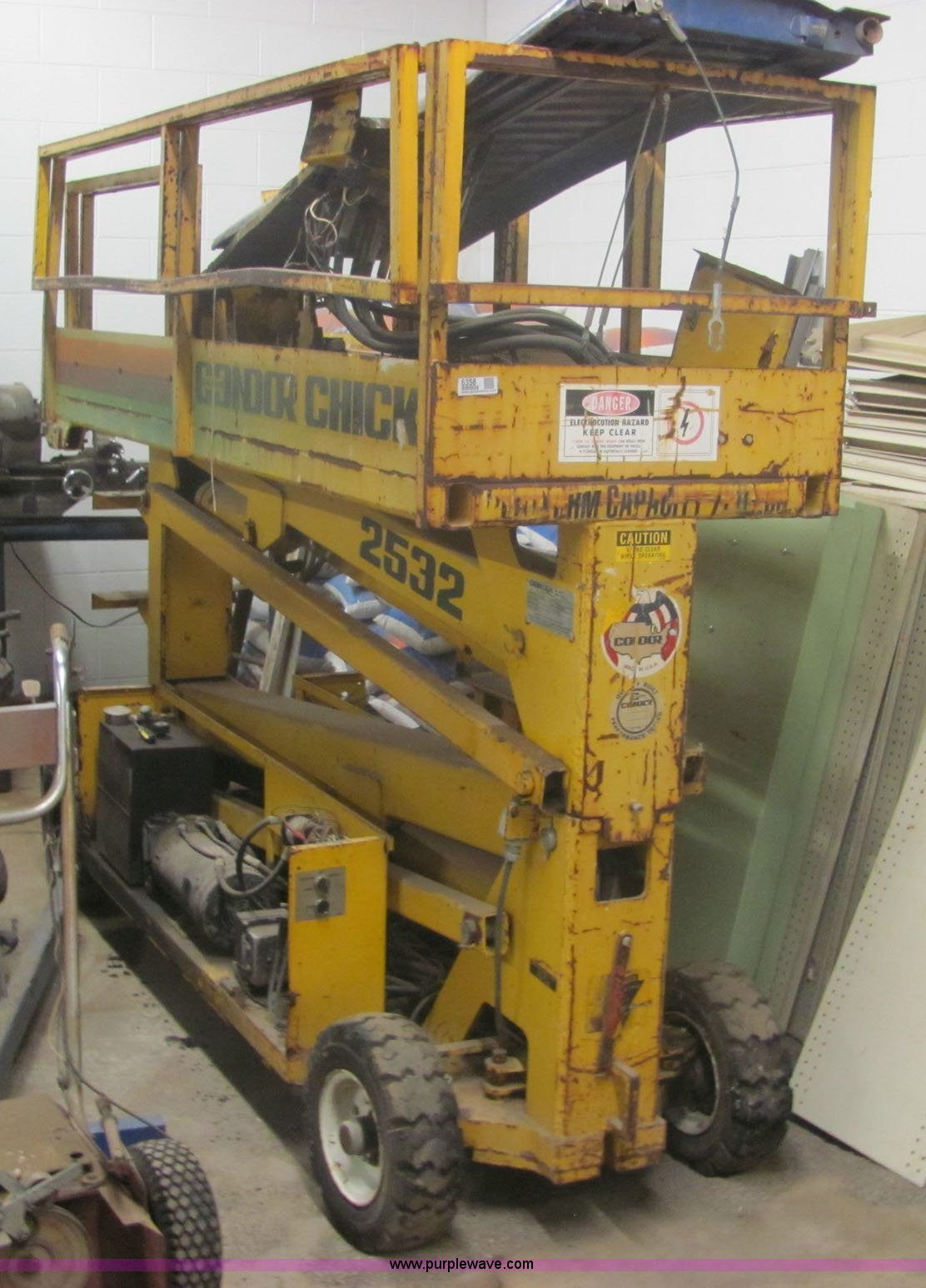 Purple Wave is selling a used Scissor or Vertical Lift in Kansas. This item is a Condor Chick 2532 scissor lift with the following: 24 volt system, 19.5' max platform height, 750 lbs rated workload, Does not lift fully, Hydraulic system does not function correctly, Serial X835-3122
