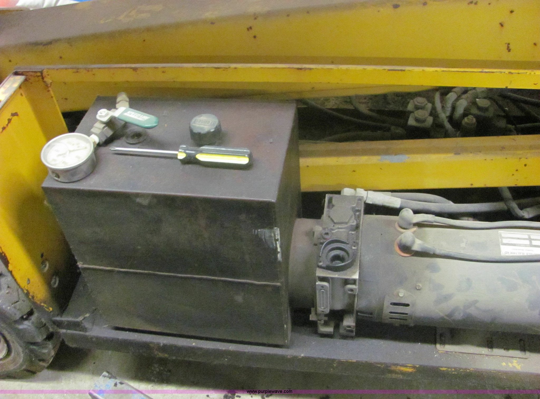 Condor Chick 2532 scissor lift. 24 volt system, 19.5' max platform height, 750 lbs rated workload, Does not lift fully, Hydraulic system does not function correctly, Serial X835-3122. Central Christian College. 1200 S Main. McPherson, KS 67460