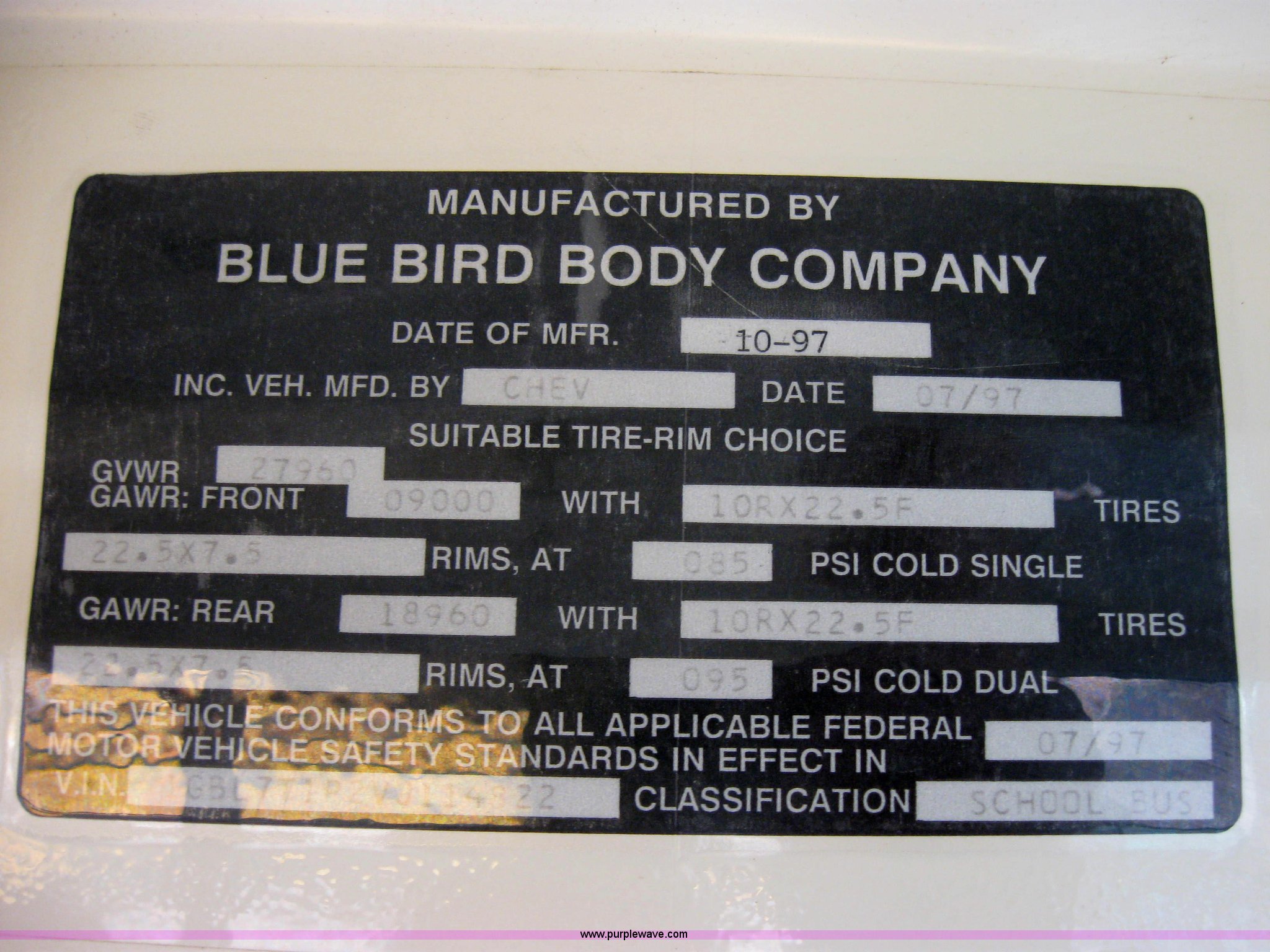 Purple Wave is selling a used Bus in Kansas. This item is a 1998 Chevrolet B7 Blue Bird school bus with the following: 197,104 miles on odometer, GM V8, 6.0L (366 CID) gas engine, Automatic transmission, 59 passenger, Heat, AM/FM/cassette player, GVWR 27,960 lbs, 10R22.5 tires, Blue Bird# M84254, Unit # 11