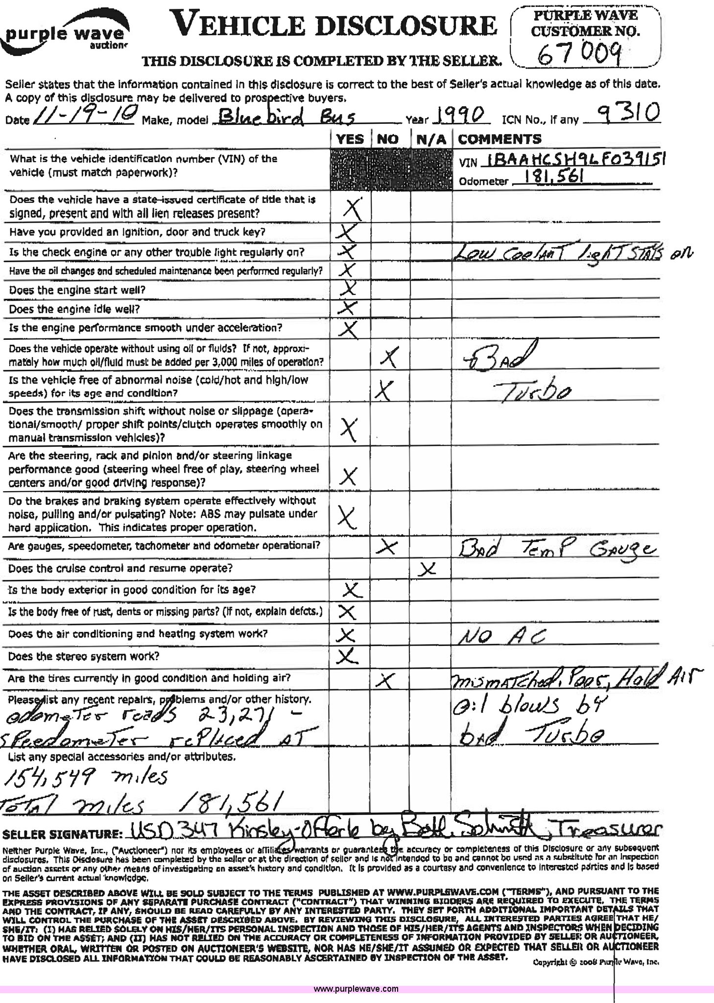 Purple Wave is selling a used Bus in Kansas. This item is a 1990 Blue Bird school bus with the following: 181,561 miles on odometer, Cummins L6, 5.9L (359 CID) diesel engine, Automatic transmission, Heat, Side window and rear emergency egress, Low coolant light on, Temperature gauge inoperable, Oil blows by bad turbocharger