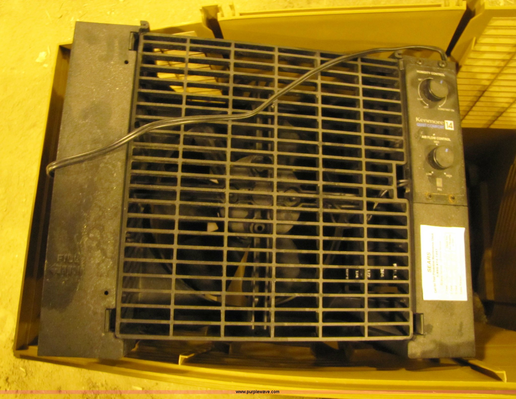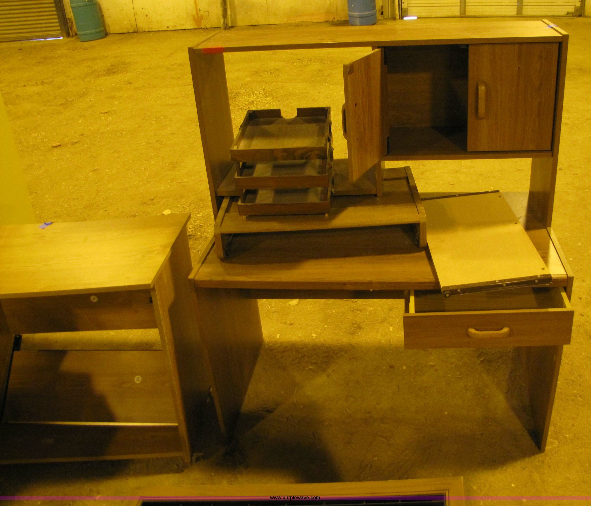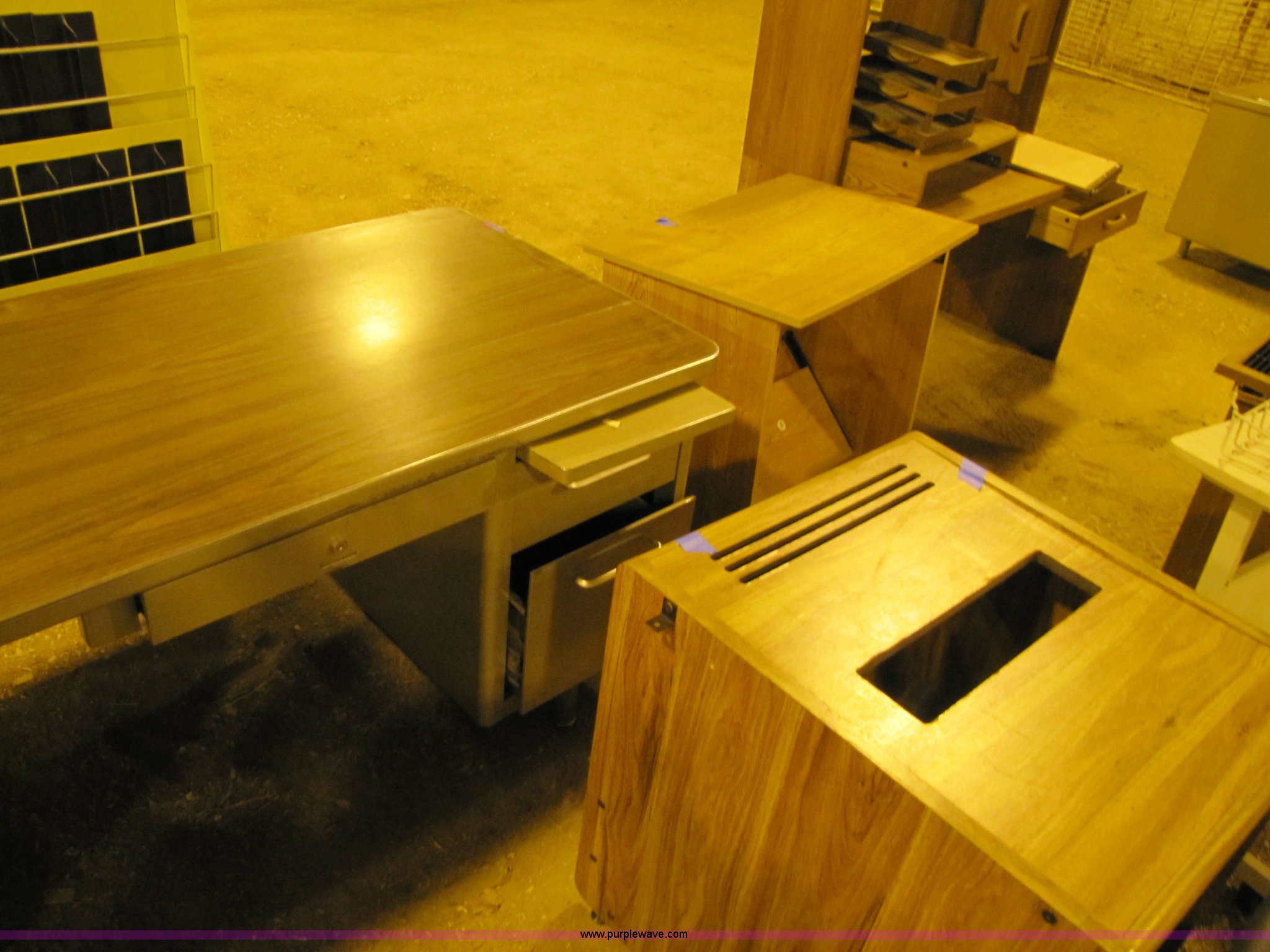Purple Wave is selling a used Furniture in Kansas. This item is a Assorted Office furniture with the following: (2) desks, (4) printer stands, (3) rolling chairs, Magazine rack, Kenmore Quiet Comfort air conditioning, Cosmetic damage