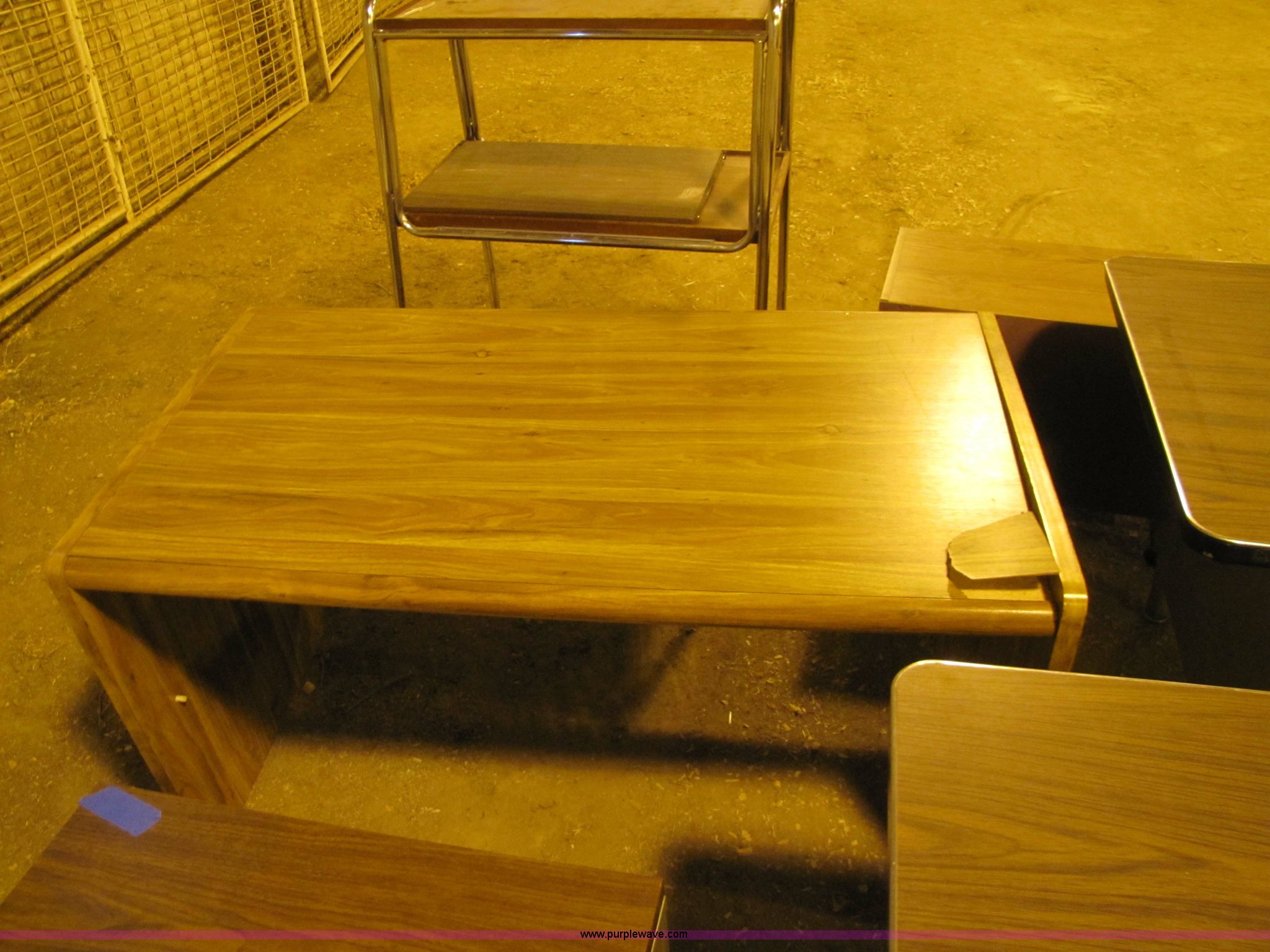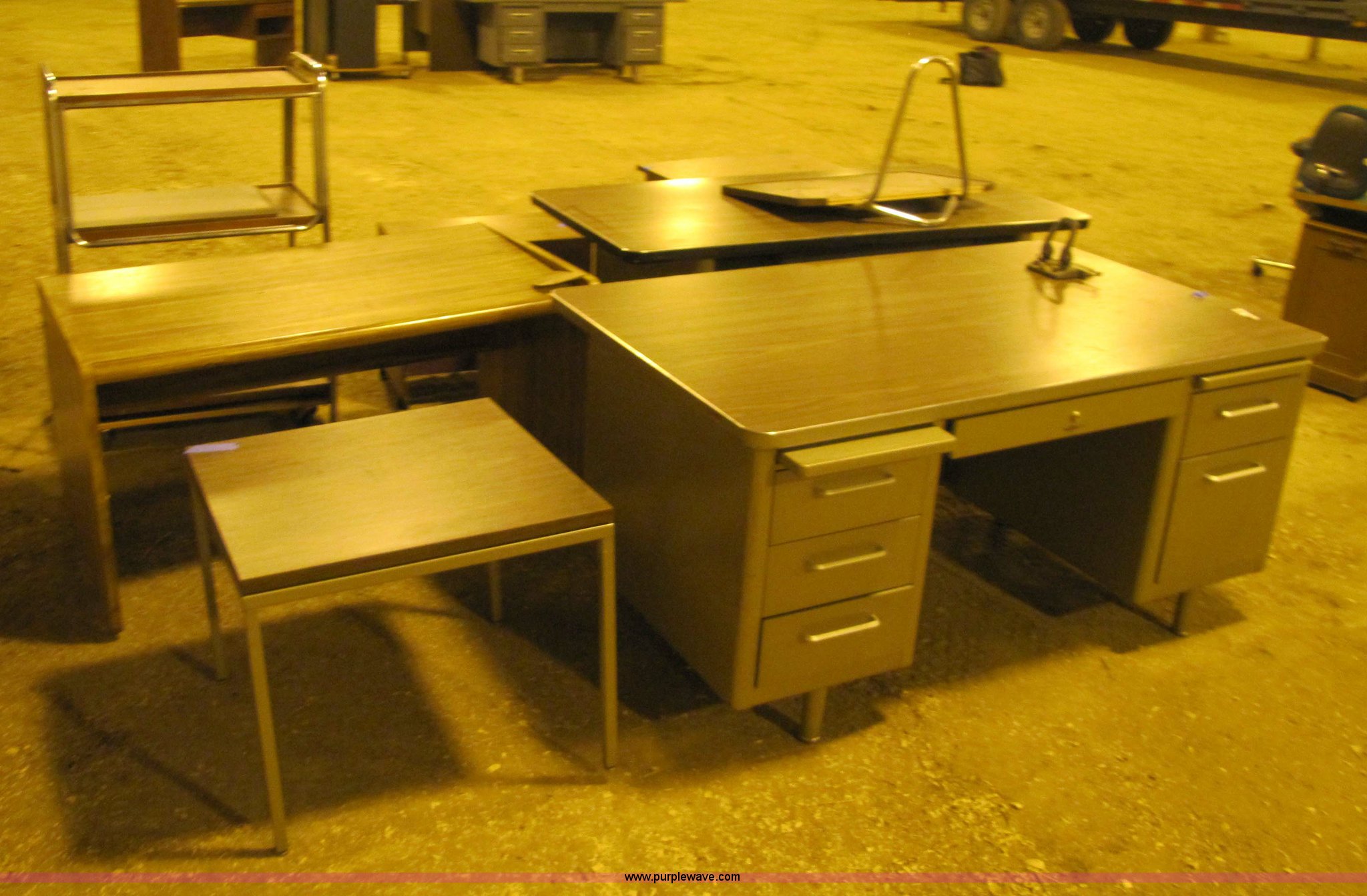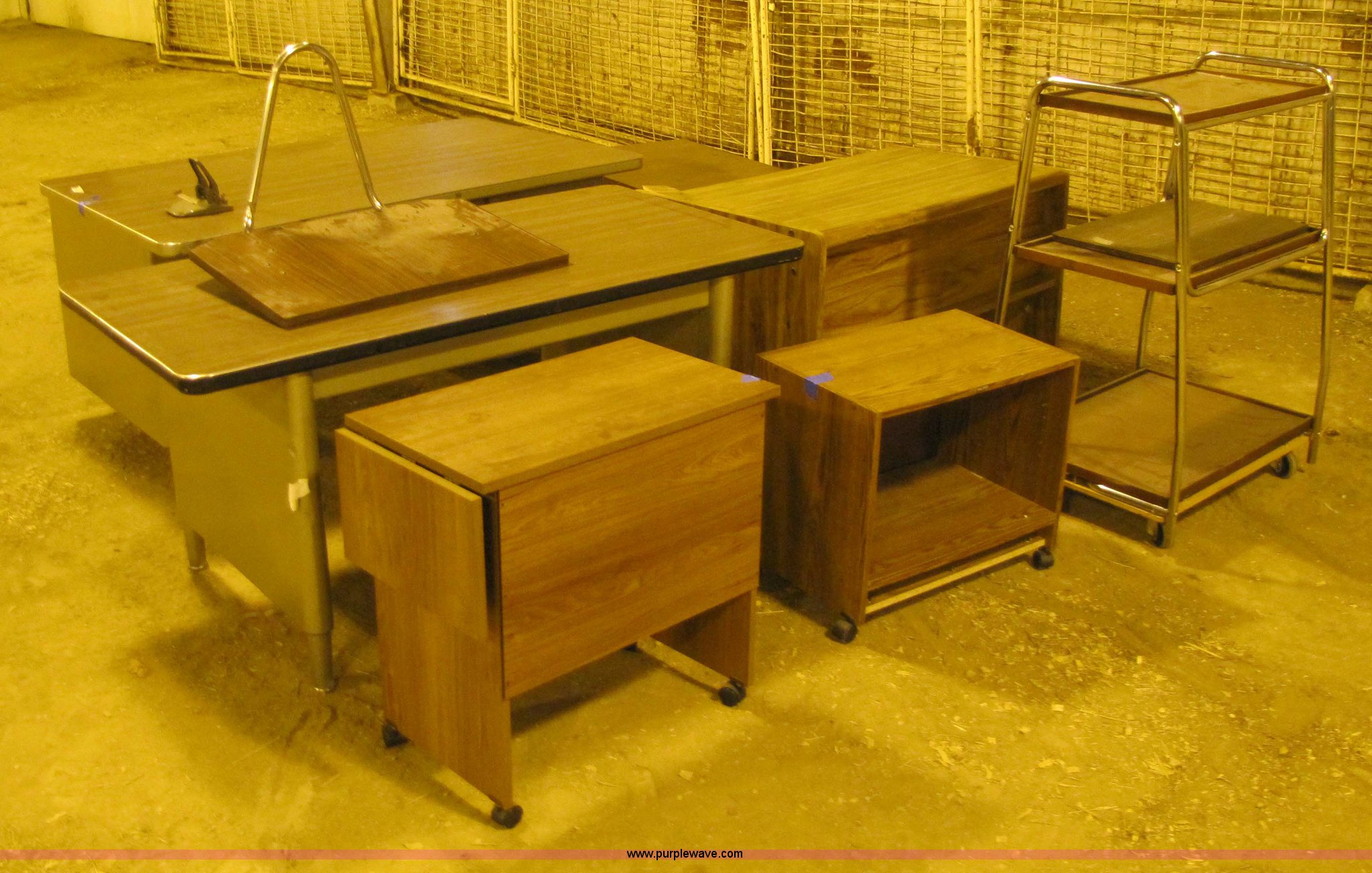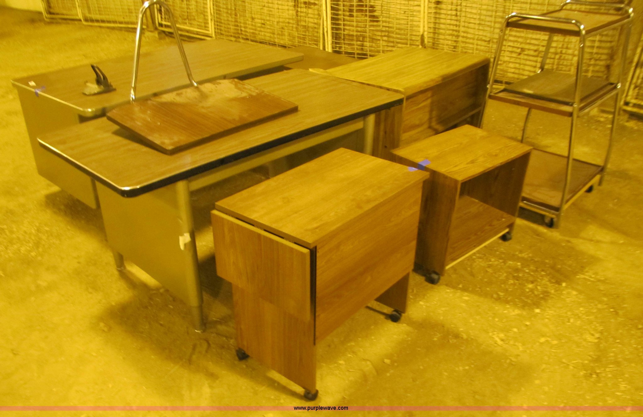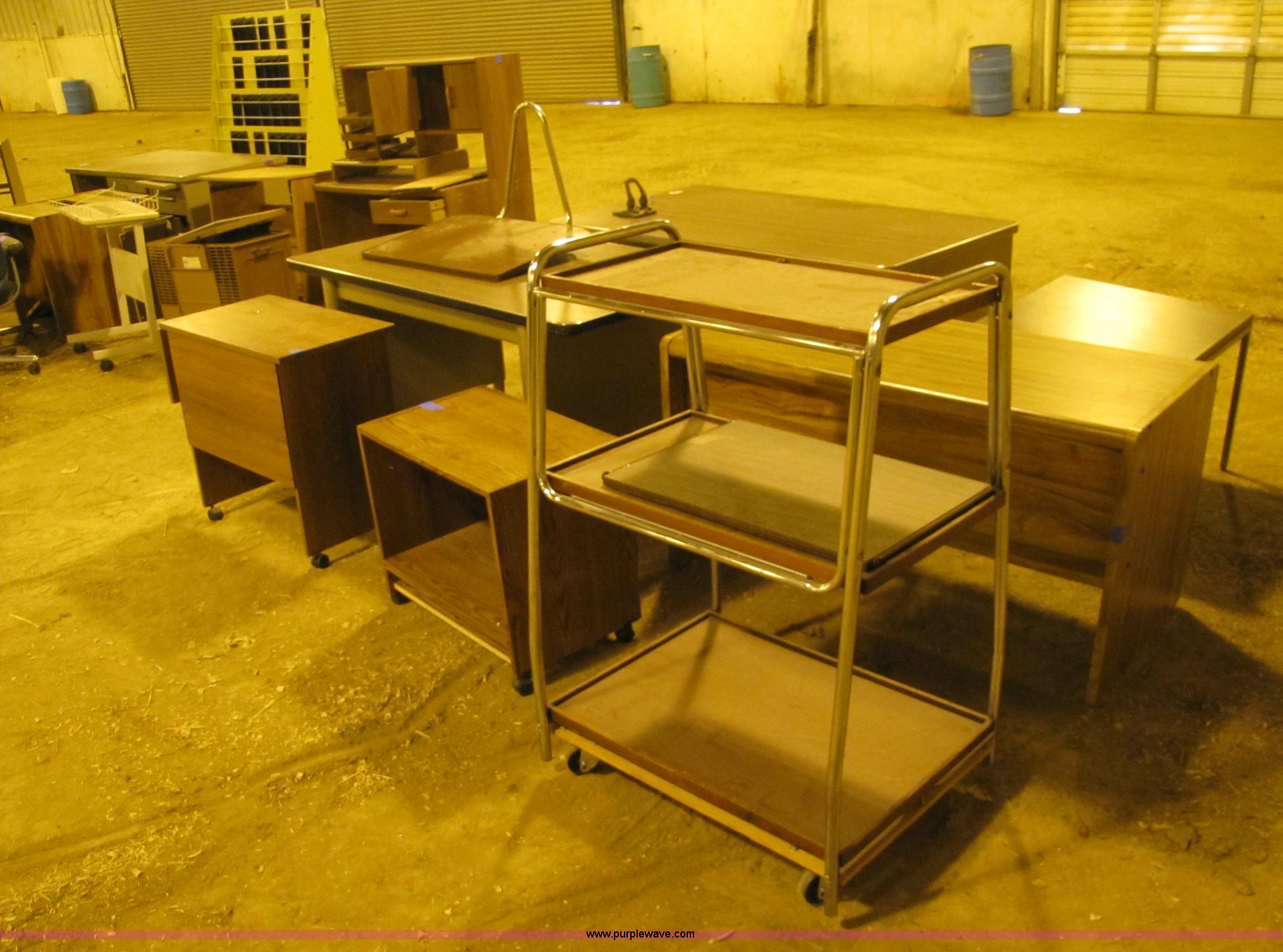 Purple Wave is selling a used Furniture in Kansas. This item is a Assorted office furniture with the following: (3) desks, (2) tables with casters, Media cart, Table, One desk has broken corner