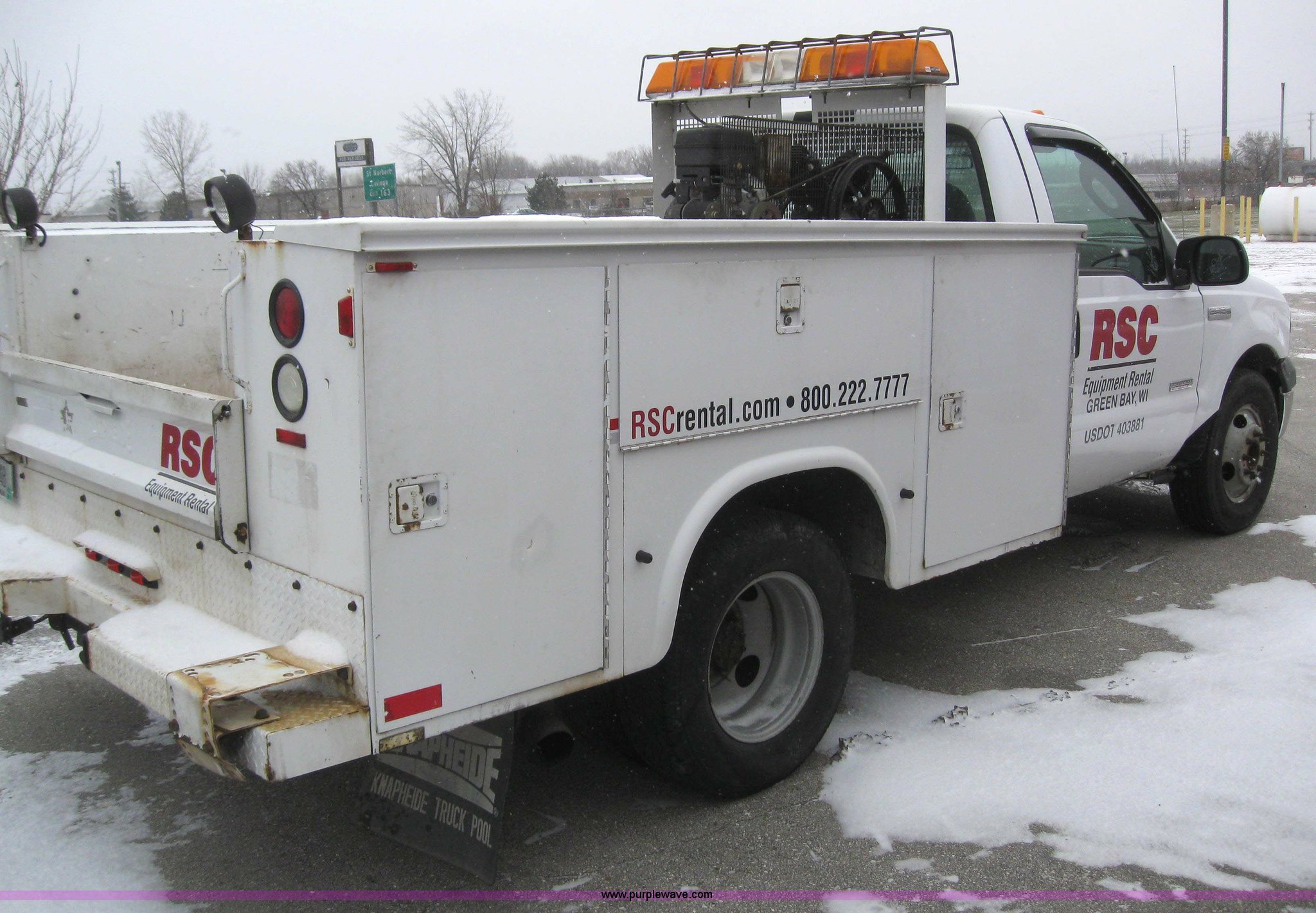 2005 Ford F350 Super Duty service truck. 168,546 miles on odometer, Navistar V-8 6.0L diesel engine, Automatic transmission, AC and heat, Tilt steering wheel, Cruise control, AM/FM radio, Manual windows and locks, Receiver hitch, Block heater, Utility bed, Champion portable air compressor, LT245/75R17 tires, Head gasket leaks, EIN 542455. Completed temporary storage agreement required on payment. 1FDWF36P75EB58002. Shipping quotes available. RSC Equipment Rental Green Bay. 3161 Market St. Green Bay, WI 54304