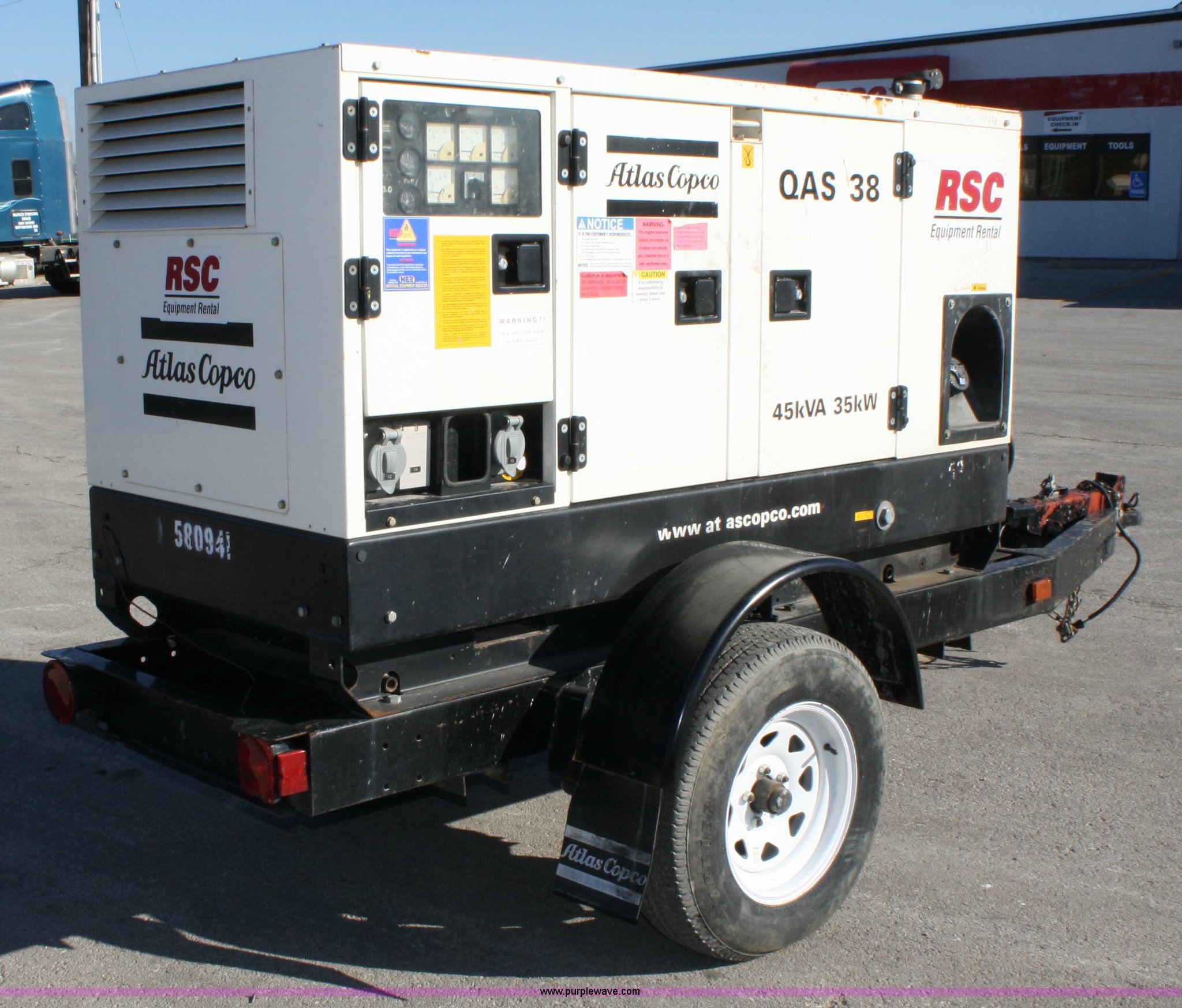 Purple Wave is selling a used Generator Set in Kansas. This item is a 2005 Atlas Capco QAS38 generator with the following: 10962 hours on meter, Yanmar 3.319L four cylinder 50hp diesel engine, Single or three phase power, 45KVA, 35kw, 2" ball hitch, Trailer brakes, Serial 013525, EIN 580941