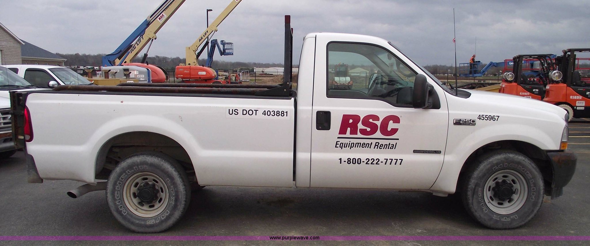 2002 Ford F250 XL Super Duty pickup truck. 141,607 miles on odometer, 7.3L V8 DI diesel engine, Automatic transmission, AC and heat, AM/FM radio, Manual windows and locks, Vinyl seats, Rubber floor, Electric brake controller, Receiver hitch, Trailer wiring, Spray in bed liner, Headache rack, Steel bed rails, Front tow hooks, Tommy Lift gate 1,000 lbs capacity, 265/75R16 tires, Scratches and dents, Needs ball joints, EIN 455967. Completed temporary storage agreement required on payment. 1FTNF20F32ED64505. Shipping quotes available. RSC Equipment Rental Collinsville. 5076 Mid American Ct. Collinsville, IL 62234