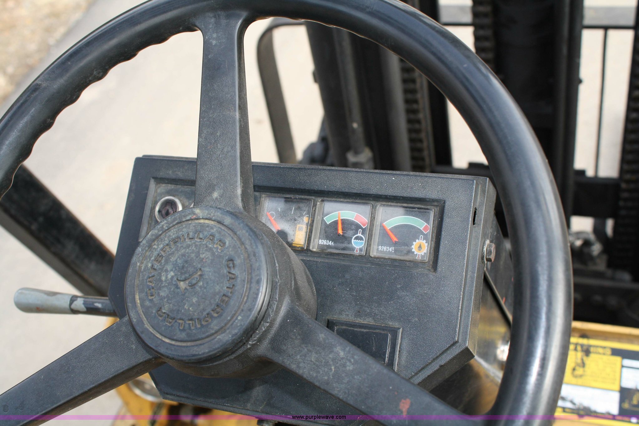 Purple Wave is selling a used Cushion Tire or Pneumatic Forklift in Kansas. This item is a Caterpillar V50D forklift with the following: 9382 hours on meter, Four cylinder propane or gas engine, 5,000 lbs capacity, Three stage mast, 42" forks, Side shift, Propane bottle included, Serial 35C3781
