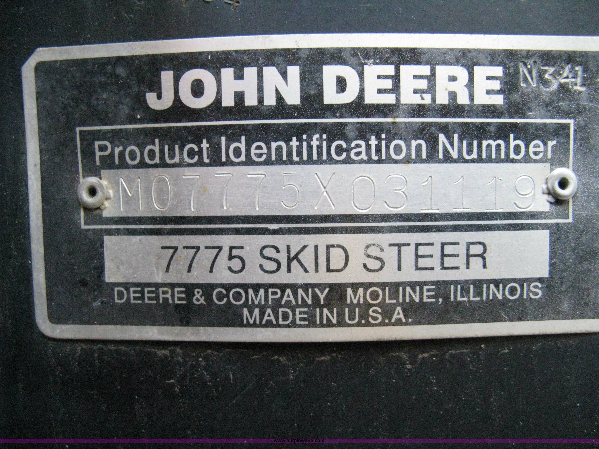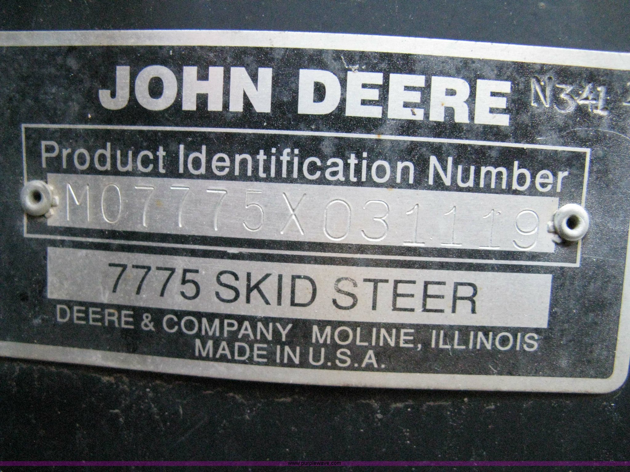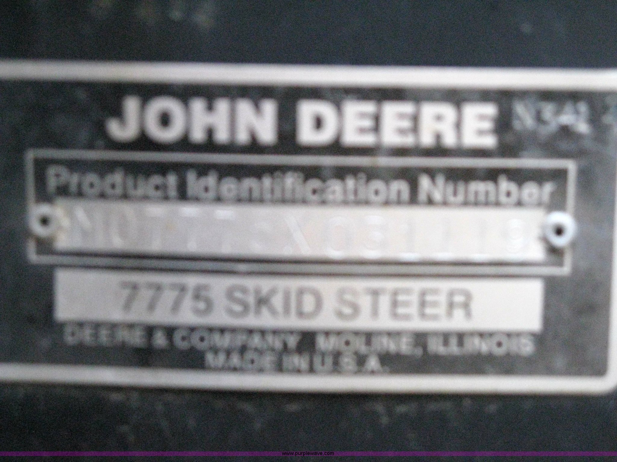 Purple Wave is selling a used Skid Steer Loader in Kansas. This item is a 1998 John Deere 7775 skid steer with the following: 2966 hours on meter, John Deere Series 220 49hp diesel engine, Enclosed cab, AC and heat, Auxiliary hydraulics, Quick attach loader, 66" bucket, Serial J003406, 1,705 lbs capacity, 5,405 lbs. base operating weight, Rear weights, New seat ordered and will be available at time of auction, No front entry door, Missing left side sliding glass, Serial M07775X031119