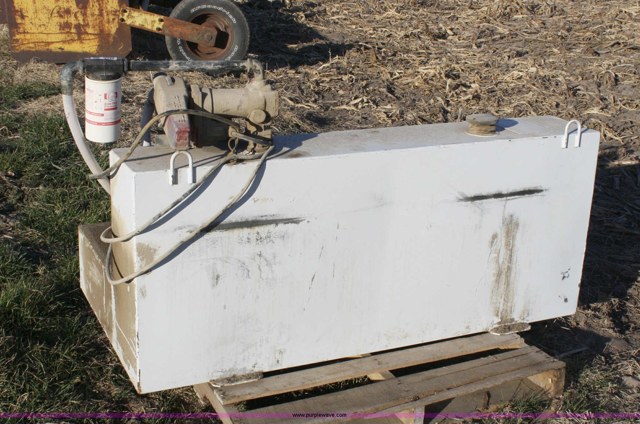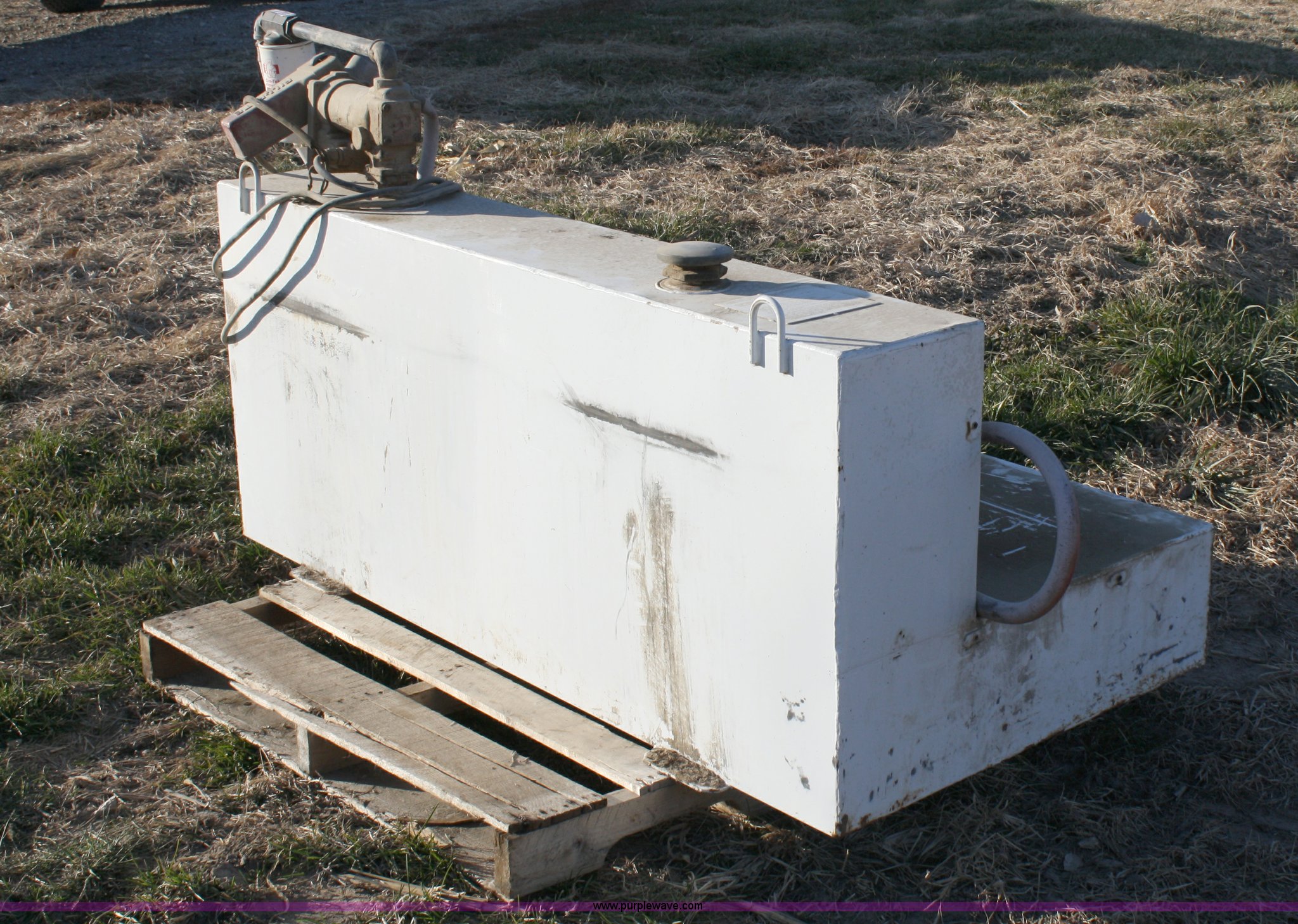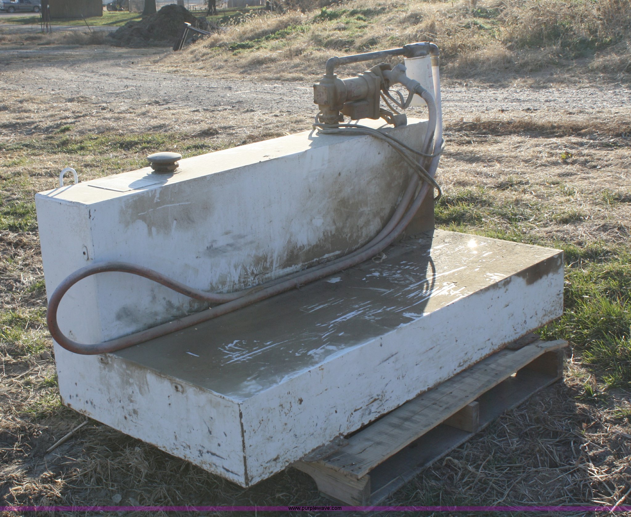 Purple Wave is selling a used Fuel and Lube in Kansas. This item is a 105 gallon L-shaped fuel tank with pump with the following: 12 volt Fill-Rite pump