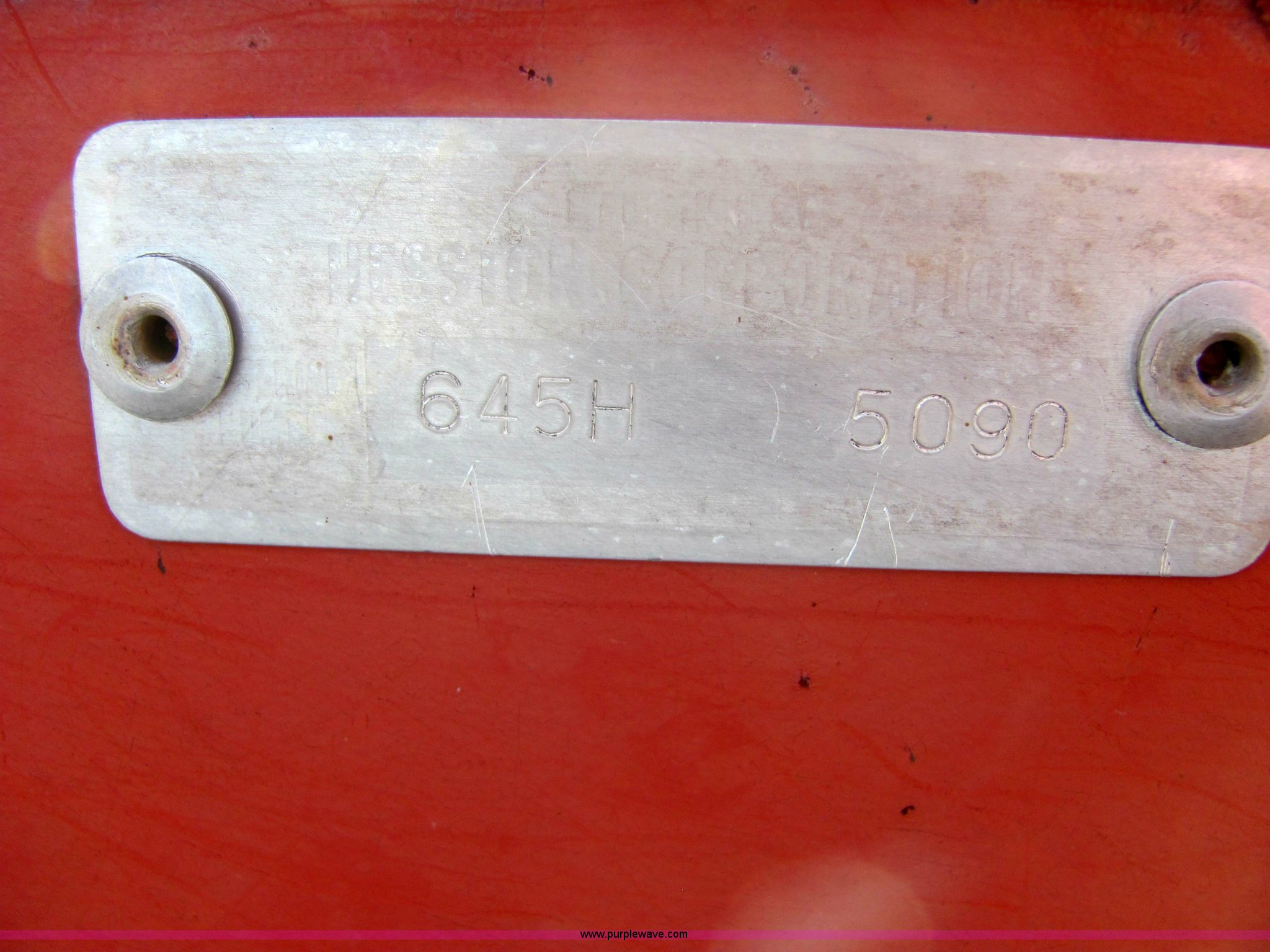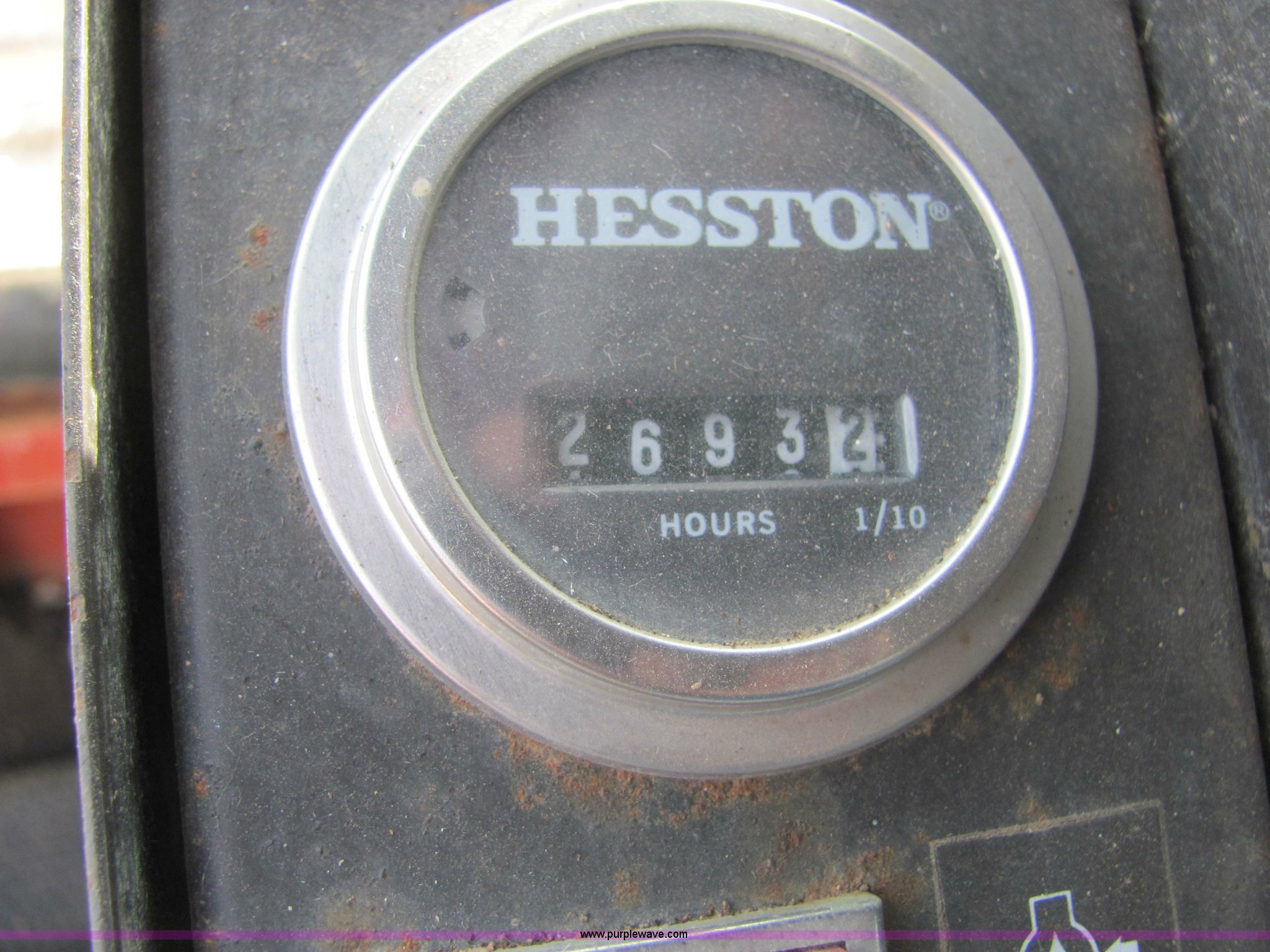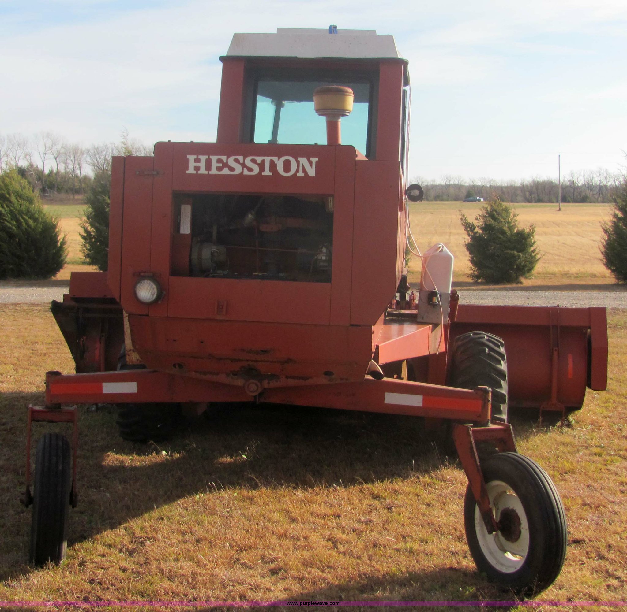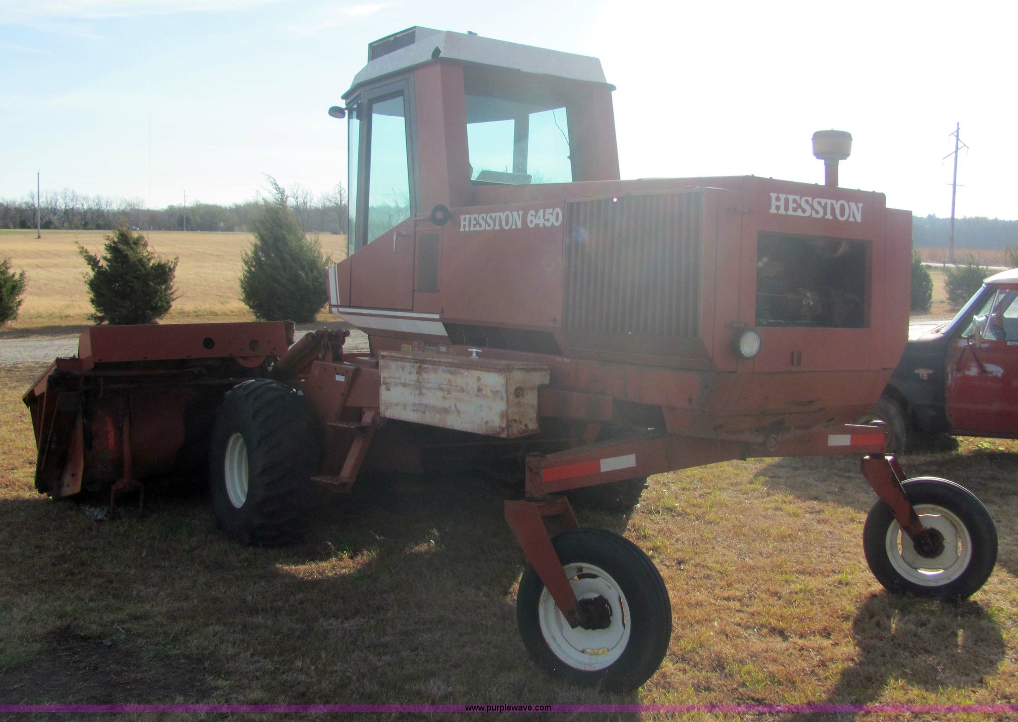 Purple Wave is selling a used Windrower Self Propelled in Kansas. This item is a Hesston 6450 self-propelled swather with the following: 2693 hours on meter, Six cylinder 300cid gas engine, Enclosed cab with AC, Needs AC lines and compressor, Radio, Swamp cooler, 13.50-16.1 front tires, 5.90-15 rear tires, 14' header, Serial 645H5090, Recently replaced batteries, Serial 645T4175