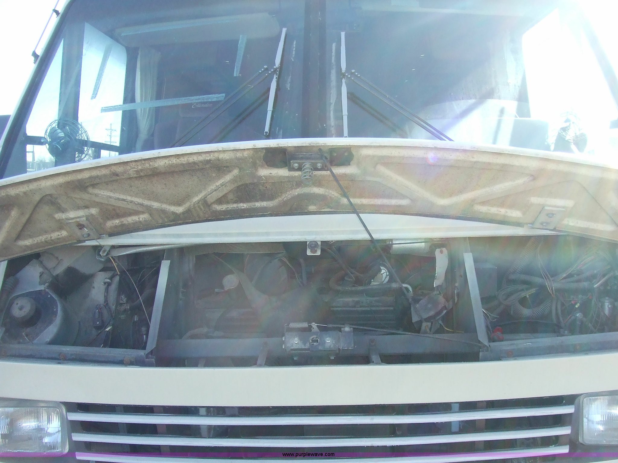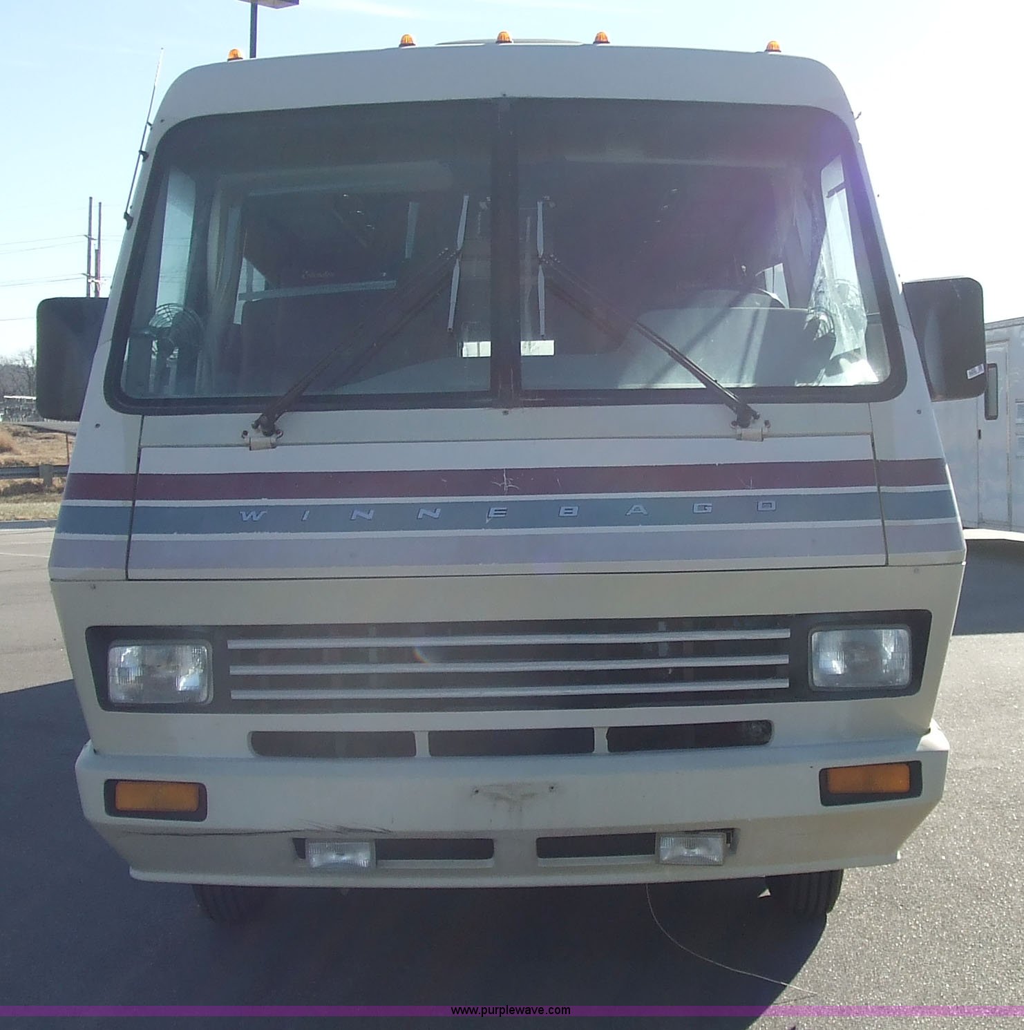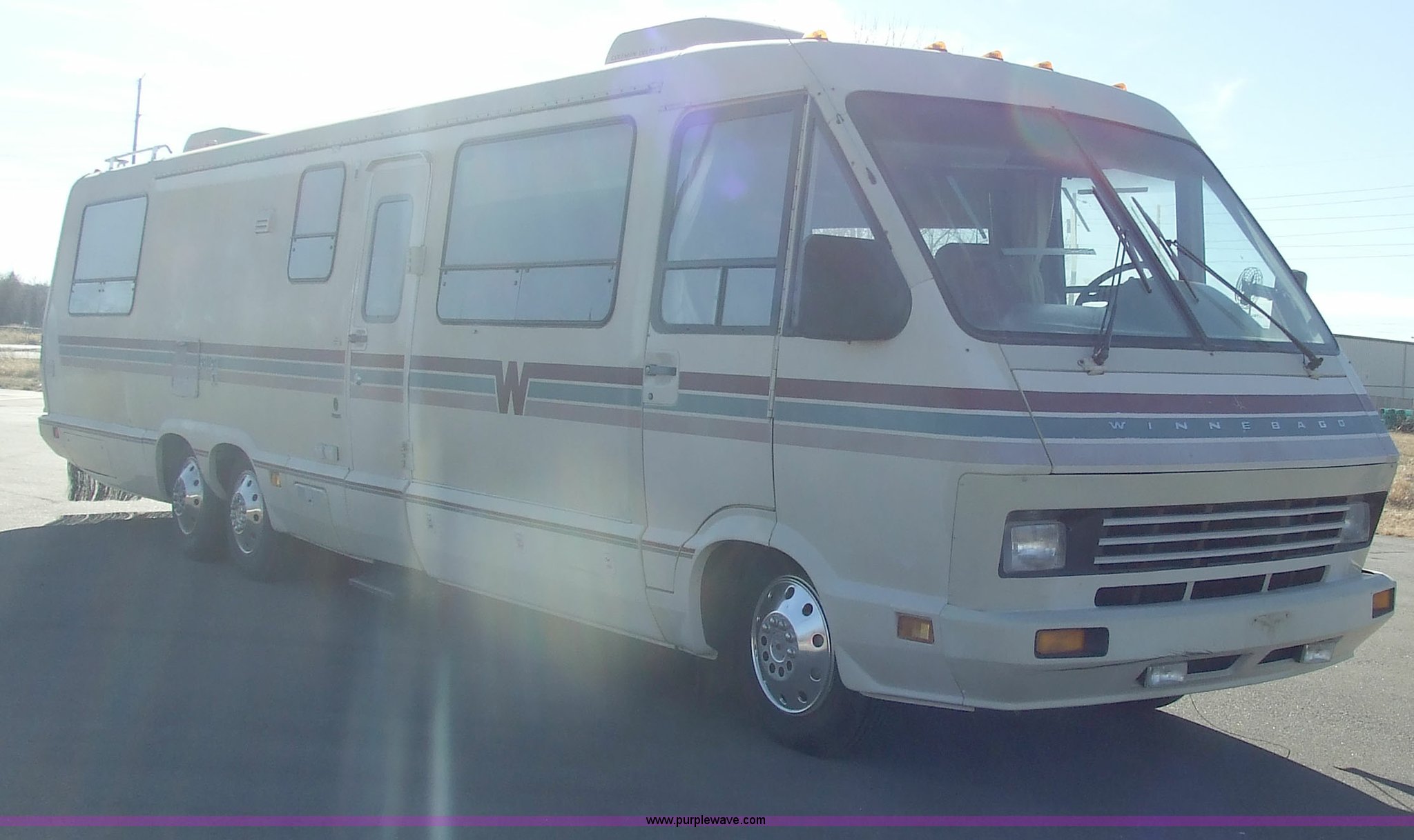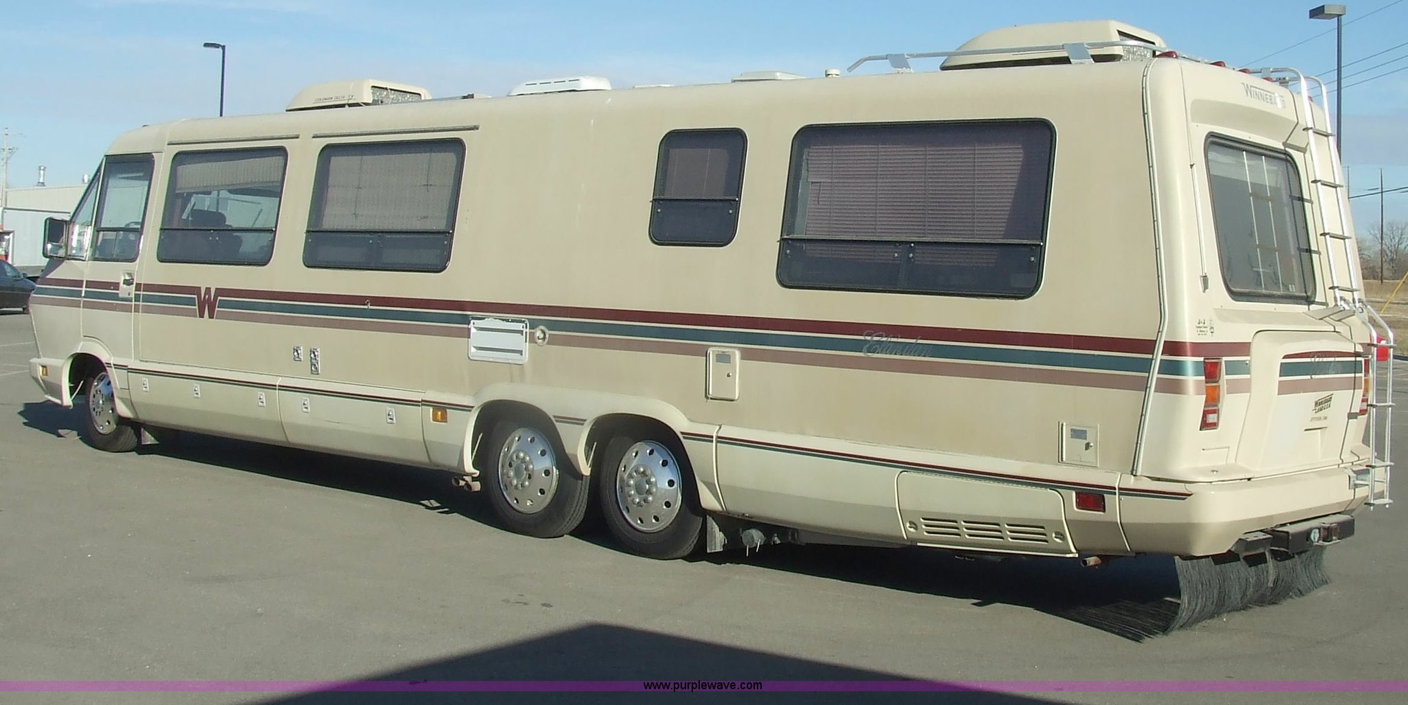 Purple Wave is selling a used RV in Kansas. This item is a 1987 Chevrolet Elandan 33' Winnebago with the following: 54,792 miles on odometer, V8 7.4L gas engine, Automatic transmission, Receiver hitch, Trailer wiring, MVP body, Model: WCP37RQ, Serial: 10p85x269780, GVWR: 17,000lbs, AC and heat, Tilt steering wheel, Cruise control, AM/FM/cassette player, Manual windows and locks, 8R19.5 tires, 110-125V electrical connection, Water hookup, Sewage drainage, Hydraulic leveling system, Aux gen time: 227.2, New battery, Bedroom, Bed, Storage, Radio, Bathroom, Sink, Shower, Toilet, Storage, Kitchen, Fridge/Freezer, Sink, Stove, Microwave, Table, Couch, Two chairs, Overhead storage, Approx $7,000 recently spent on new tires, engine tune-up, and lighting