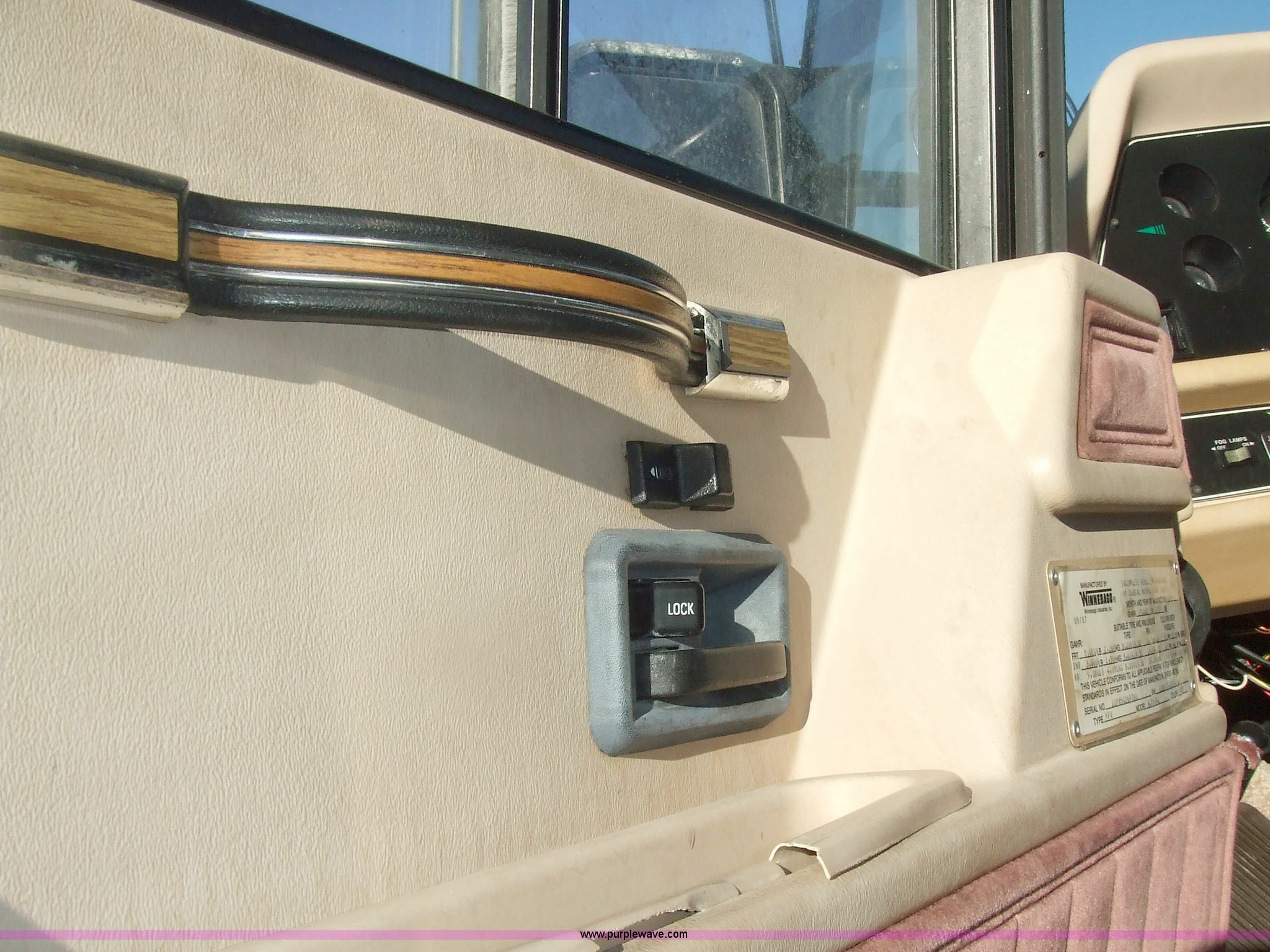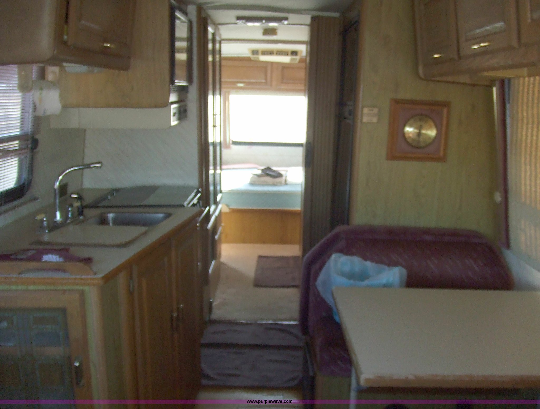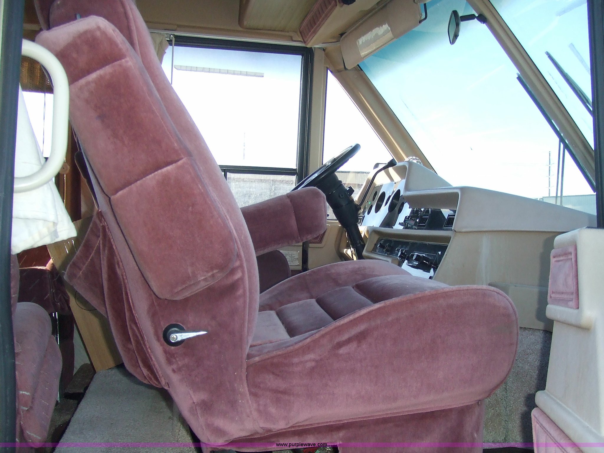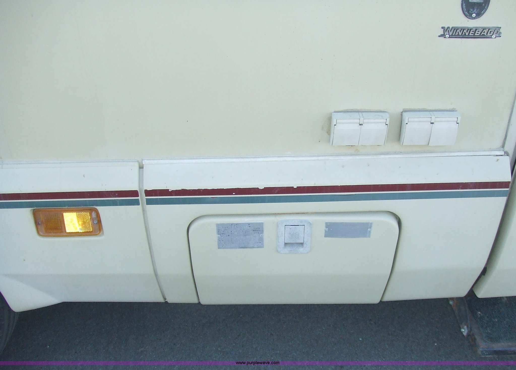Purple Wave is selling a used RV in Kansas. This item is a 1987 Chevrolet Elandan 33' Winnebago with the following: 54,792 miles on odometer, V8 7.4L gas engine, Automatic transmission, Receiver hitch, Trailer wiring, MVP body, Model: WCP37RQ, Serial: 10p85x269780, GVWR: 17,000lbs, AC and heat, Tilt steering wheel, Cruise control, AM/FM/cassette player, Manual windows and locks, 8R19.5 tires, 110-125V electrical connection, Water hookup, Sewage drainage, Hydraulic leveling system, Aux gen time: 227.2, New battery, Bedroom, Bed, Storage, Radio, Bathroom, Sink, Shower, Toilet, Storage, Kitchen, Fridge/Freezer, Sink, Stove, Microwave, Table, Couch, Two chairs, Overhead storage, Approx $7,000 recently spent on new tires, engine tune-up, and lighting