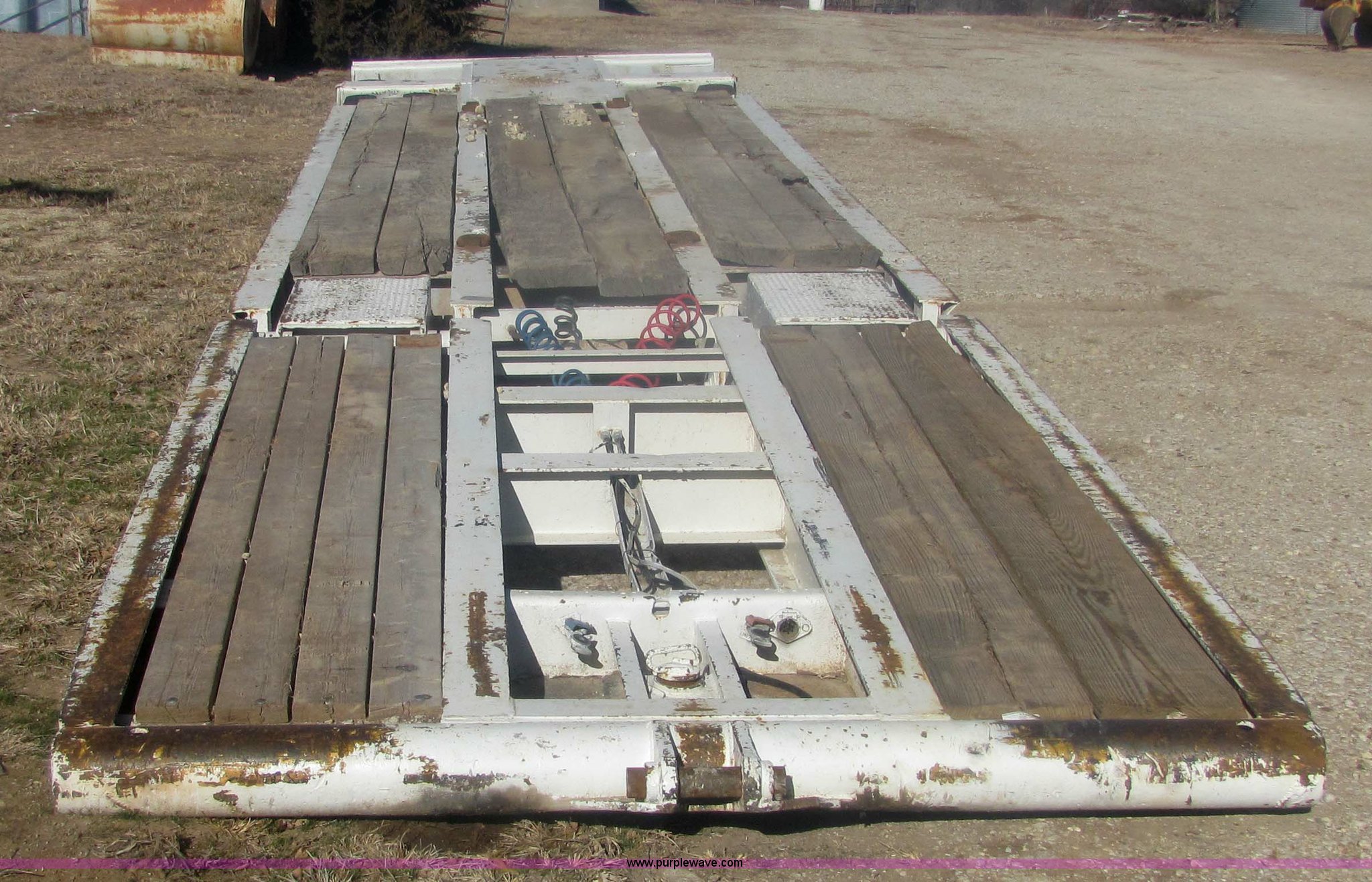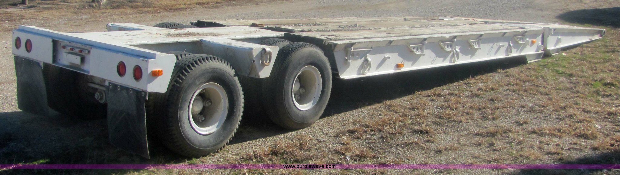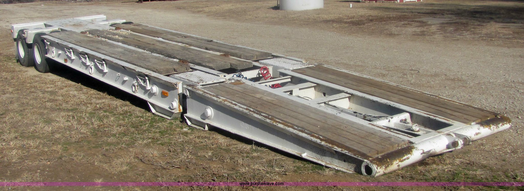 Purple Wave is selling a used Dry Van Trailer in Kansas. This item is a 1962 Hyster 40 ton equipment trailer with the following: Mechanical folding tongue, 26' deck, 94" wide, 10'6" upper deck, 10.00-15 tires
