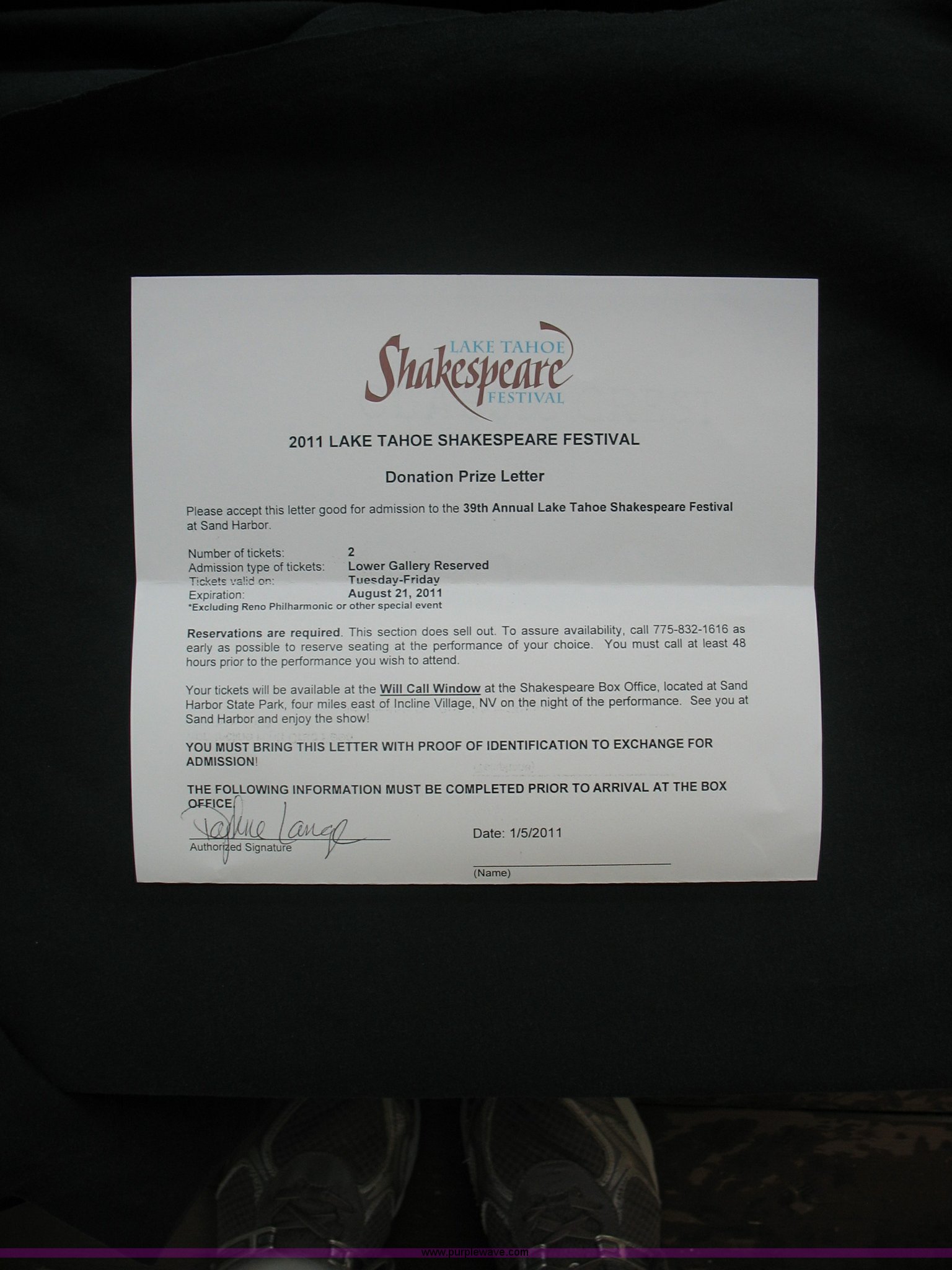 Purple Wave is selling a used Other Industrial or Business in Nevada. This item is a 2011 Lake Tahoe Shakespeare Festival with the following: 2011 Lake Tahoe Shakespeare Festival. 2 Tickets Lower Gallery Reserved seating. Tues-Fri only. Excludes Reno Philharmonic or other special event. Reservation required min 48 hours before performance. Expires 8.21.11. See certificate for restrictions. Donated by Lake Tahoe Shakespeare Festival. Purple Wave Sierra. 5853 S Carson Street. Carson City, NV 89701